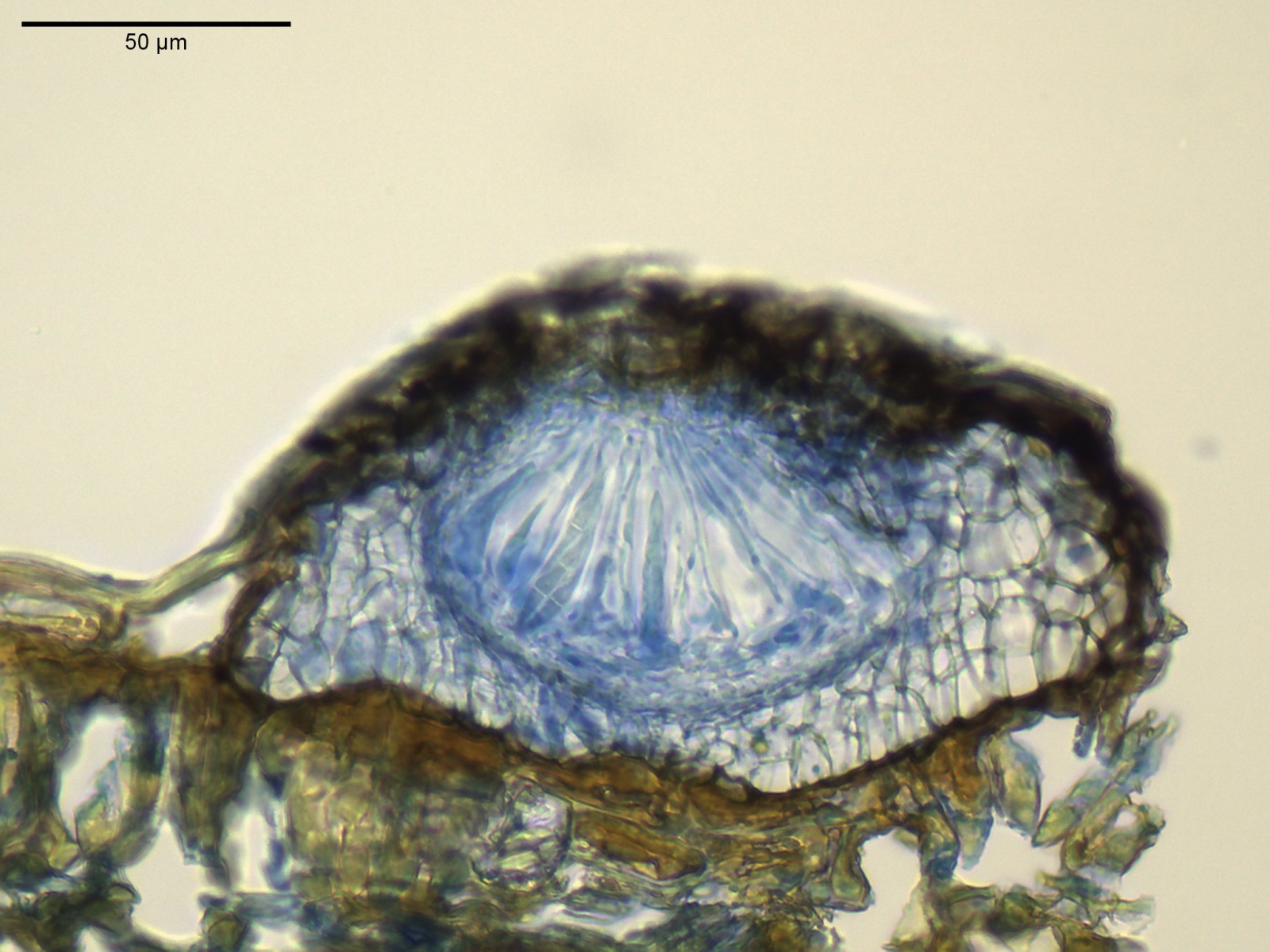 Die Jodreaktion müßte auch bei gefüllten Asci zu erkennen sein, jedoch erkennt man keinen deutlich gefärbten Apikalring, sondern nur eine dunkler gefärbte Apikalregion und die Färbung zieht sich dann dezent bis 2/3 die Sporenwand hinab.
