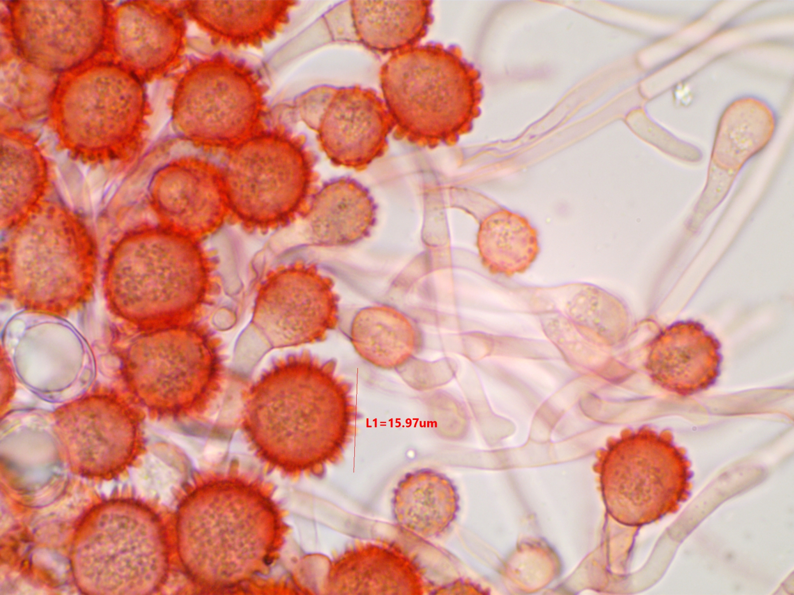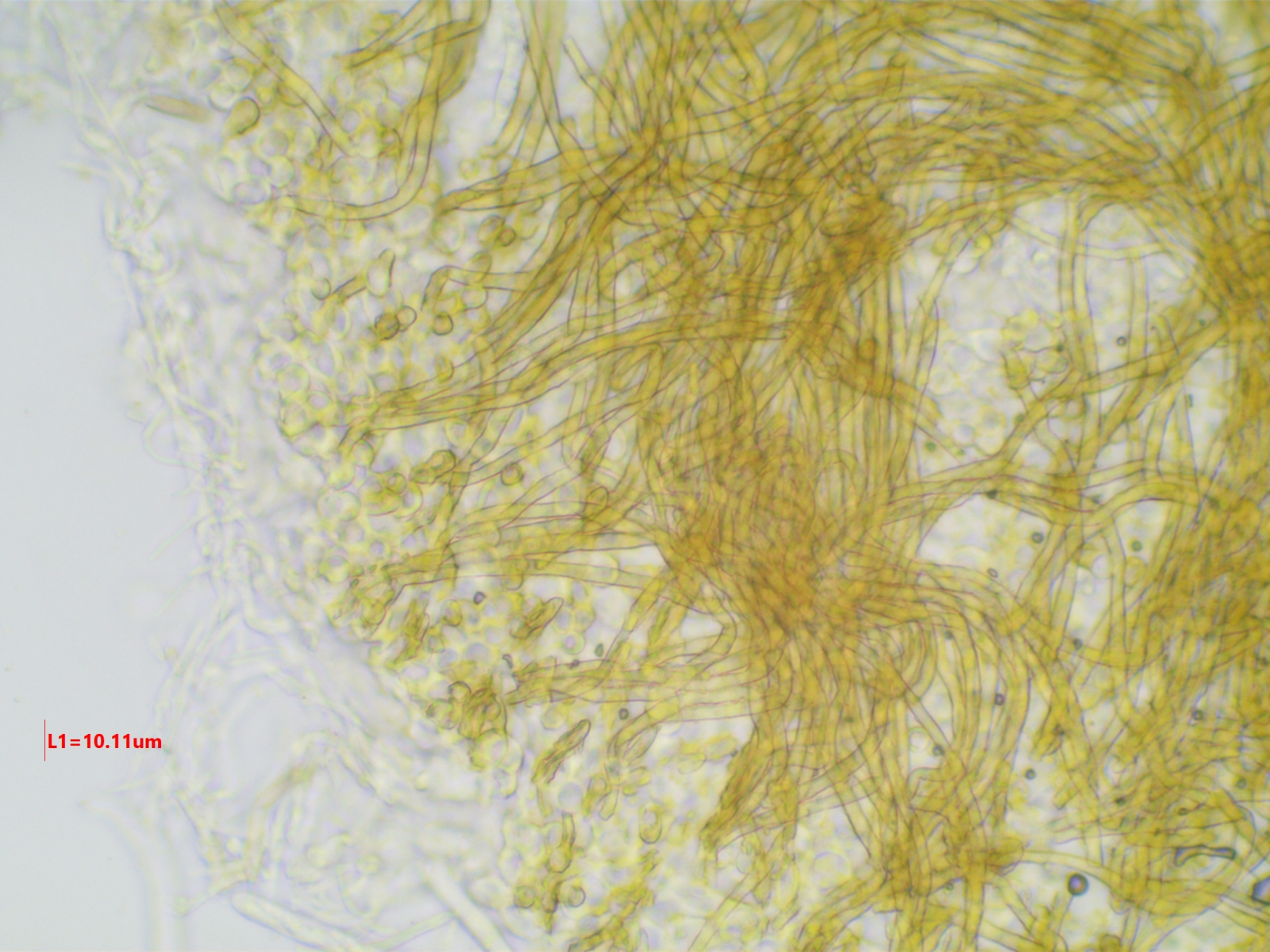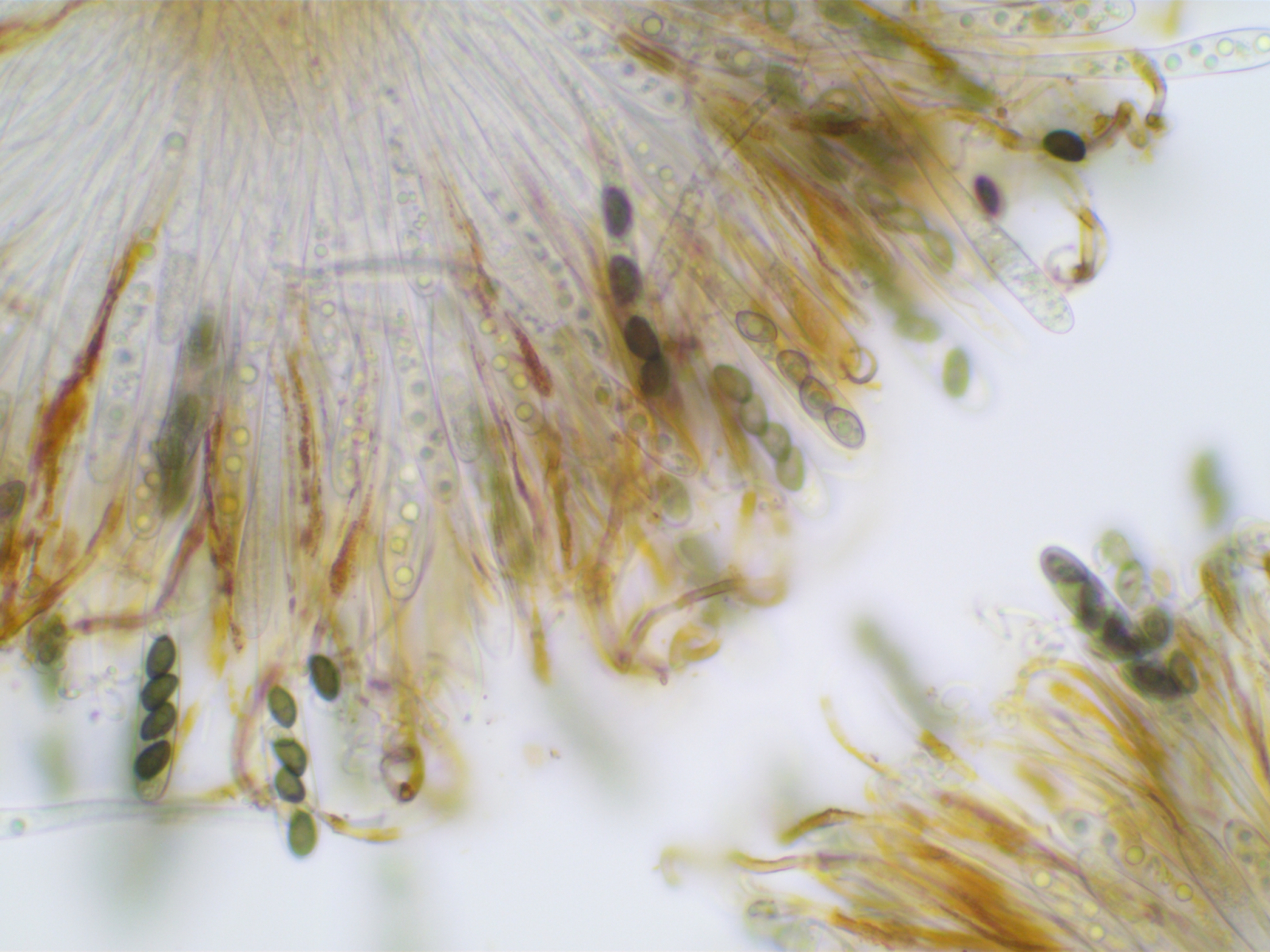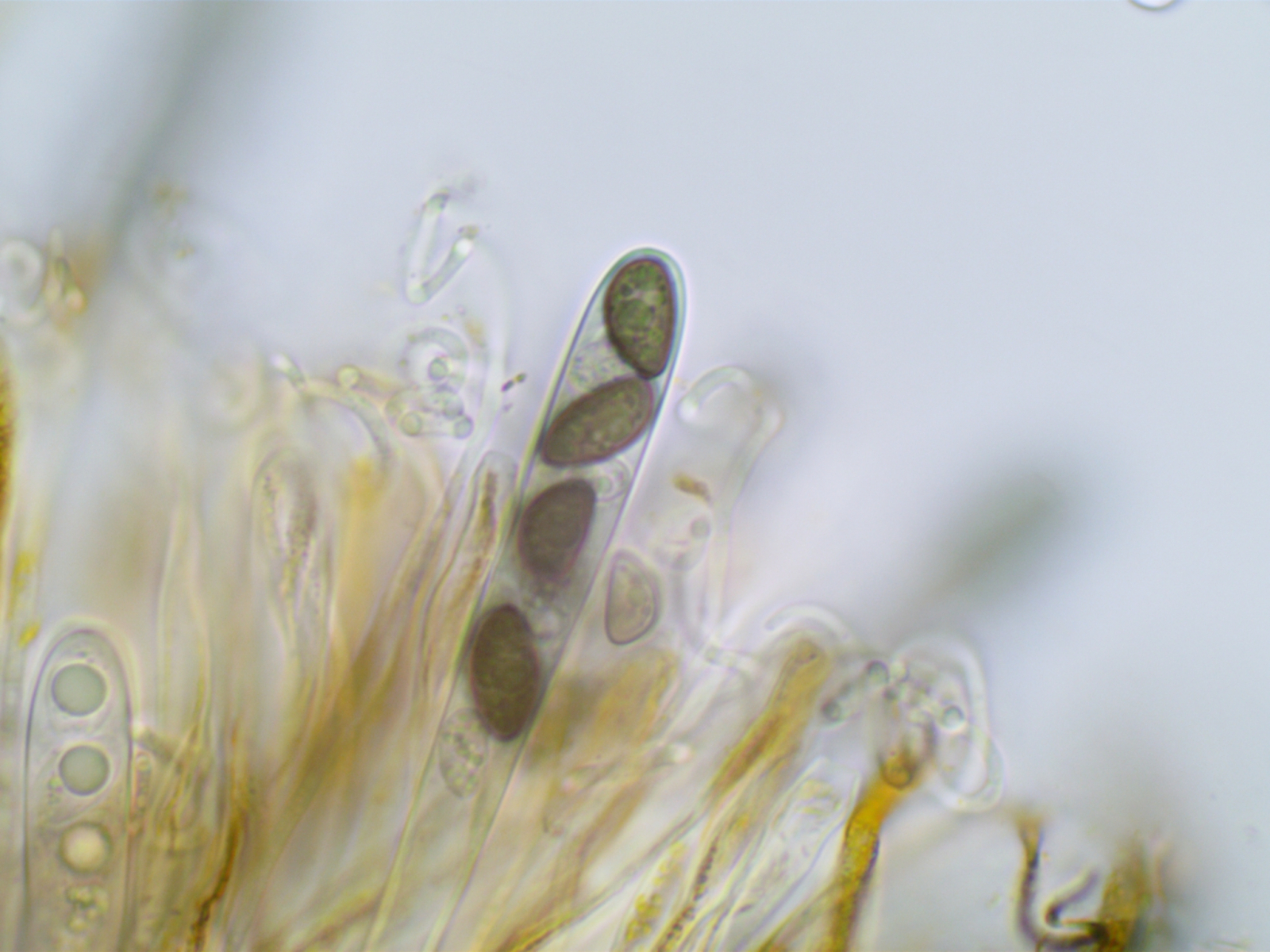 Die Sporen sind ca. 14-15x8, die Iodreaktion ist sehr undeutlich und nur bei leeren Asci zu sehen, was ja eigentlich passen würde.