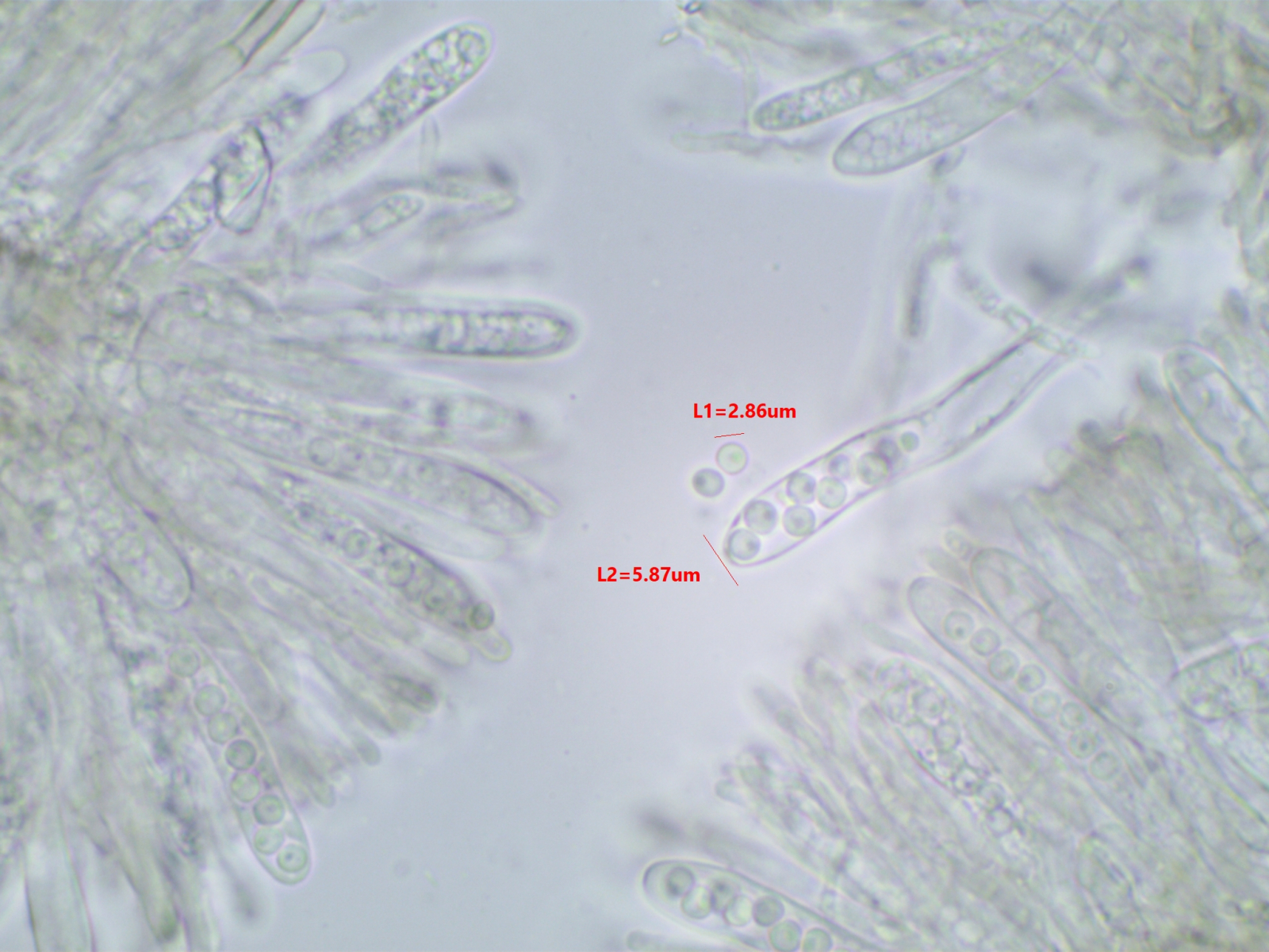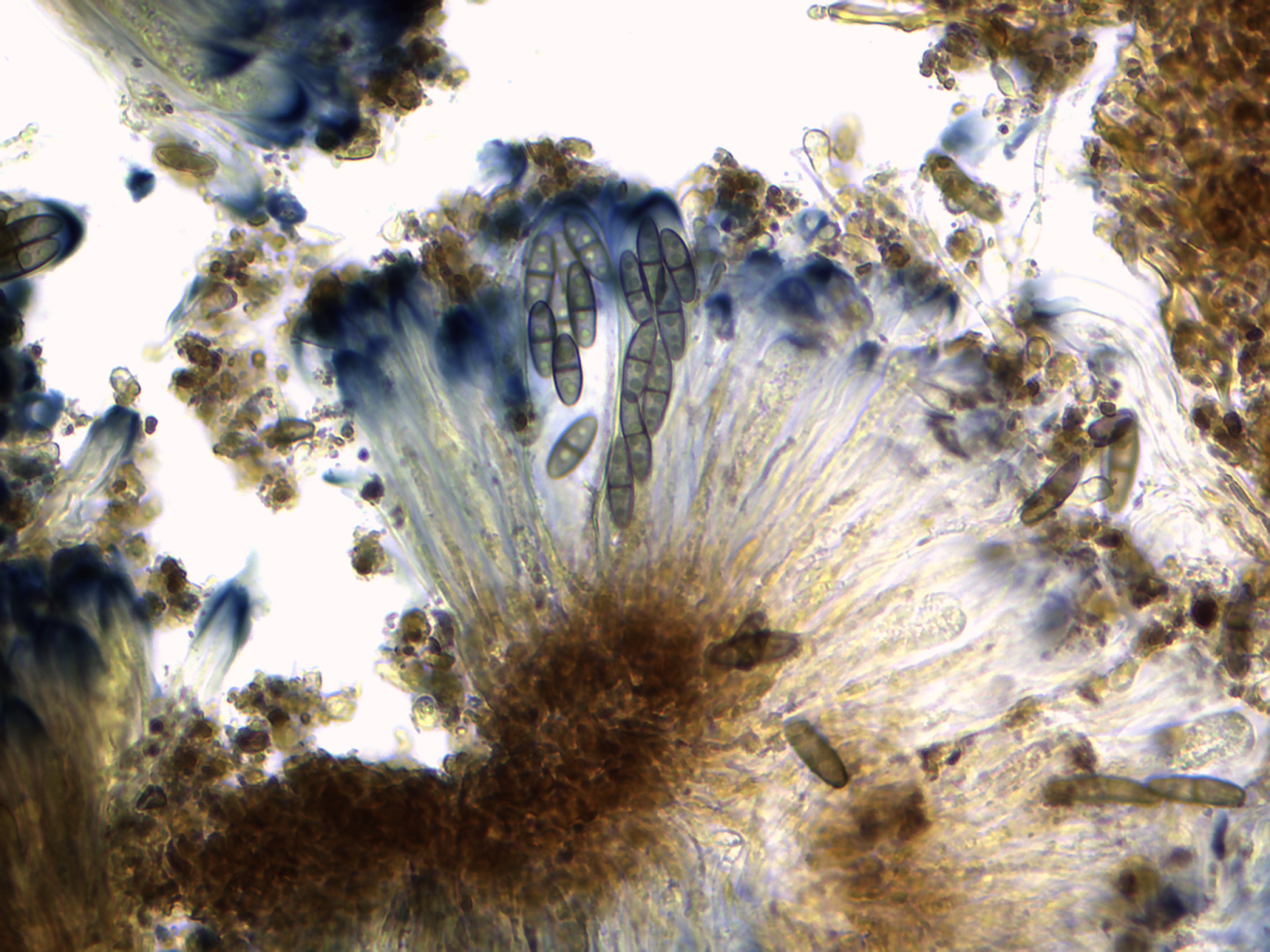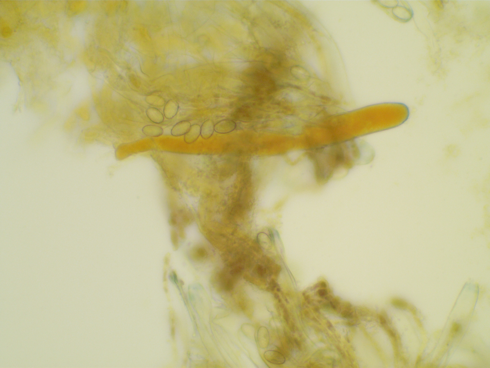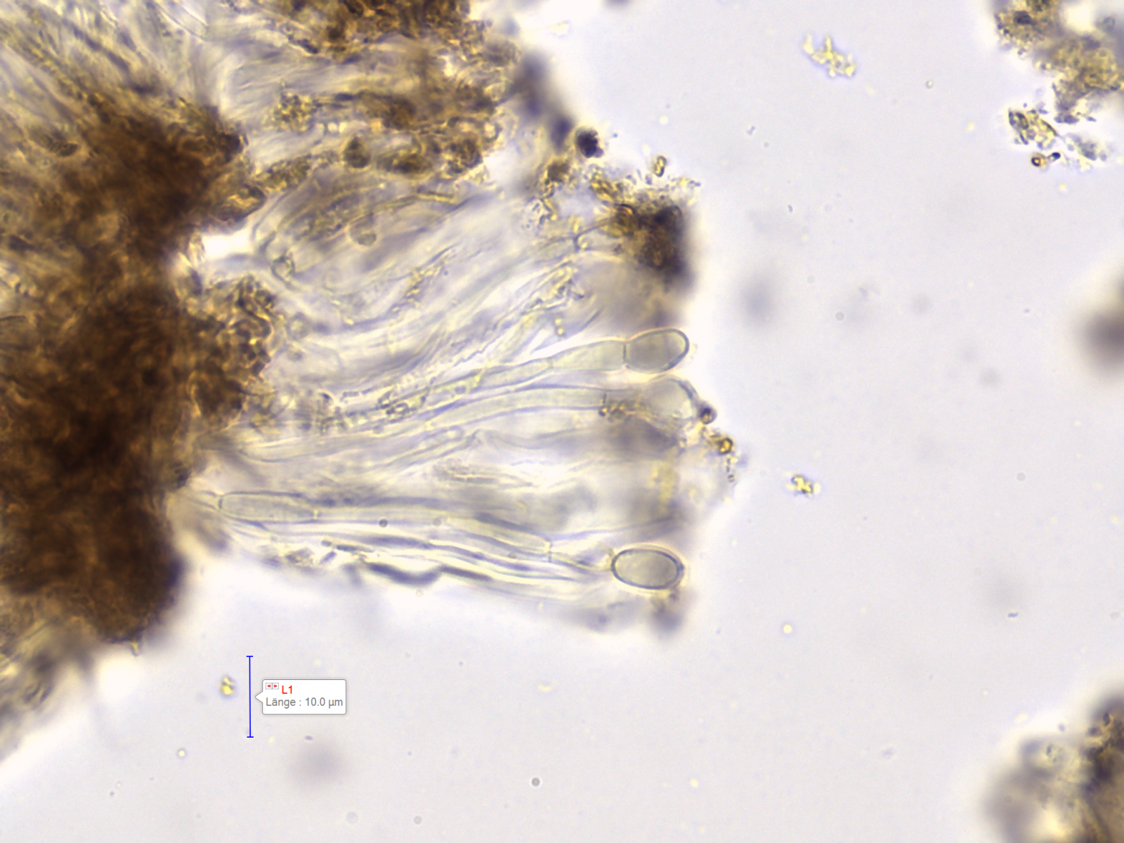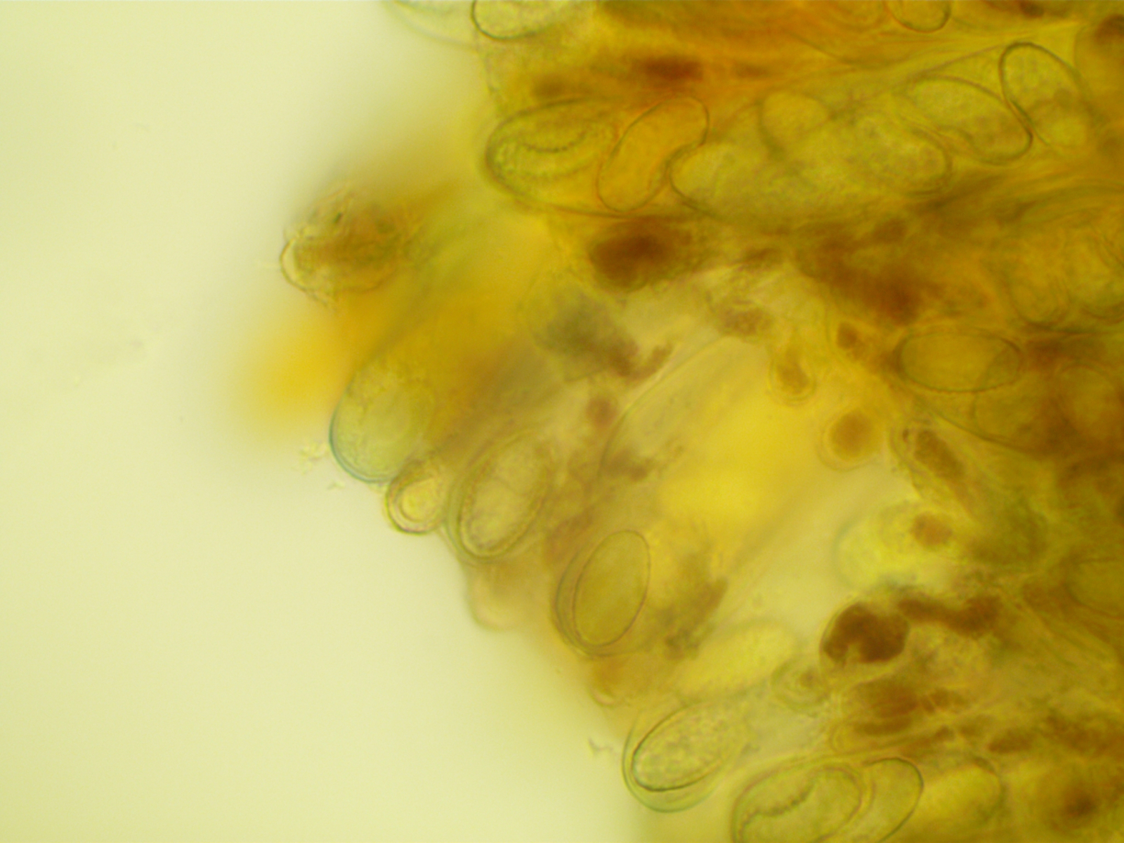 Die Sporen sind ca. 14-15x8, die Iodreaktion ist sehr undeutlich und nur bei leeren Asci zu sehen, was ja eigentlich passen würde.
