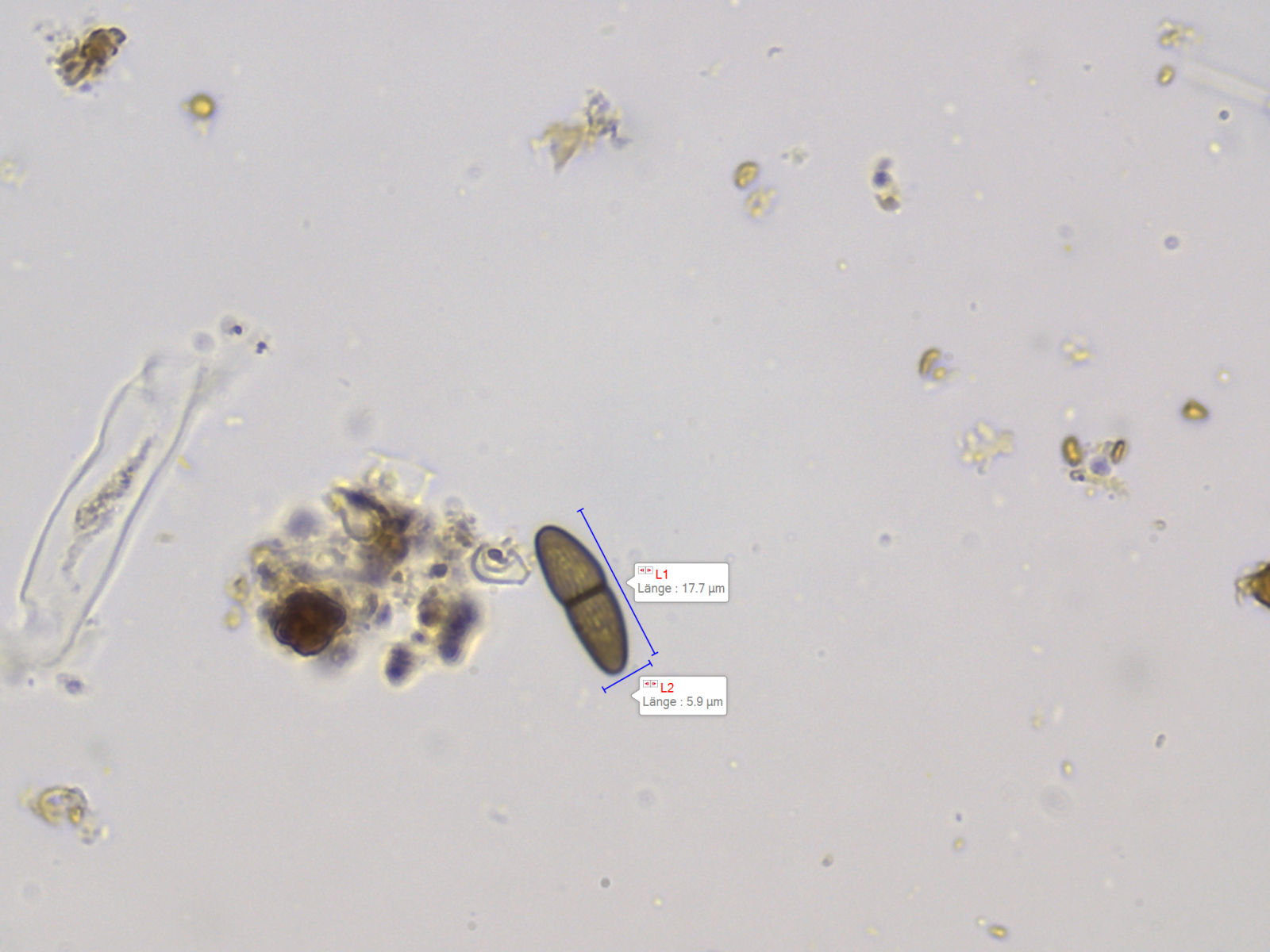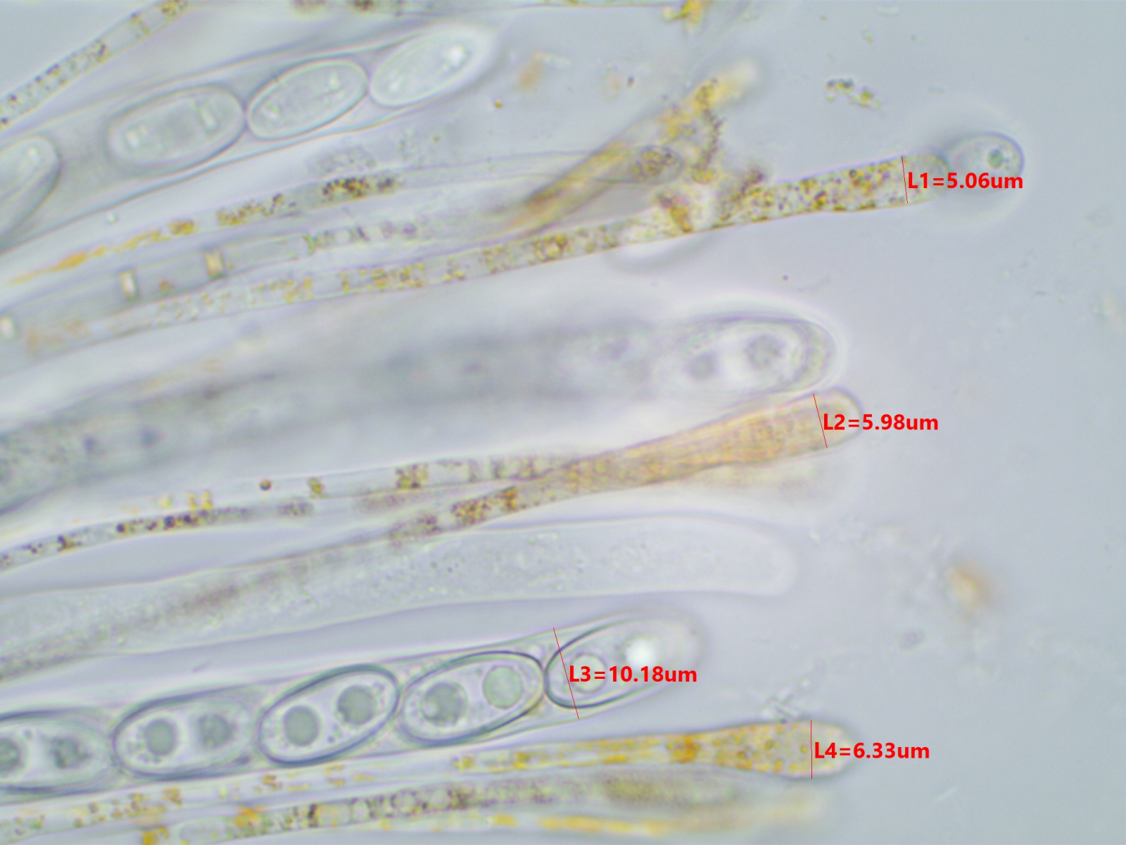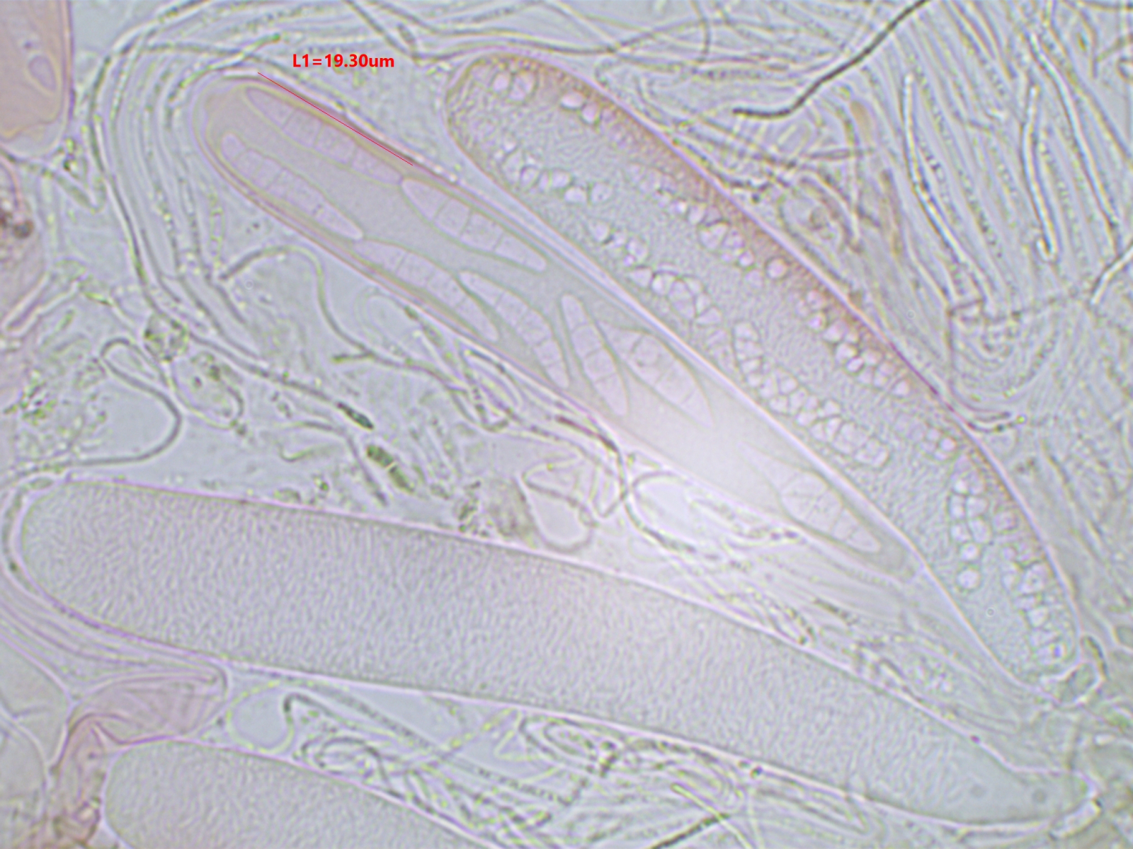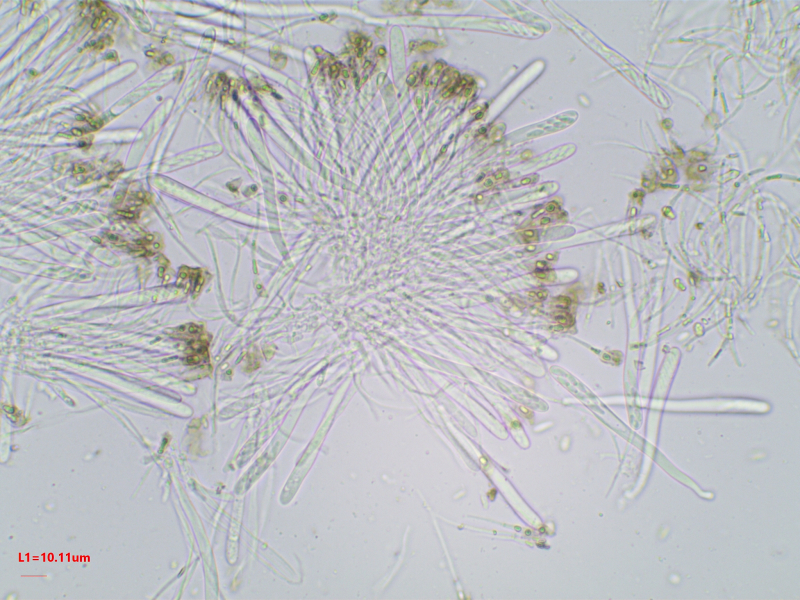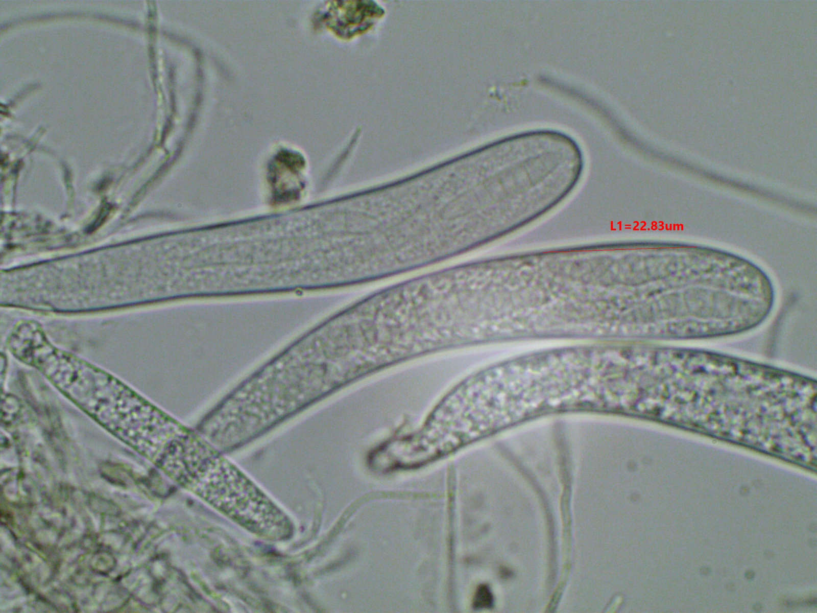 Die Sporen sind ca. 14-15x8, die Iodreaktion ist sehr undeutlich und nur bei leeren Asci zu sehen, was ja eigentlich passen würde.
