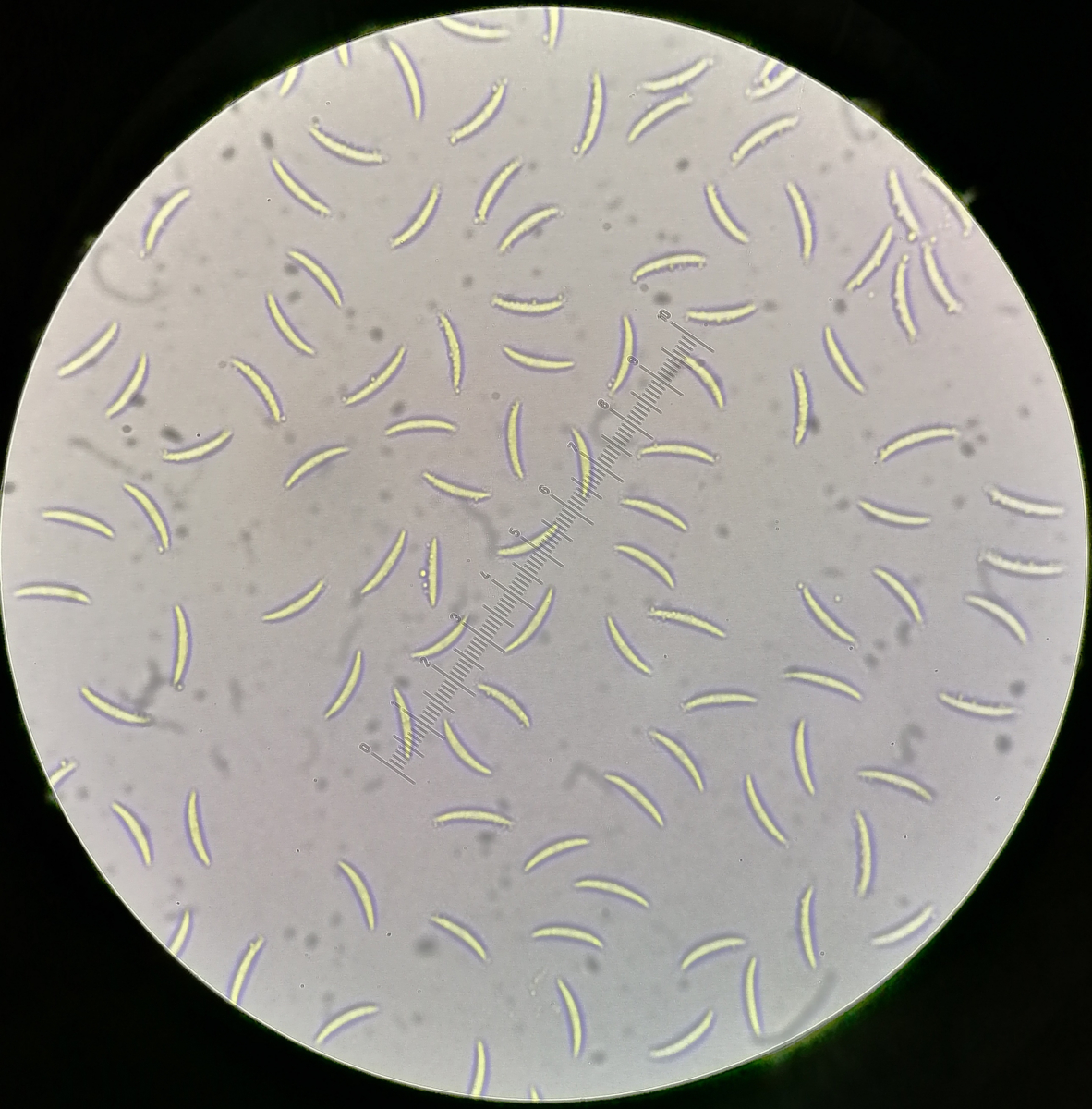 Sporen 6.9 - 7.9 - 9.0 x 1.9 - 2.2 - 2,6 µm, Q = 2.9 - 3.6 - 4.5