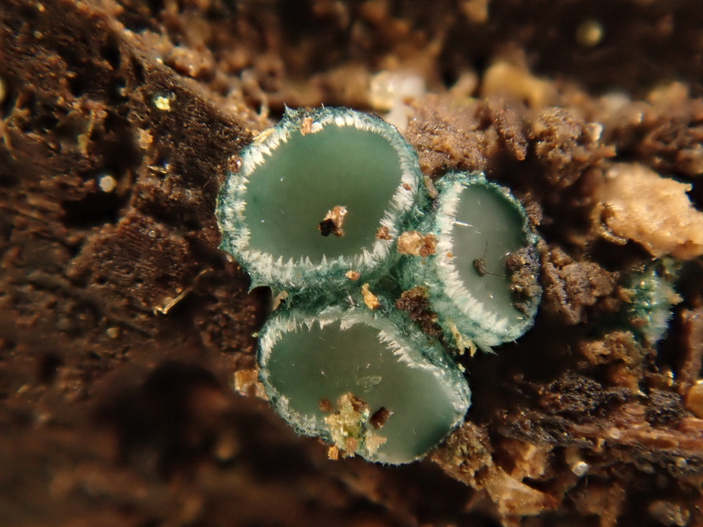 Aeruginoscyphus sericeus habe ich drei Mal gefunden, jeweils auf Eichenstümpfen. Ja, ich hätte die kleinen Dinger etwas vom Dreck befreien sollen. ![]()