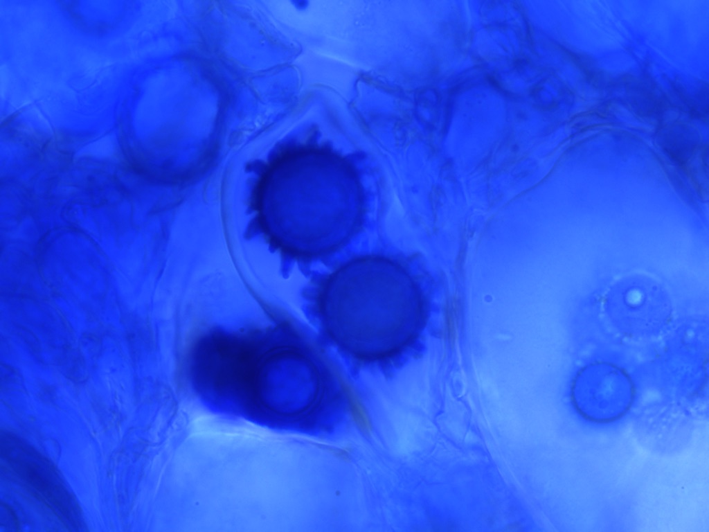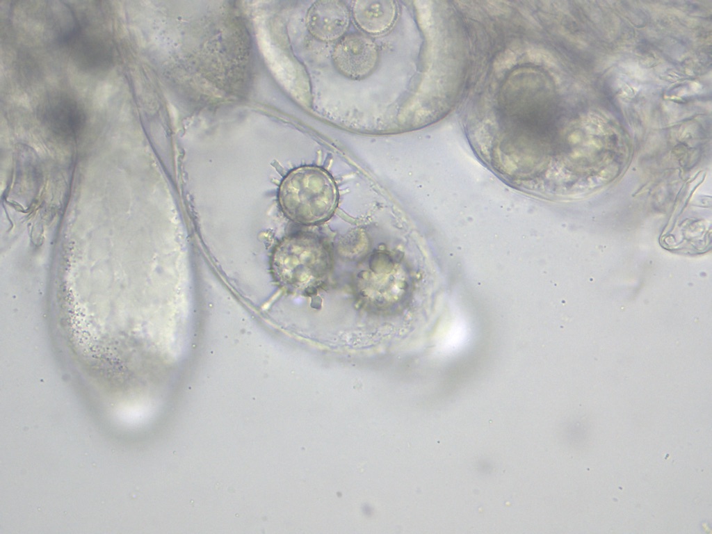 Der Pilz bildet zuerst acht Sporen, wovon im Lauf der Entwicklung aber 4 verkümmern. Sieht man auf den einen Bildern sehr schön.