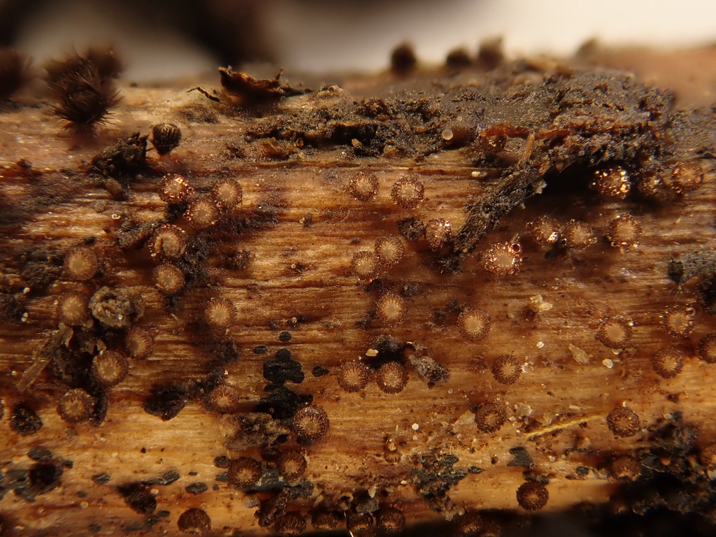 Pilidium acerinum mit Händi durchs Okular fotografiert... Dem Namen nach auf Ahorn, nach Lit. aber auch auf anderem Laub. Hier auf Buche. Bestimmt mit Ellis&Ellis.