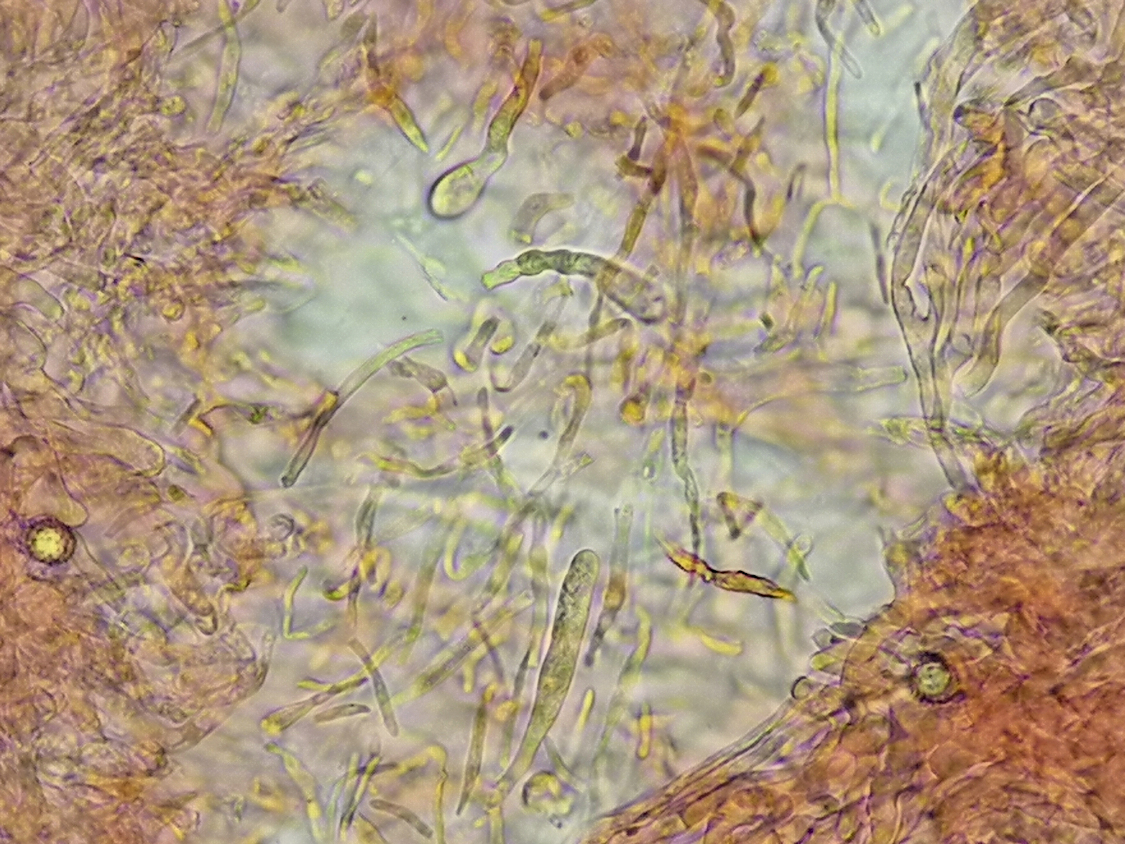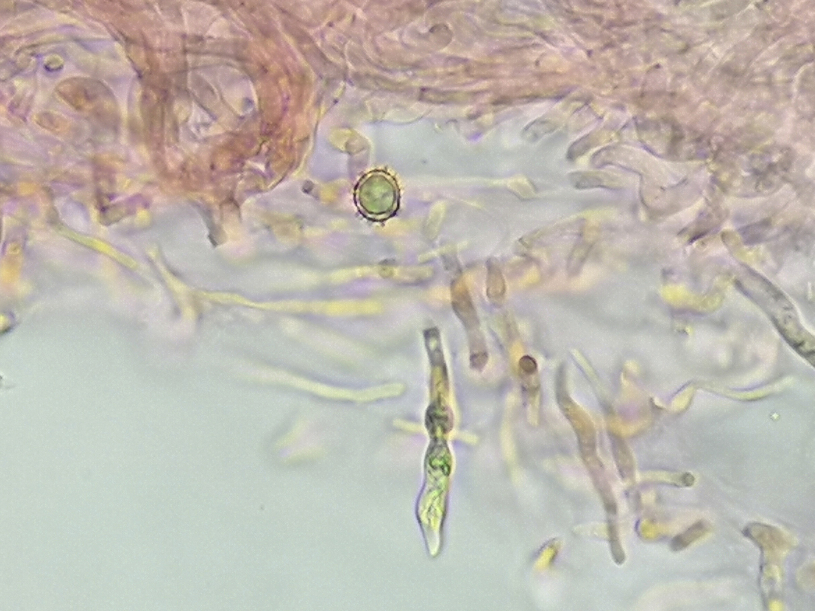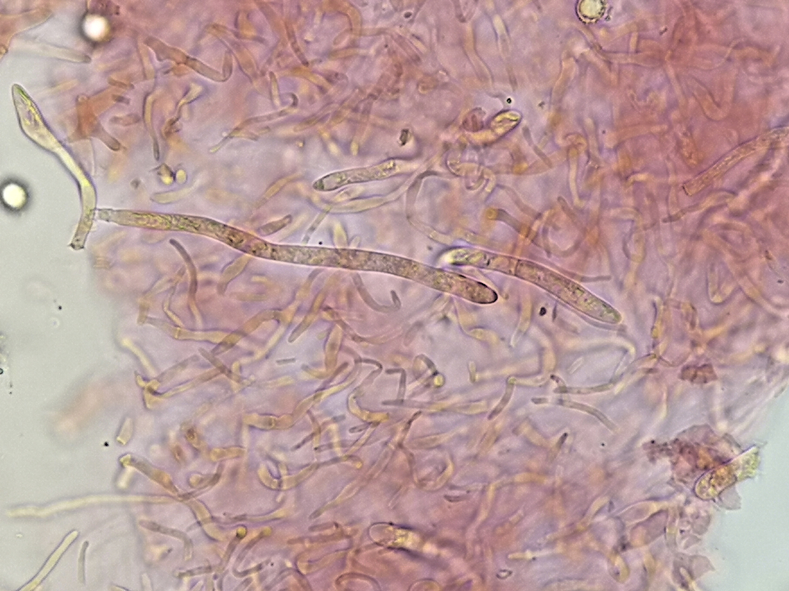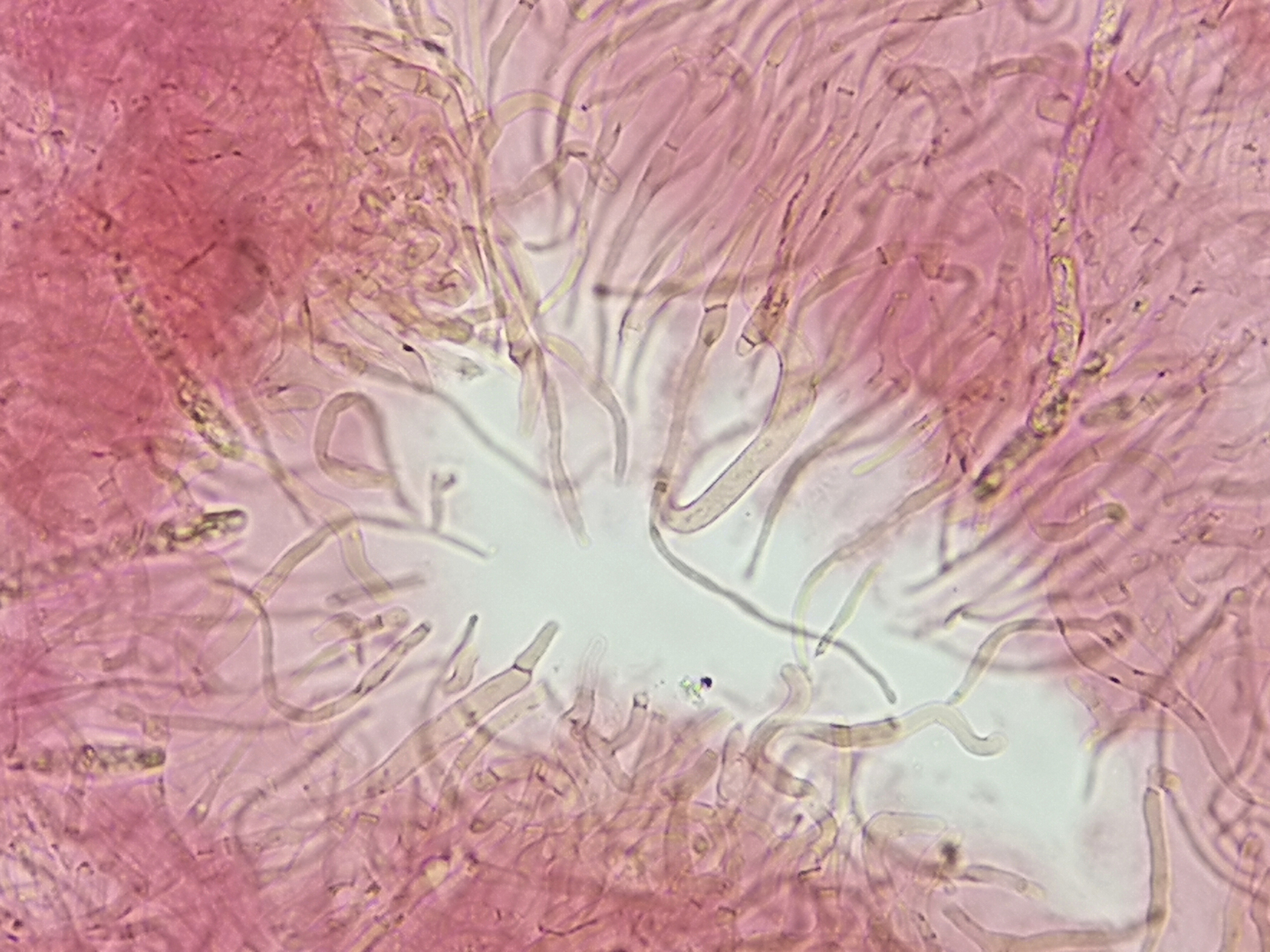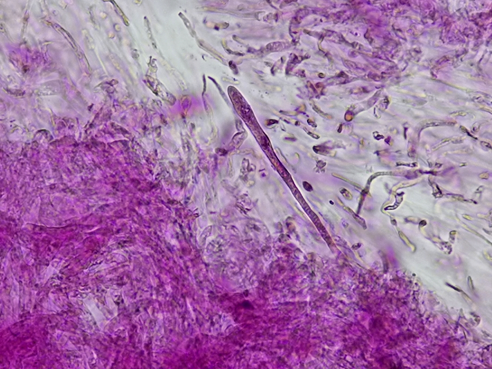 Sozusagen ein Zwischending mit zylindrischen, spindelig, keuligen, eingeschnürten, kopfigen UND teils inkrustierten Dermatozystiden.