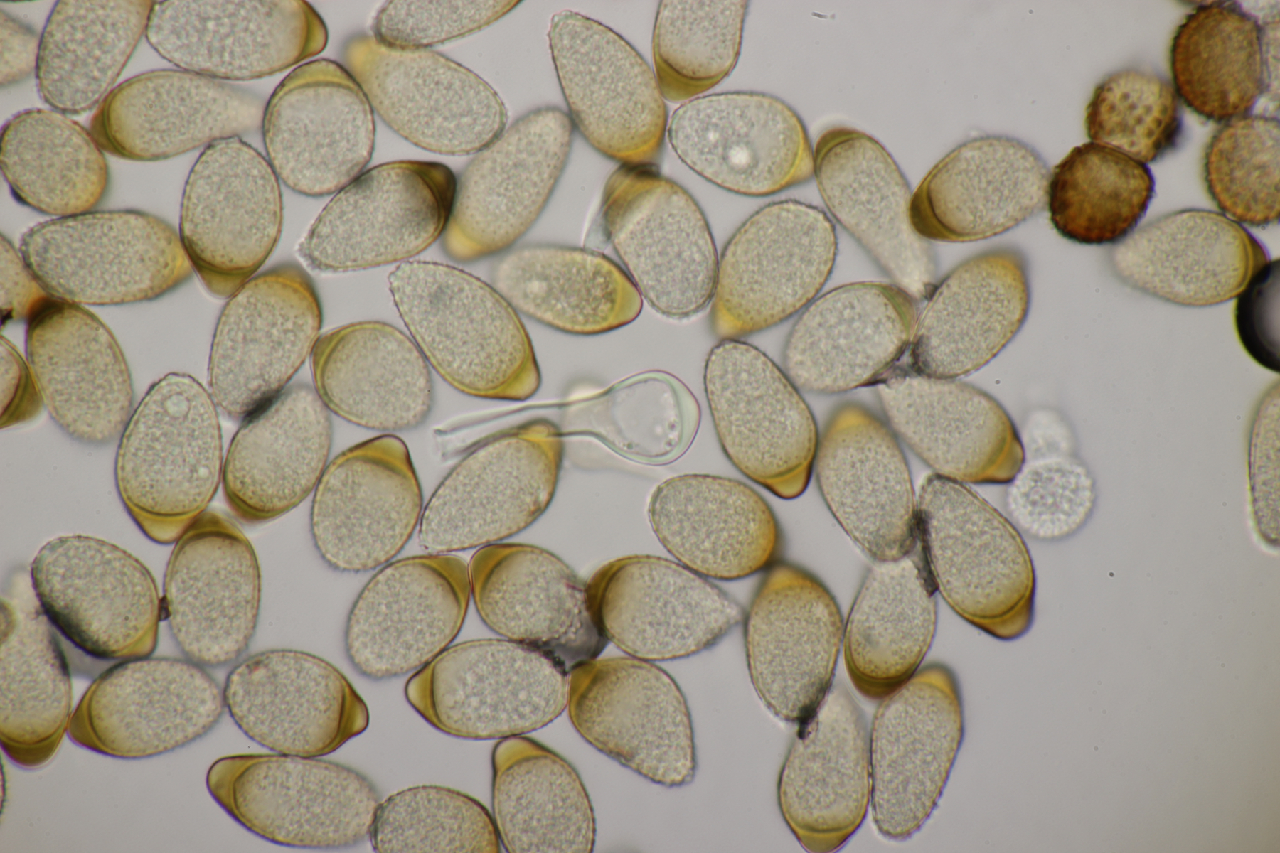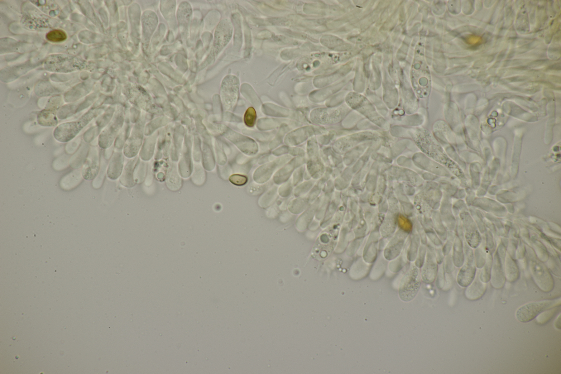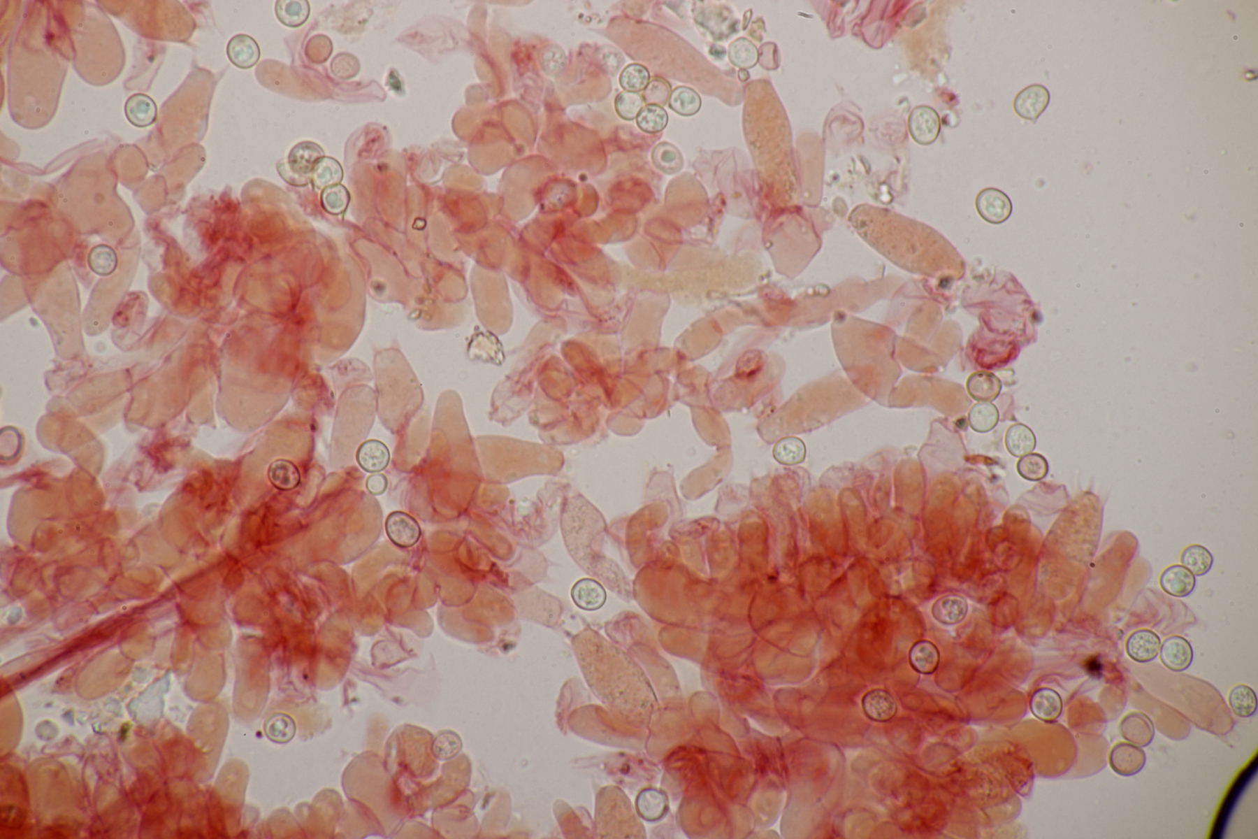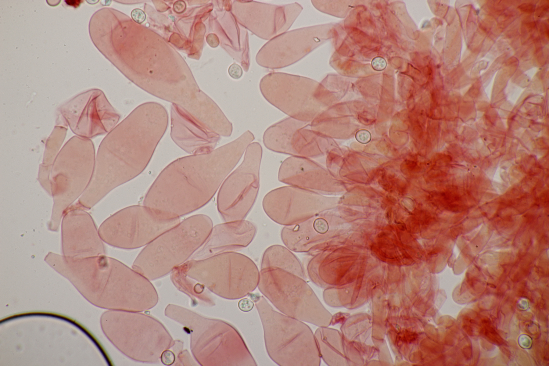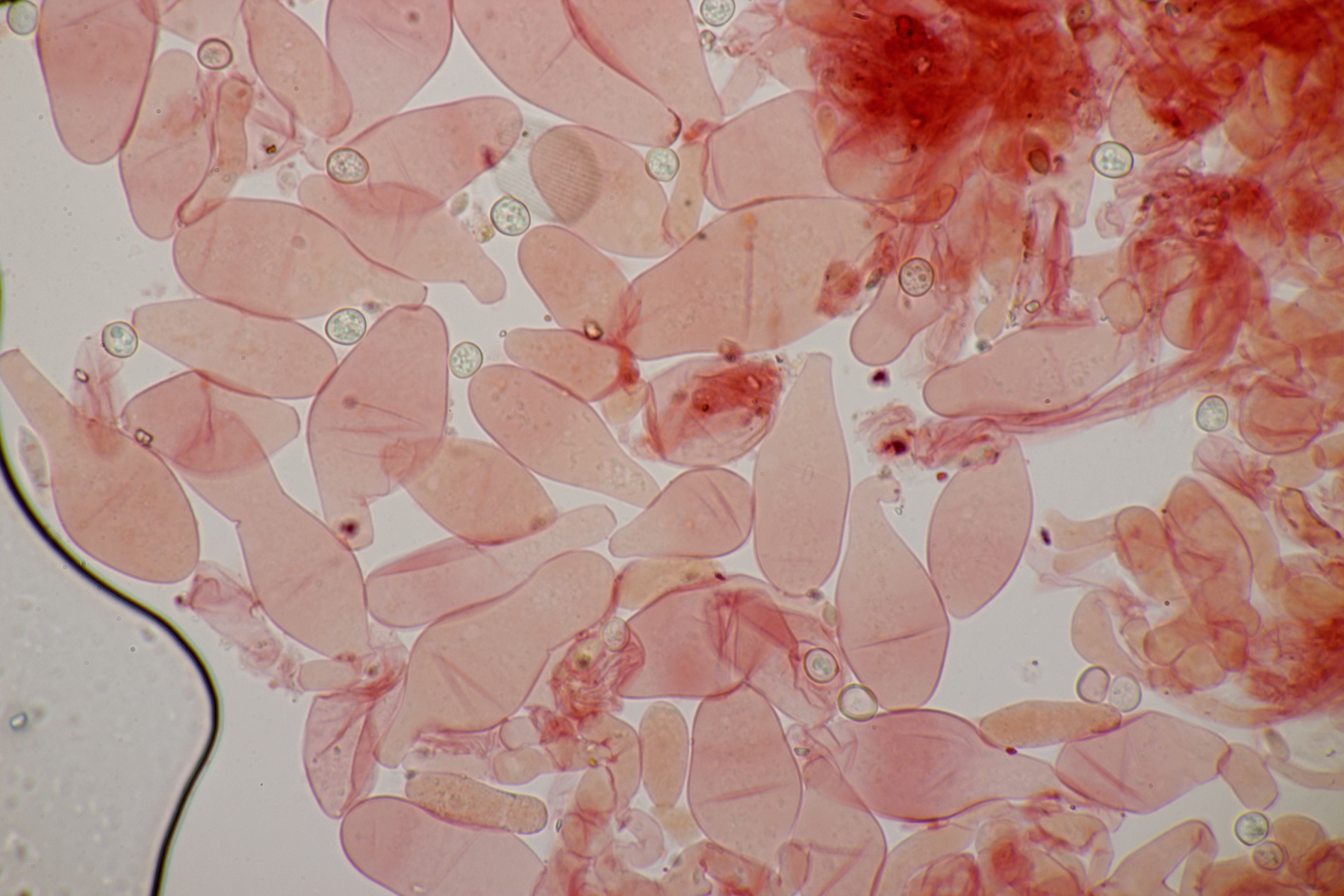 3. Ein Pluteus so ähnlich wie Thorbens Fund letztens. Die Sporen messen (5.9+-0.5) µm x (5.2+-0.3) µm, Q=1.1+-0.1, bzw. (5.2-6.7) x (4.8-5.7), Q=1.0-1.3. Die Zystiden würde ich überwiegend für sackförmig halten, womit ich bei Pluteus pallescens rauskäme.