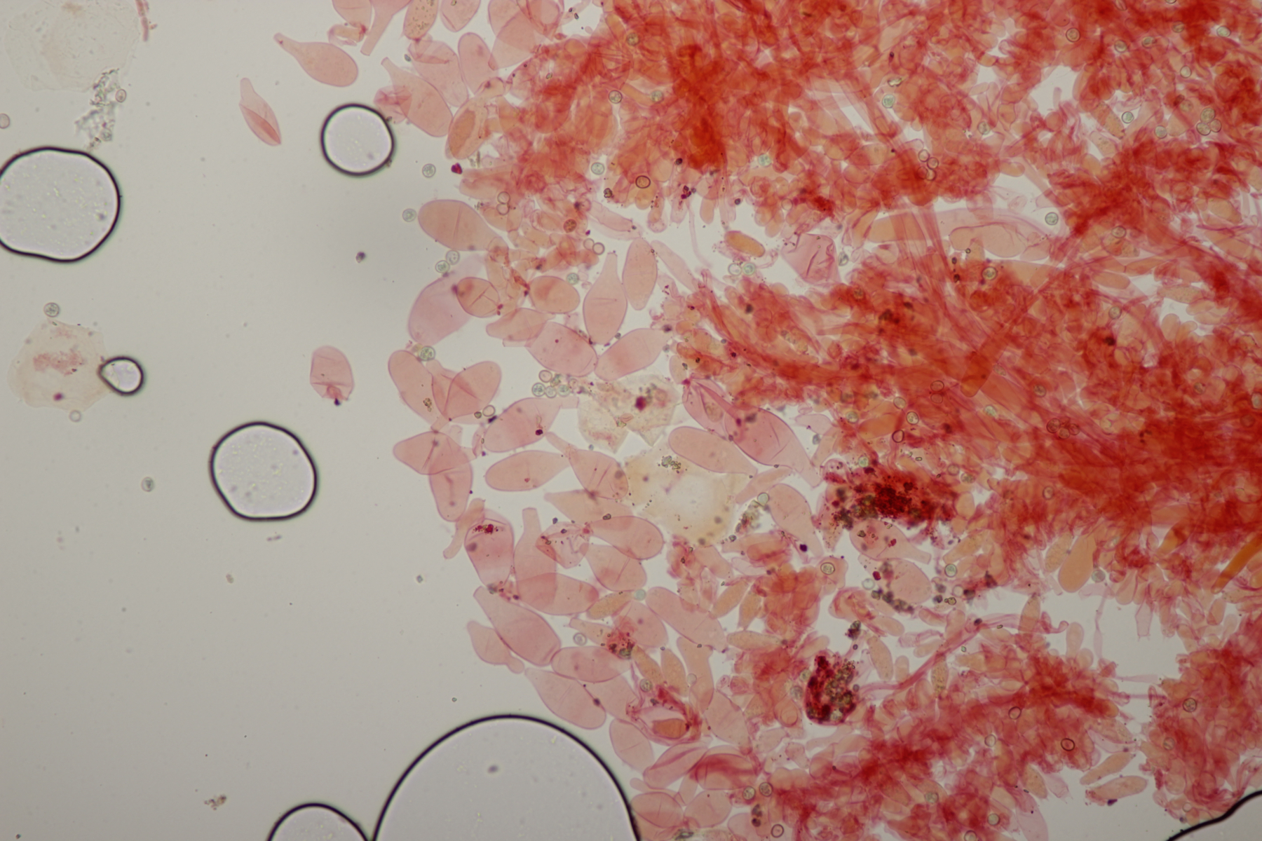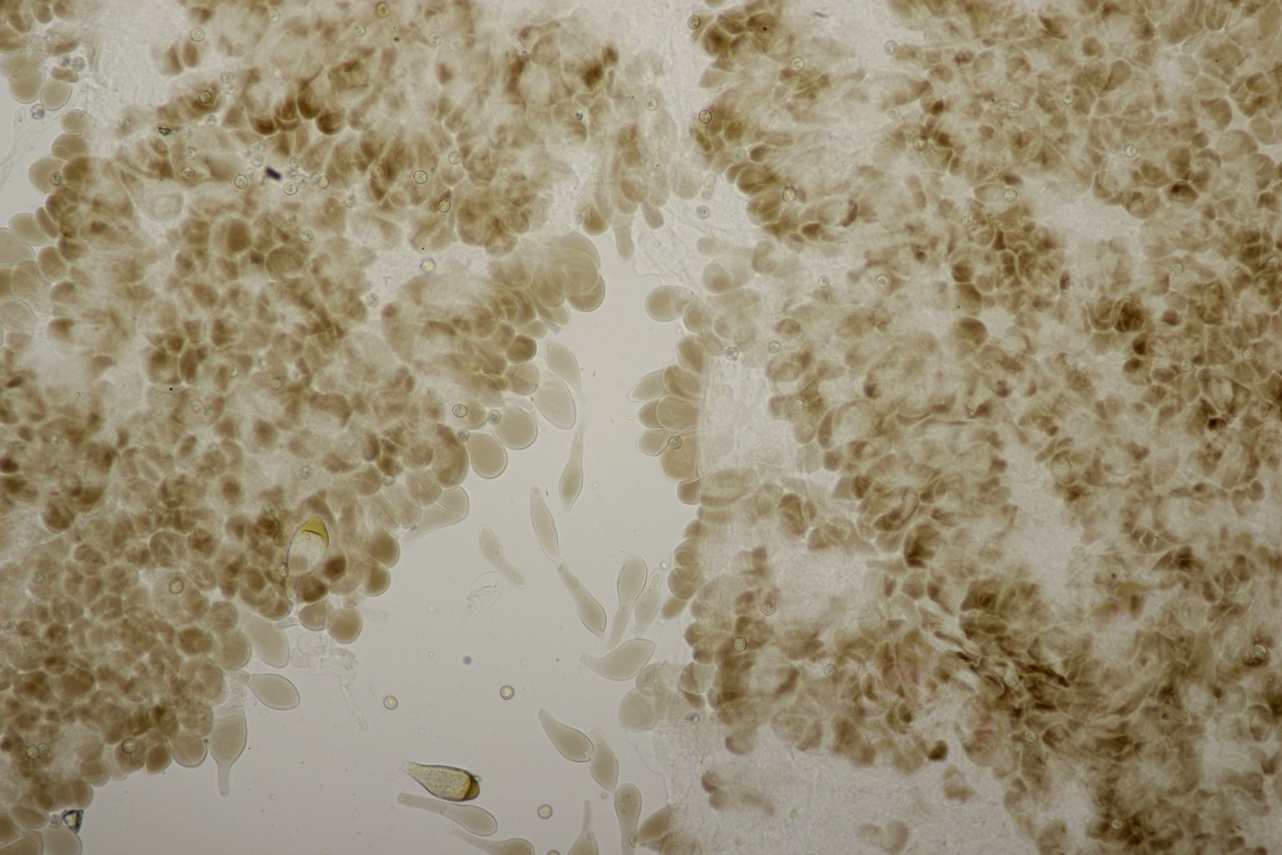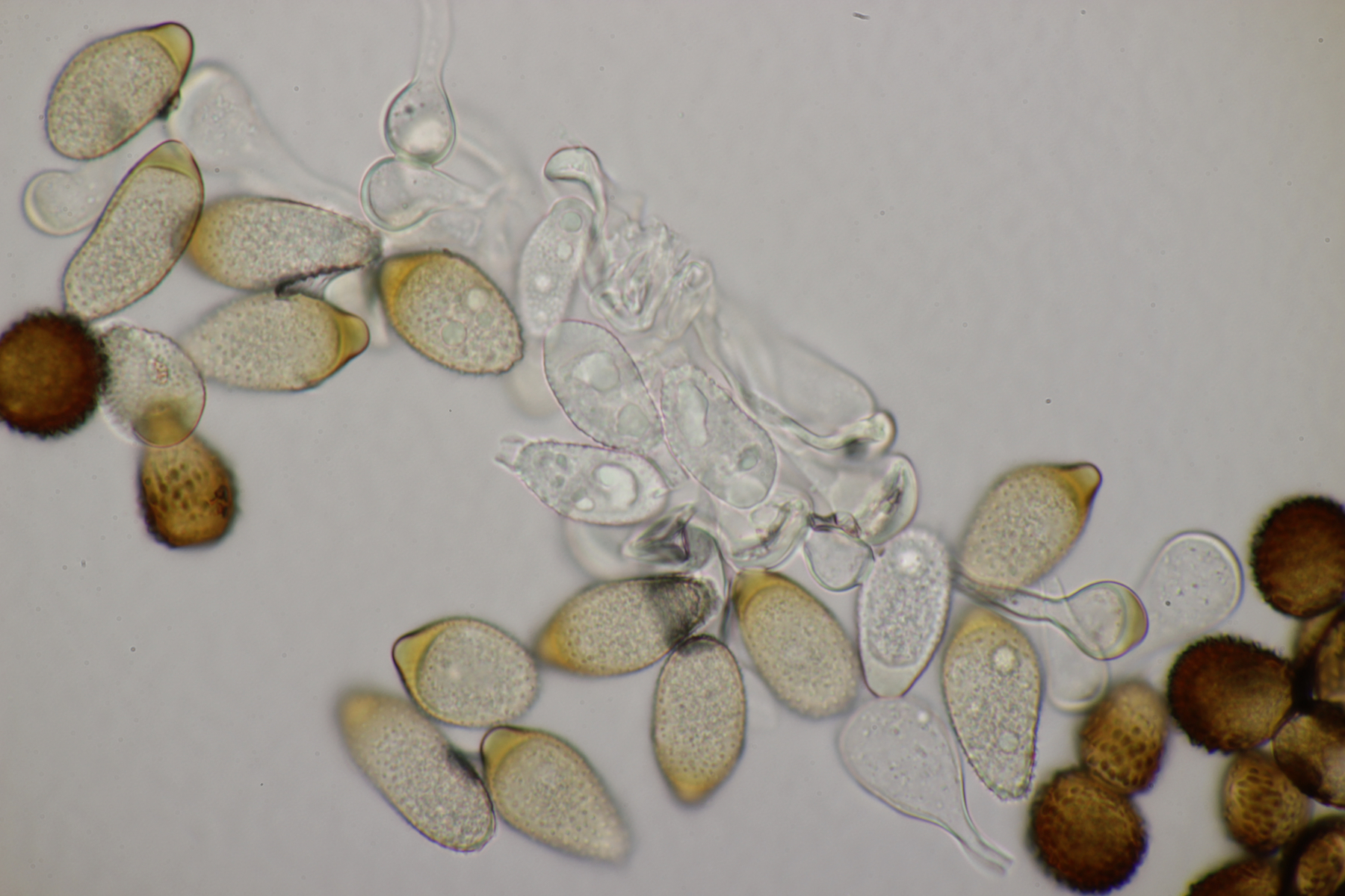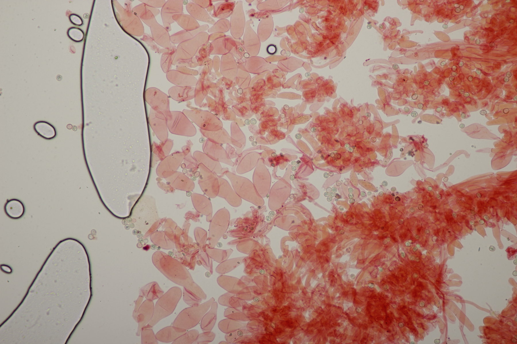 3. Ein Pluteus so ähnlich wie Thorbens Fund letztens. Die Sporen messen (5.9+-0.5) µm x (5.2+-0.3) µm, Q=1.1+-0.1, bzw. (5.2-6.7) x (4.8-5.7), Q=1.0-1.3. Die Zystiden würde ich überwiegend für sackförmig halten, womit ich bei Pluteus pallescens rauskäme.