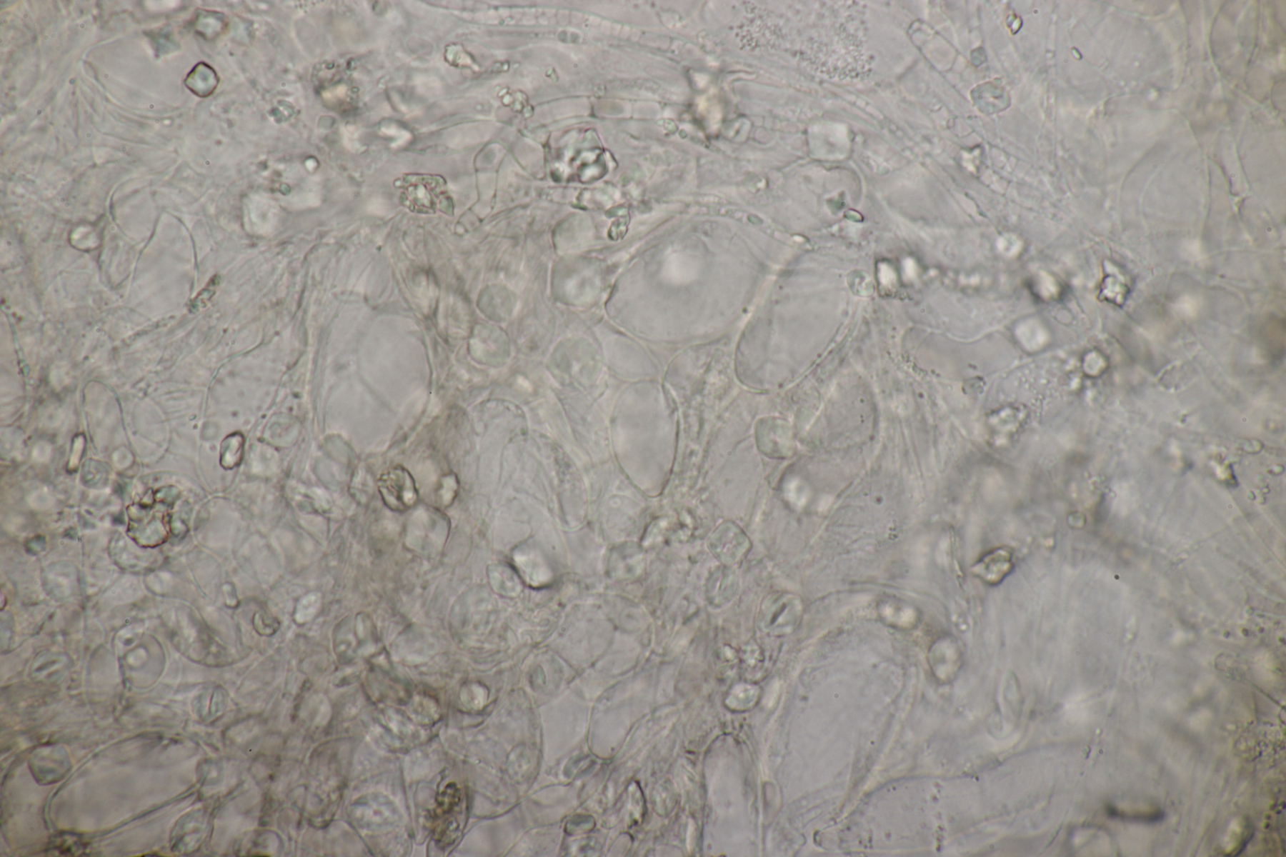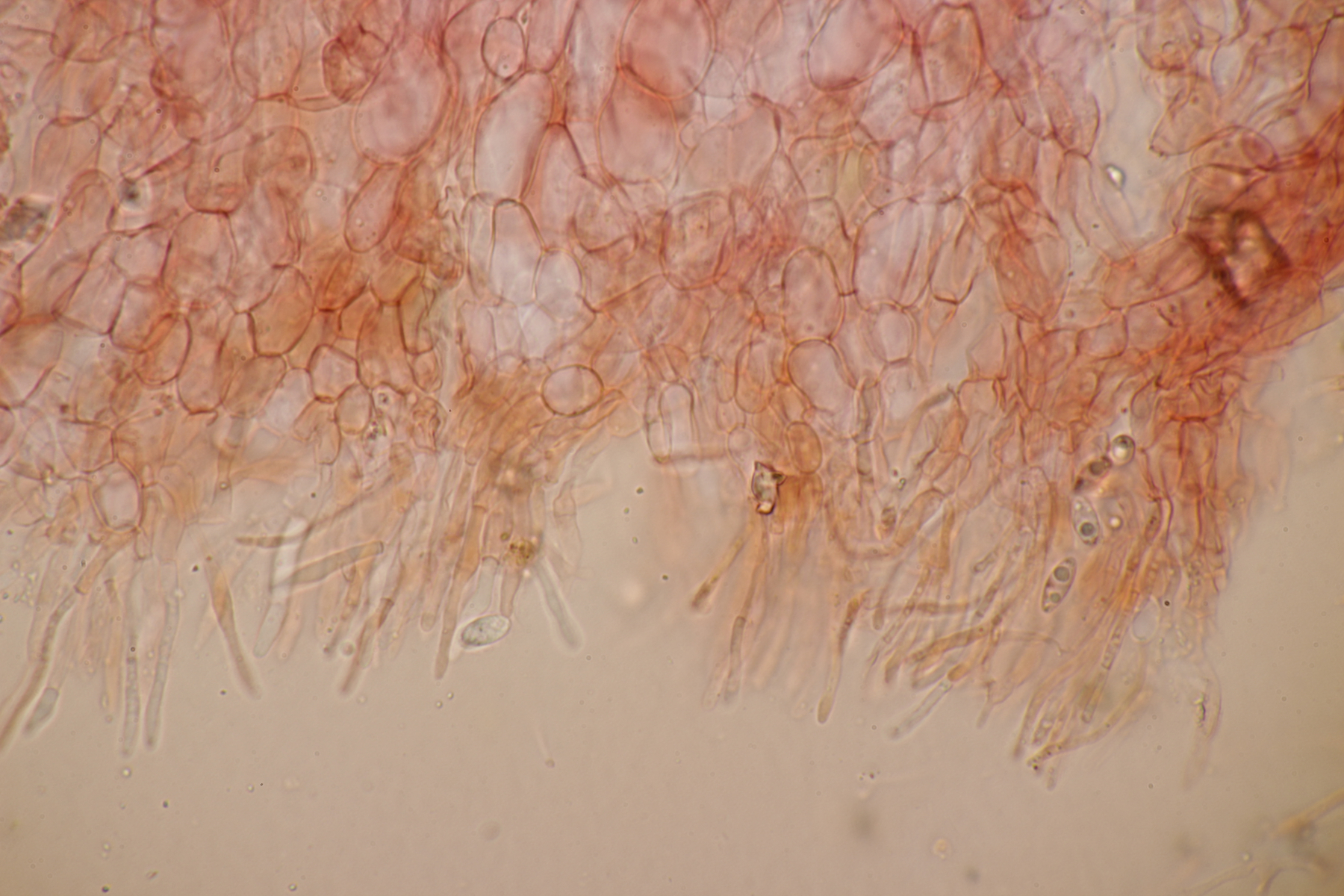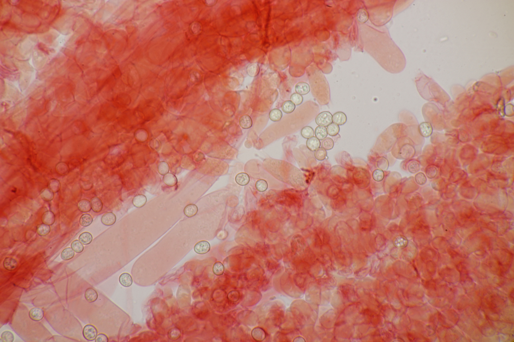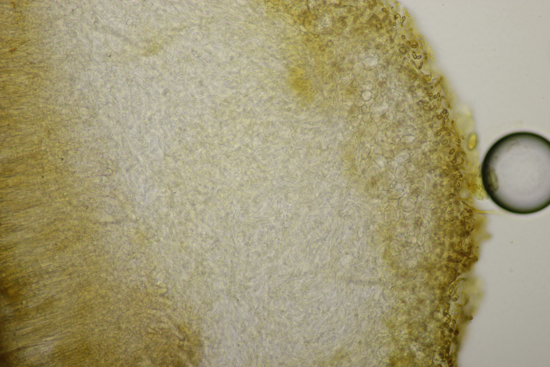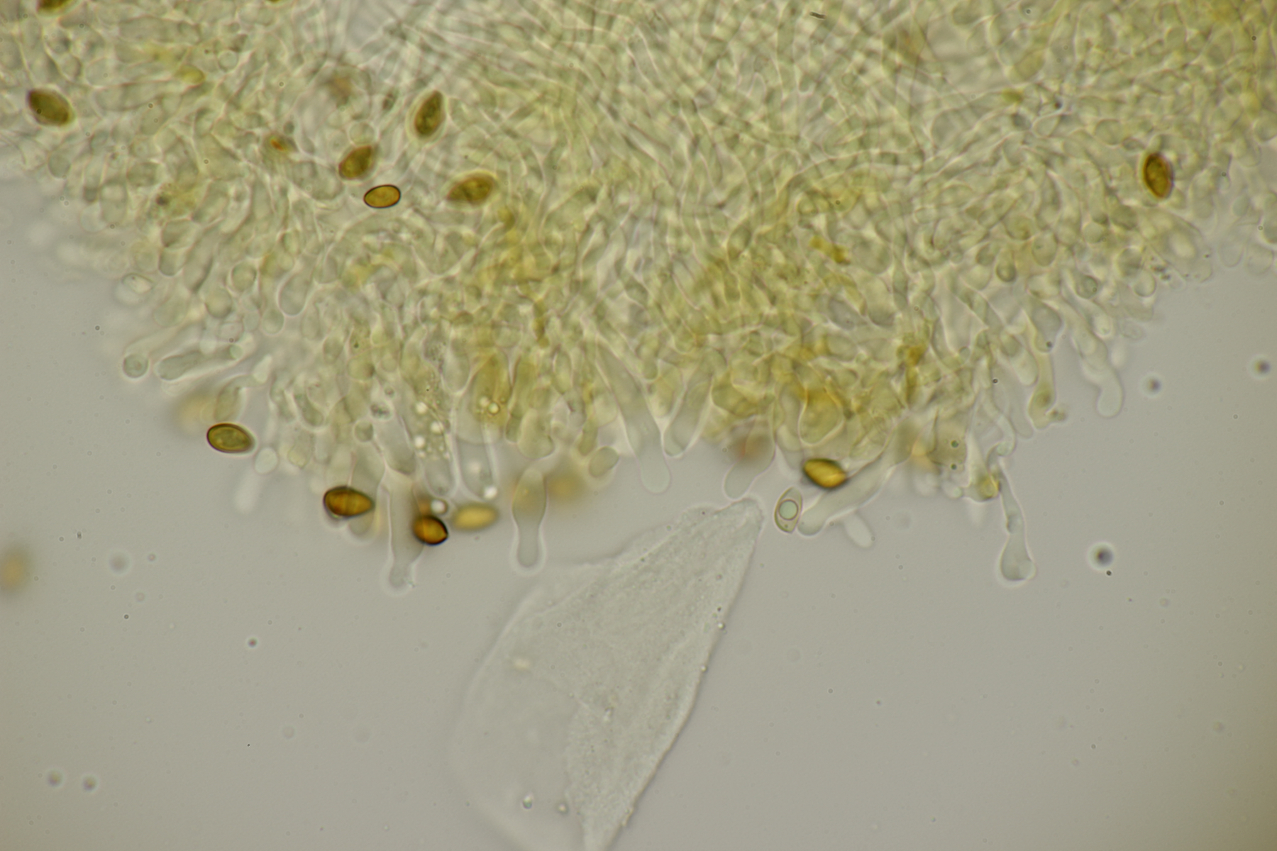 3. Ein Pluteus so ähnlich wie Thorbens Fund letztens. Die Sporen messen (5.9+-0.5) µm x (5.2+-0.3) µm, Q=1.1+-0.1, bzw. (5.2-6.7) x (4.8-5.7), Q=1.0-1.3. Die Zystiden würde ich überwiegend für sackförmig halten, womit ich bei Pluteus pallescens rauskäme.