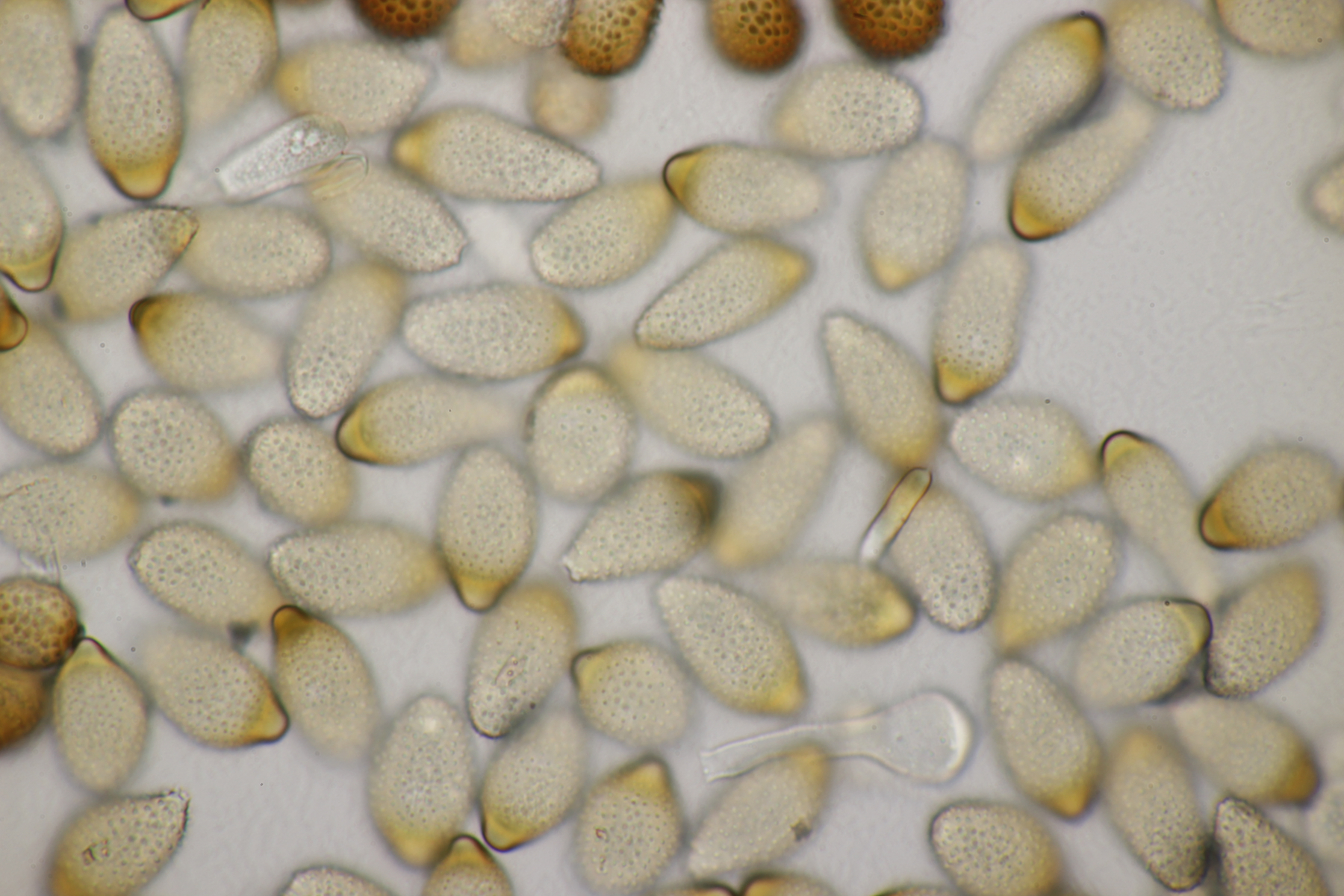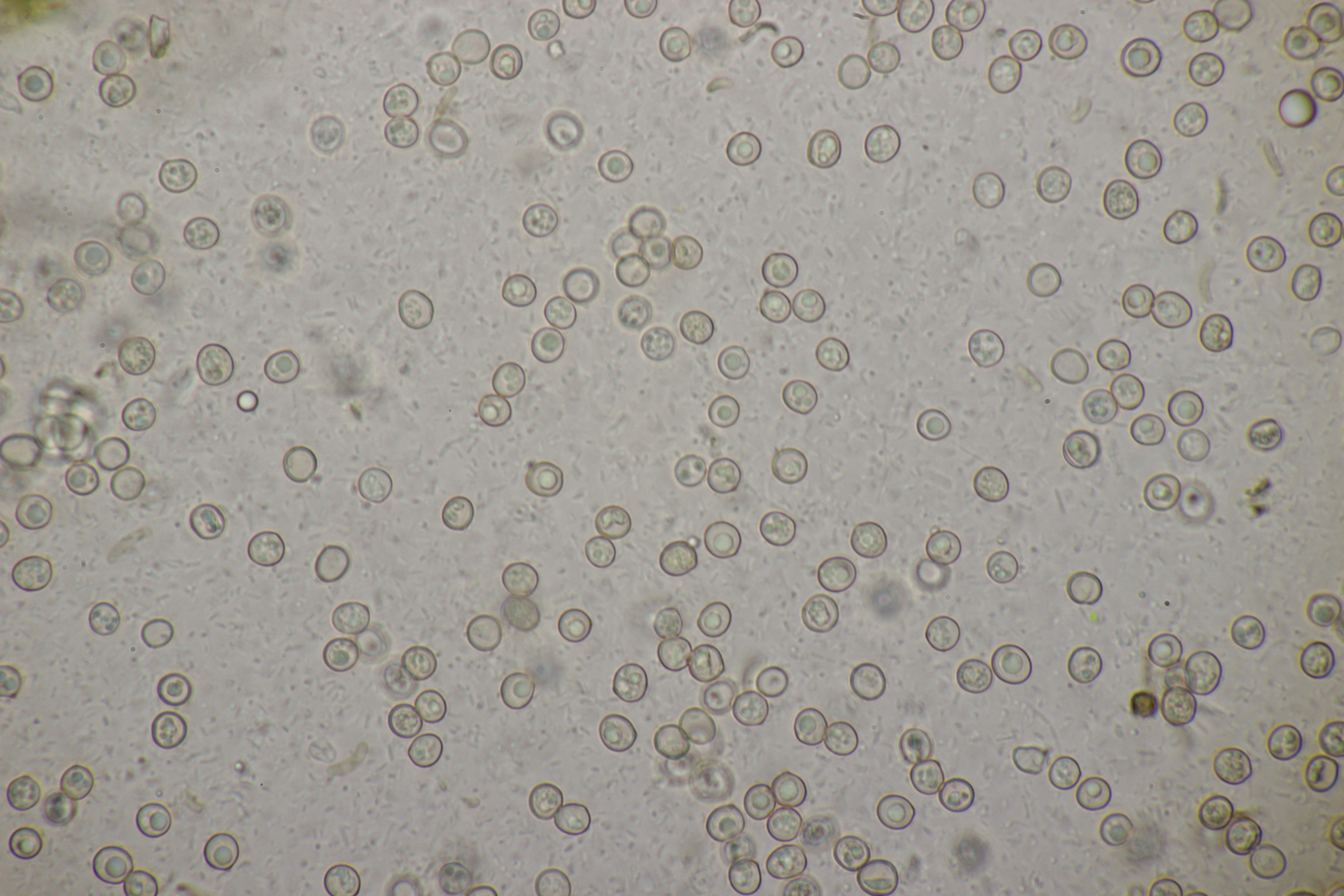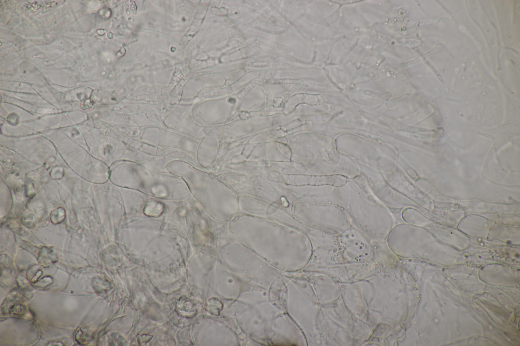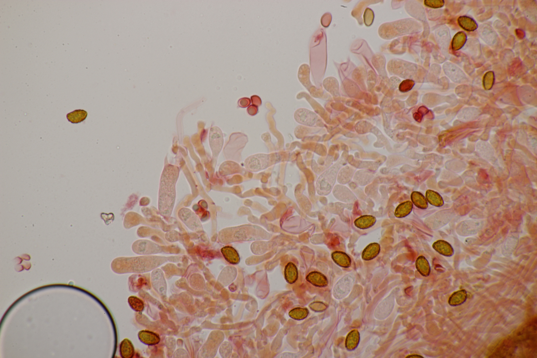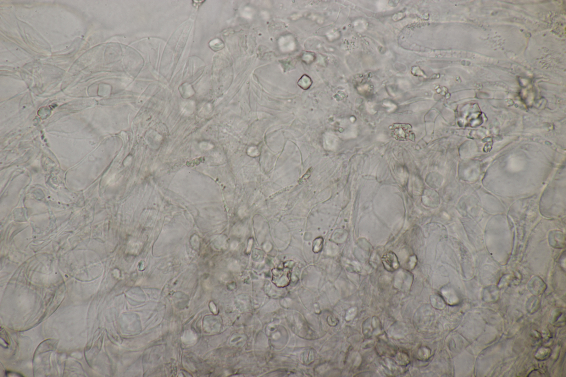3. Ein Pluteus so ähnlich wie Thorbens Fund letztens. Die Sporen messen (5.9+-0.5) µm x (5.2+-0.3) µm, Q=1.1+-0.1, bzw. (5.2-6.7) x (4.8-5.7), Q=1.0-1.3. Die Zystiden würde ich überwiegend für sackförmig halten, womit ich bei Pluteus pallescens rauskäme.