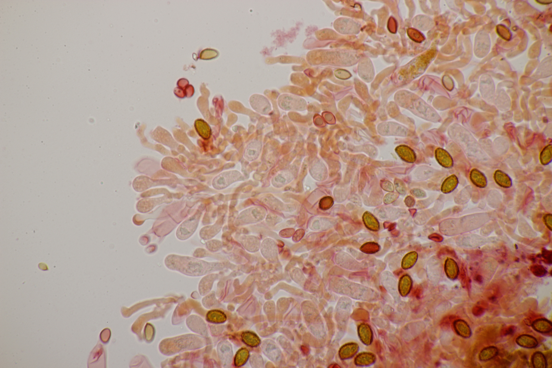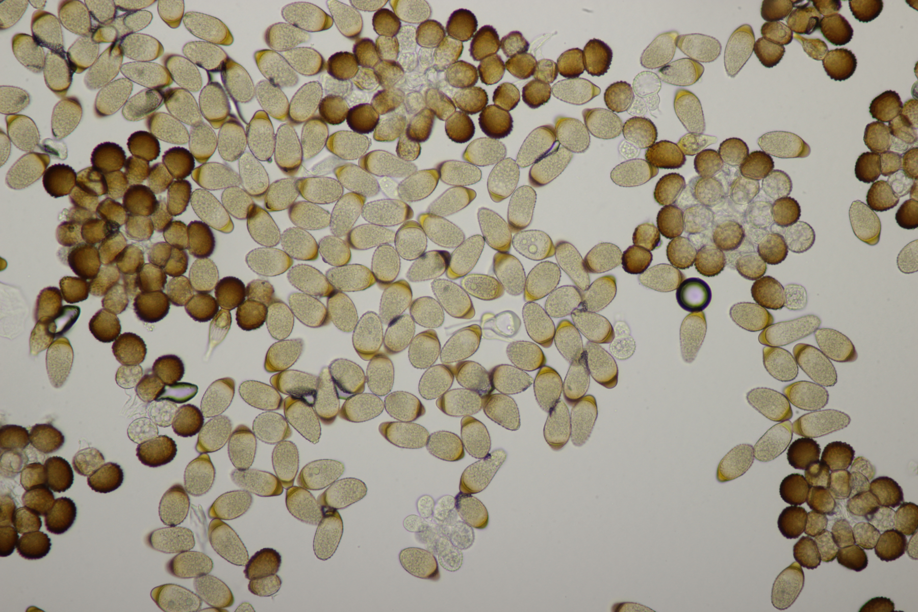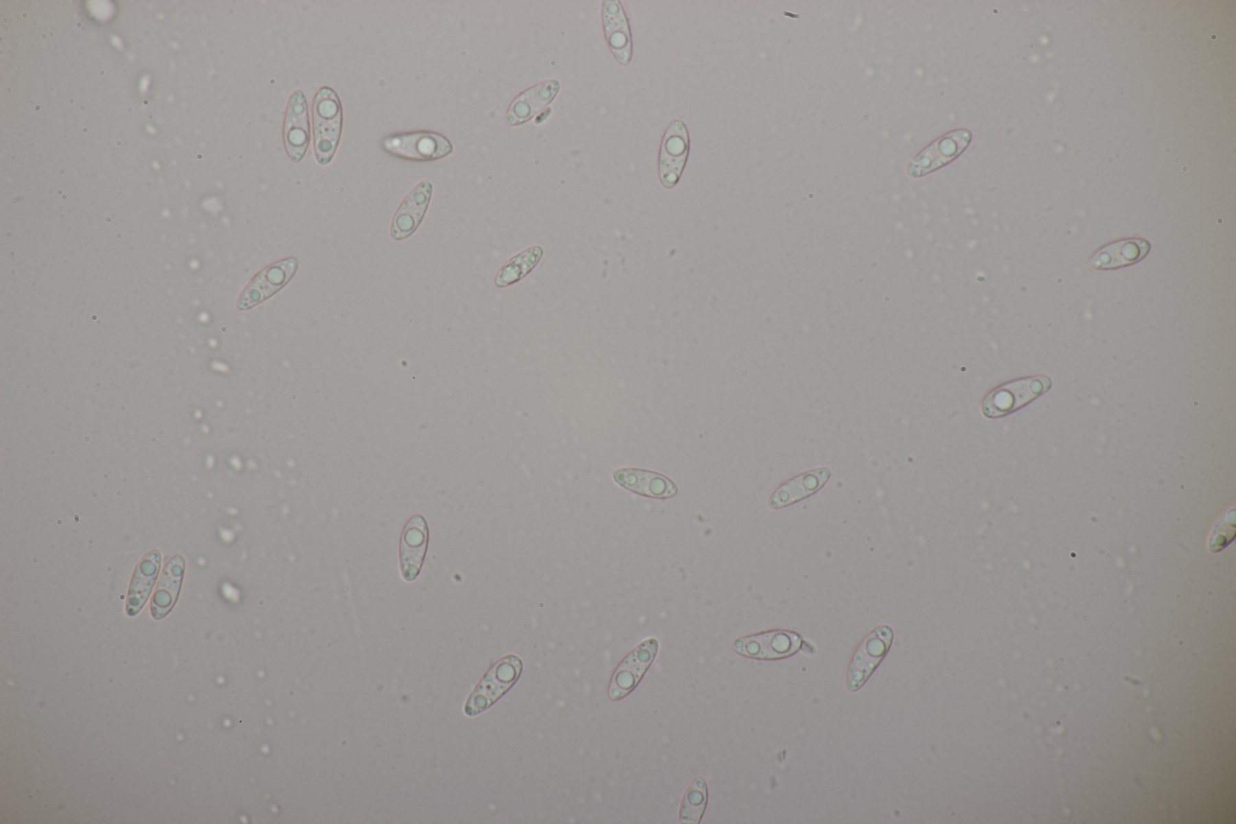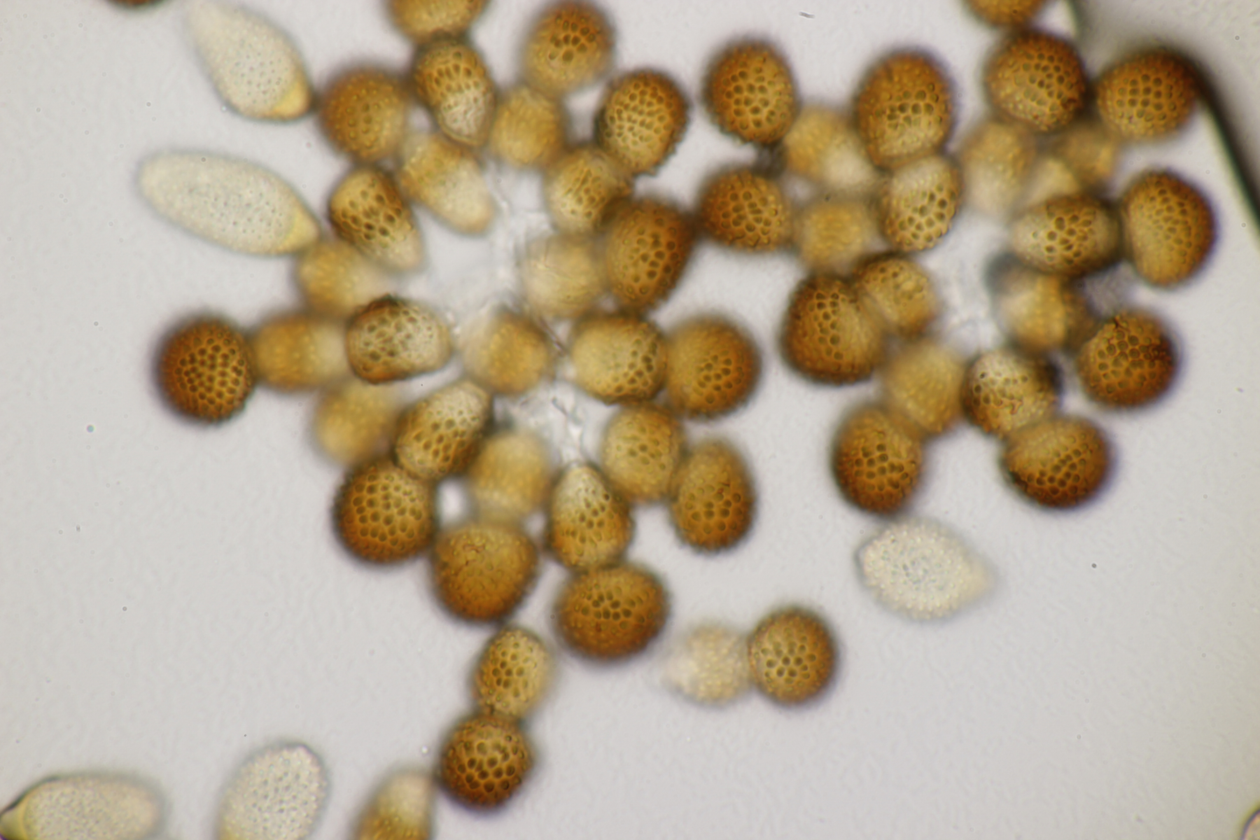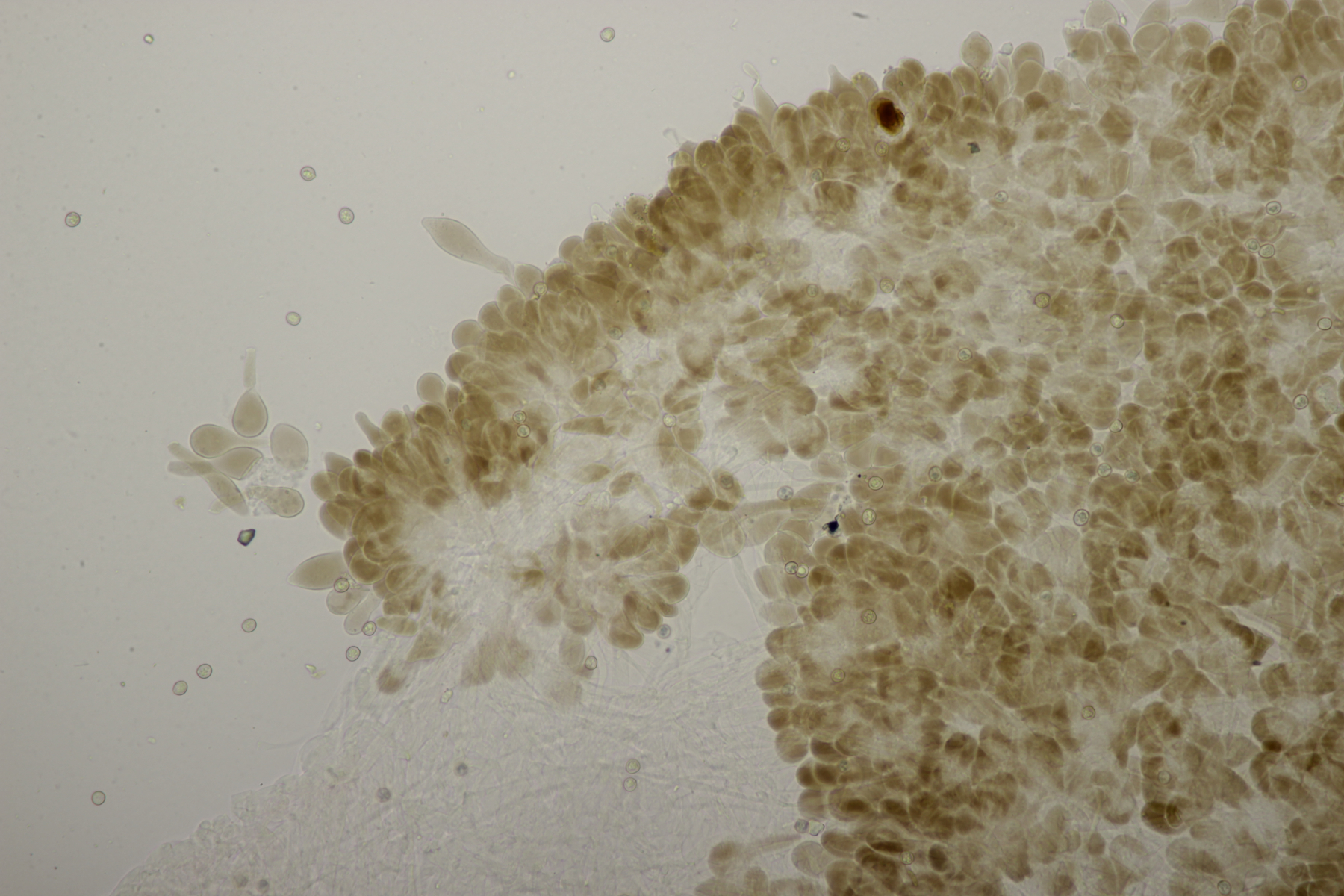 3. Ein Pluteus so ähnlich wie Thorbens Fund letztens. Die Sporen messen (5.9+-0.5) µm x (5.2+-0.3) µm, Q=1.1+-0.1, bzw. (5.2-6.7) x (4.8-5.7), Q=1.0-1.3. Die Zystiden würde ich überwiegend für sackförmig halten, womit ich bei Pluteus pallescens rauskäme.