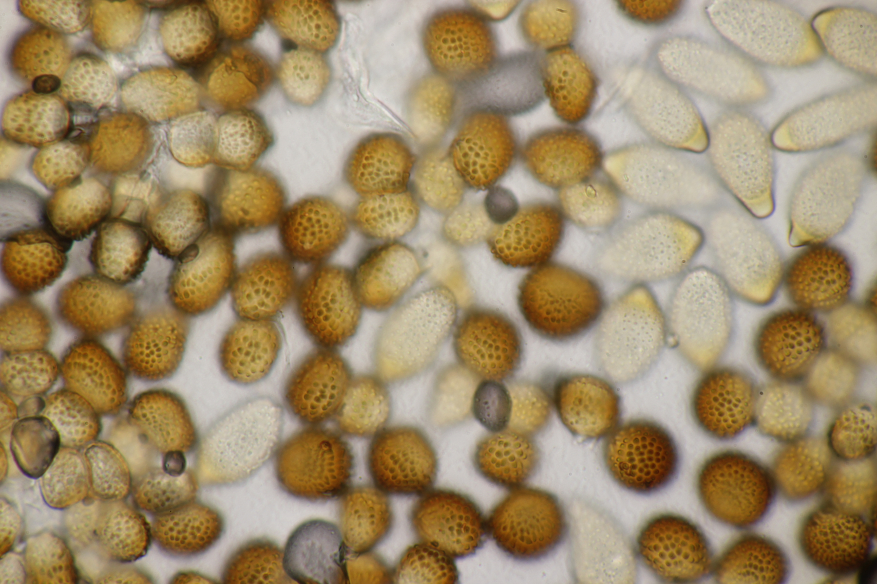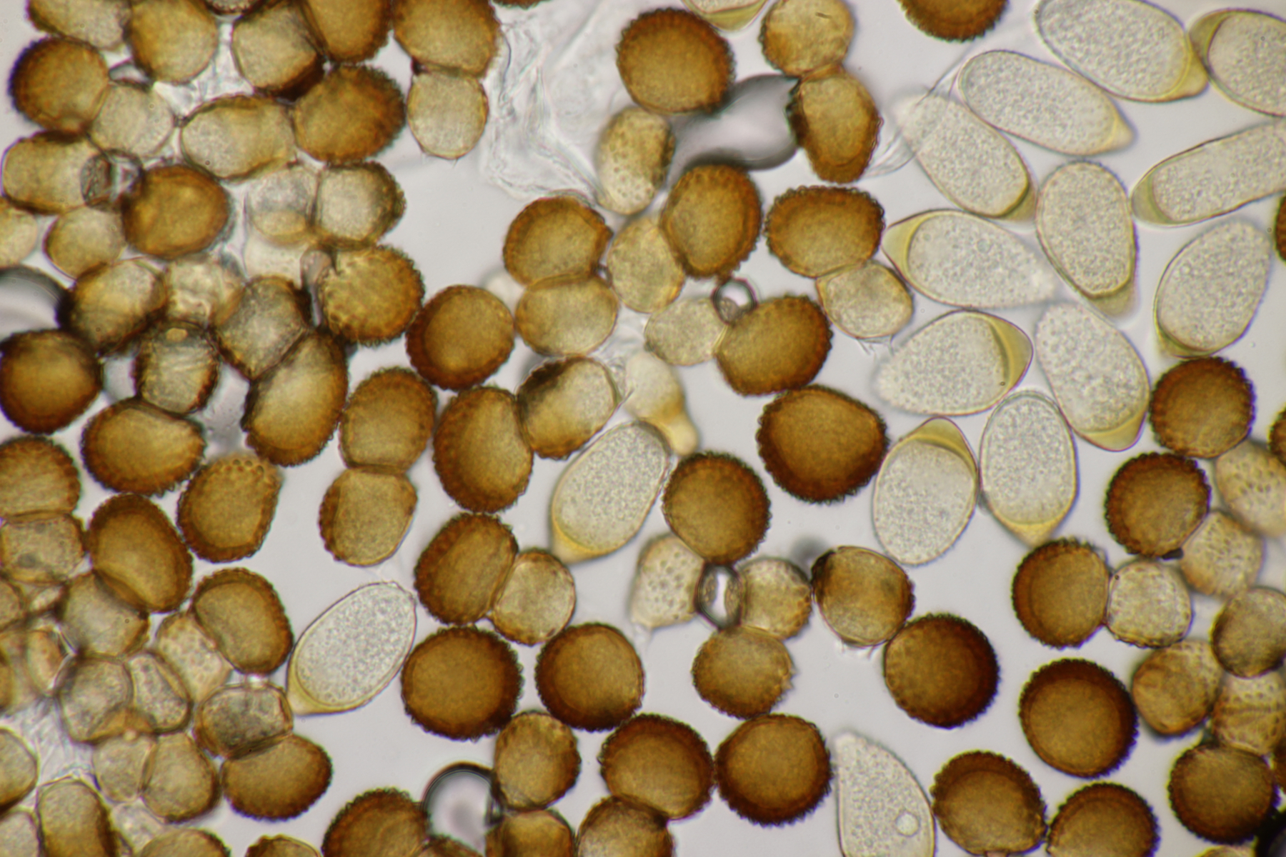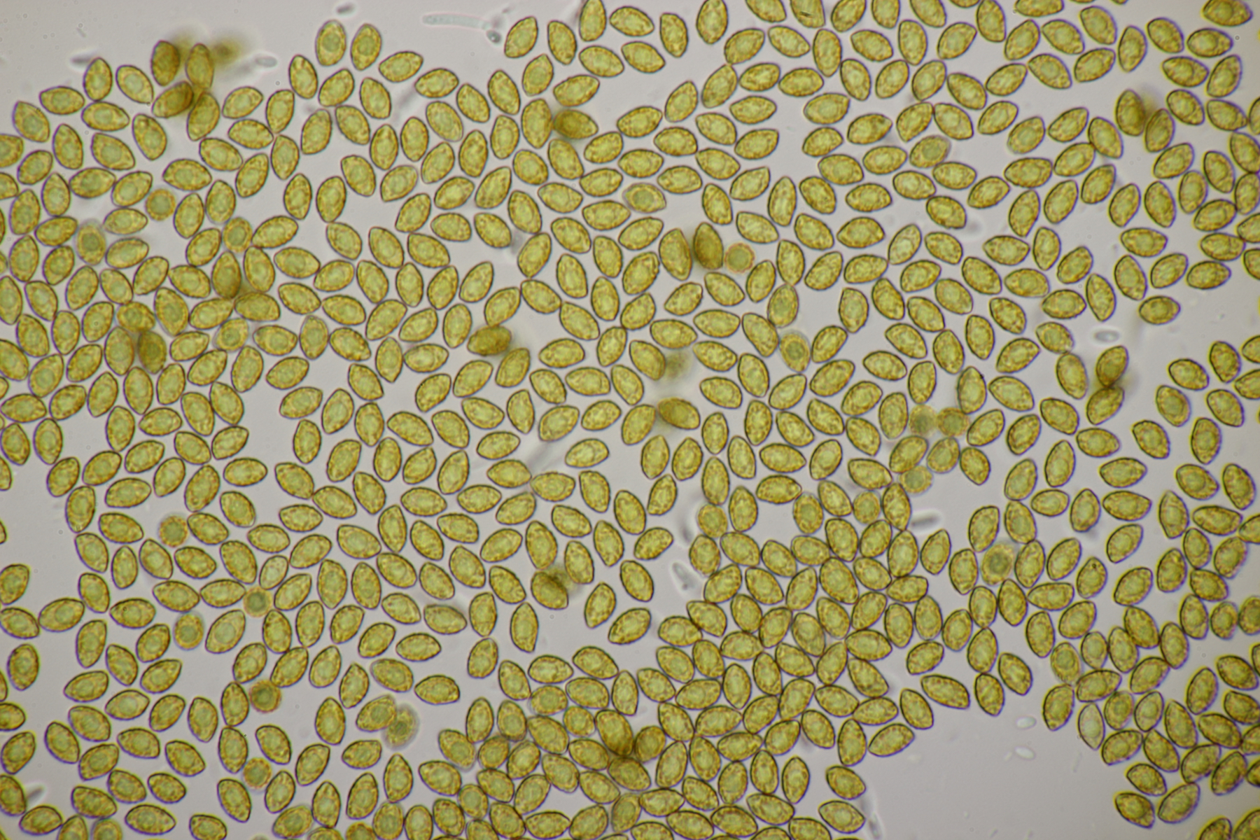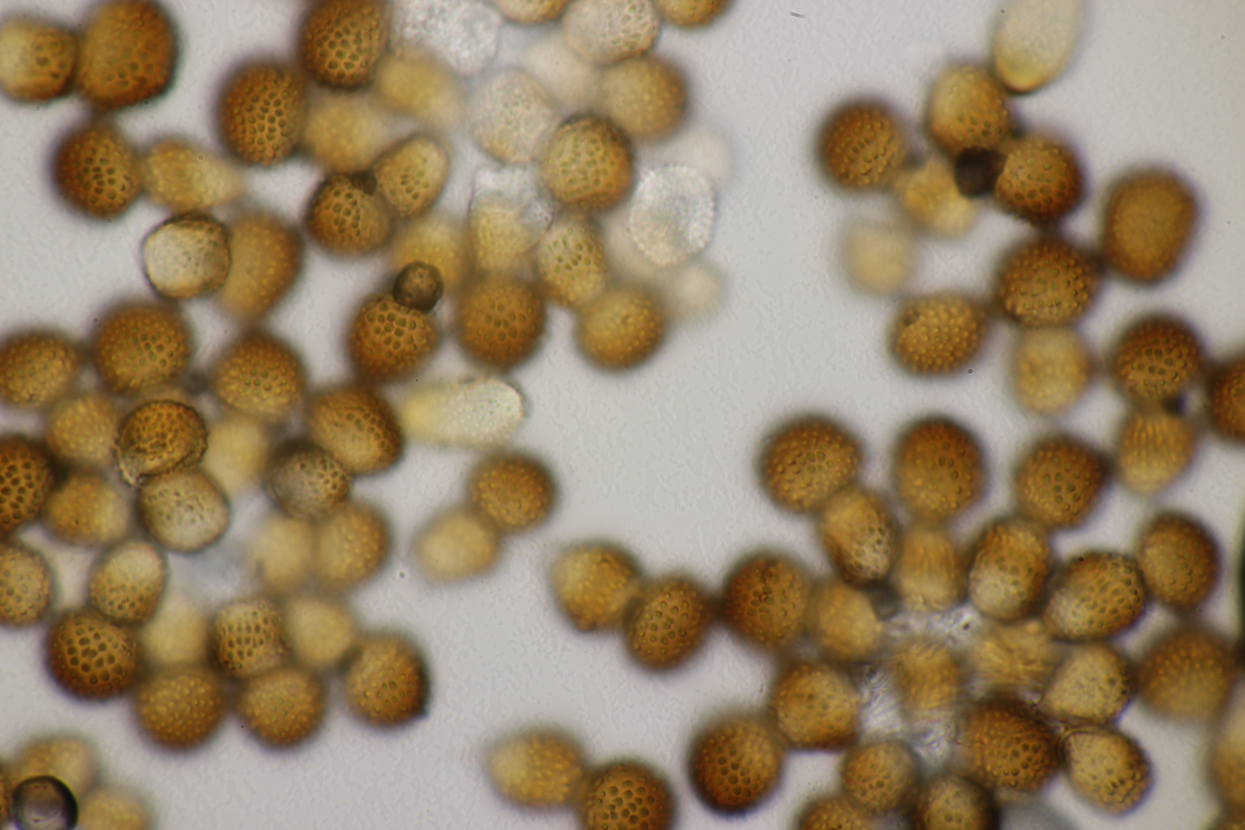 3. Ein Pluteus so ähnlich wie Thorbens Fund letztens. Die Sporen messen (5.9+-0.5) µm x (5.2+-0.3) µm, Q=1.1+-0.1, bzw. (5.2-6.7) x (4.8-5.7), Q=1.0-1.3. Die Zystiden würde ich überwiegend für sackförmig halten, womit ich bei Pluteus pallescens rauskäme.