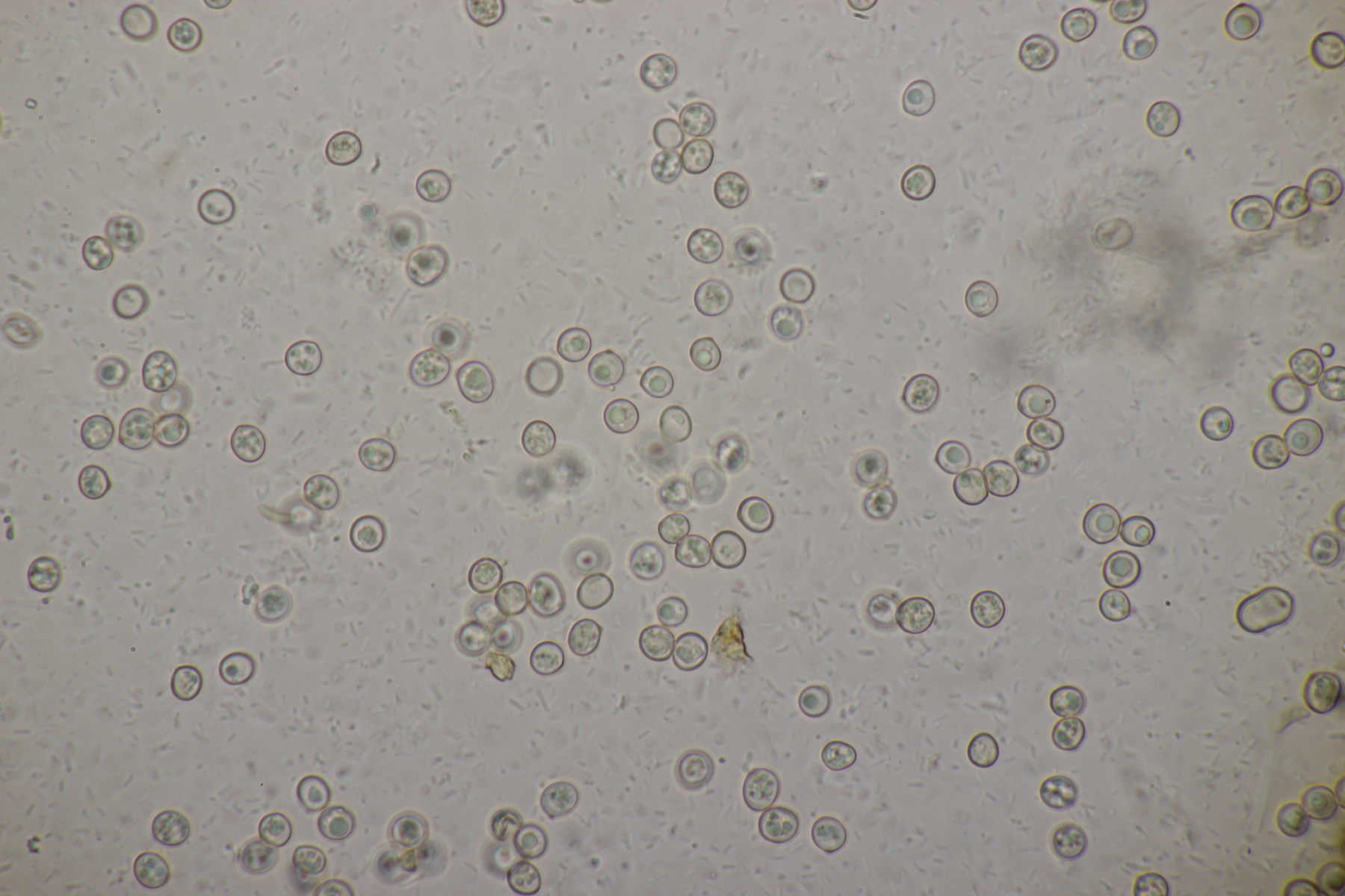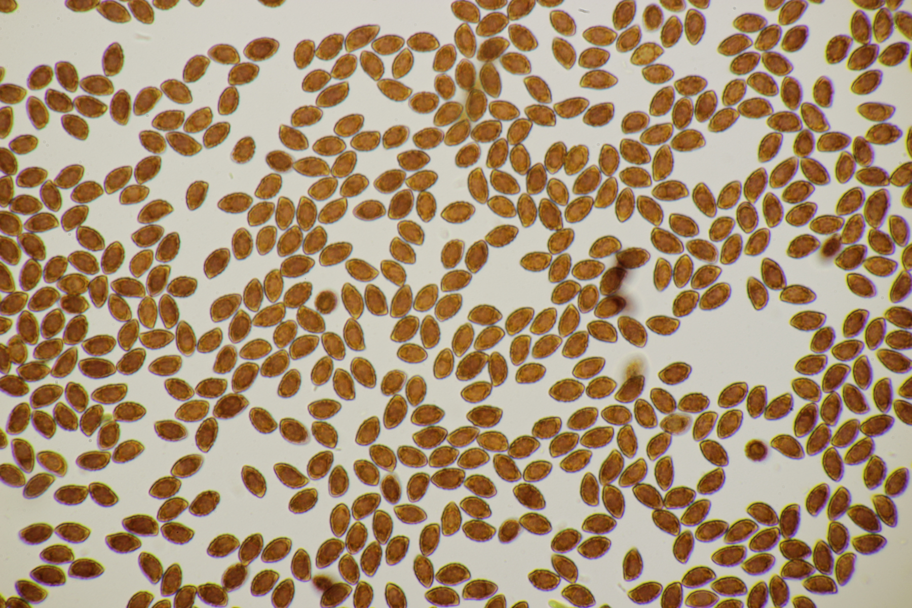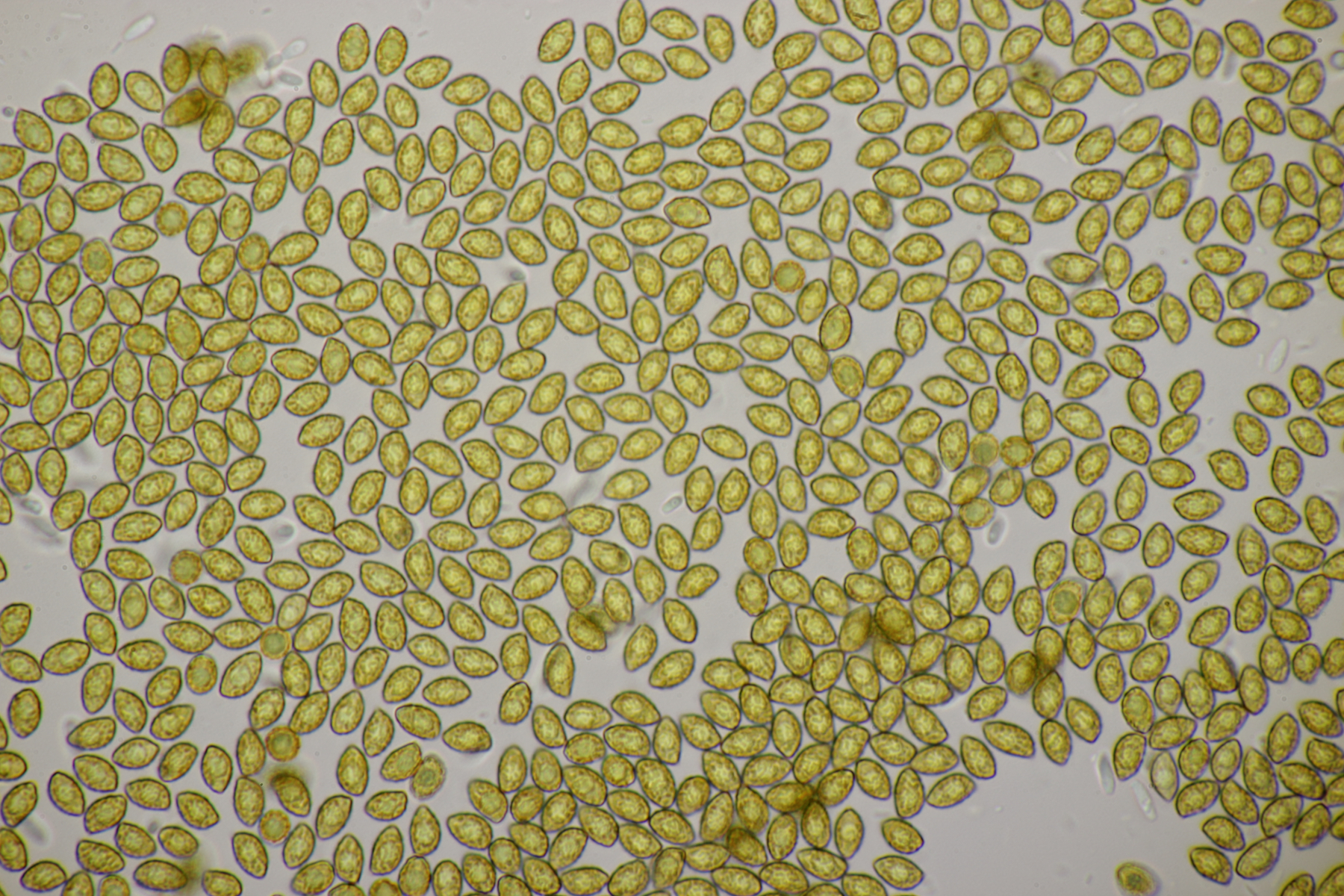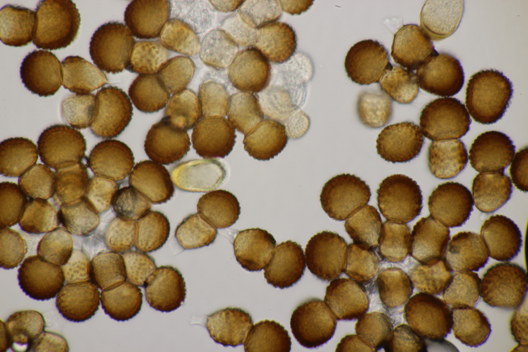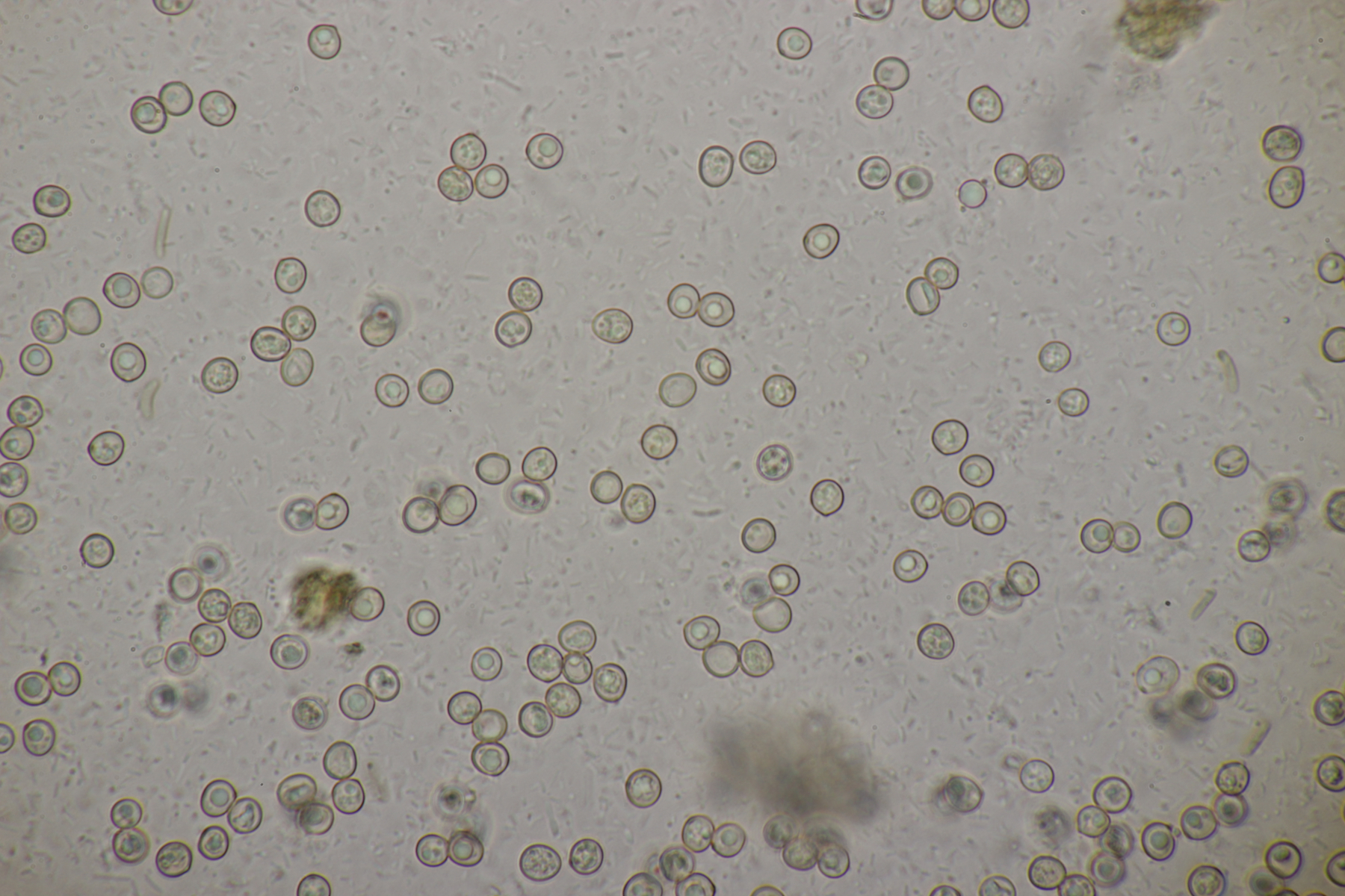 3. Ein Pluteus so ähnlich wie Thorbens Fund letztens. Die Sporen messen (5.9+-0.5) µm x (5.2+-0.3) µm, Q=1.1+-0.1, bzw. (5.2-6.7) x (4.8-5.7), Q=1.0-1.3. Die Zystiden würde ich überwiegend für sackförmig halten, womit ich bei Pluteus pallescens rauskäme.