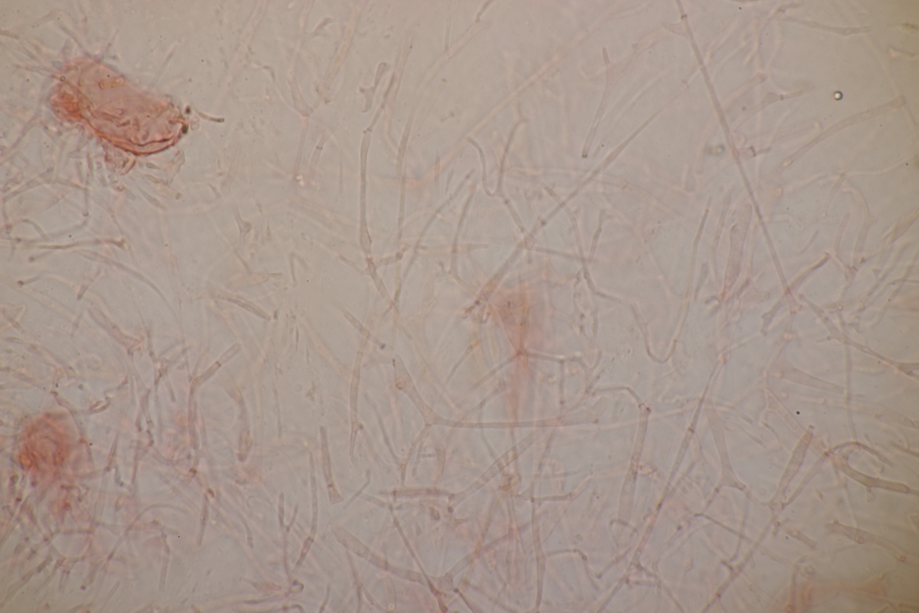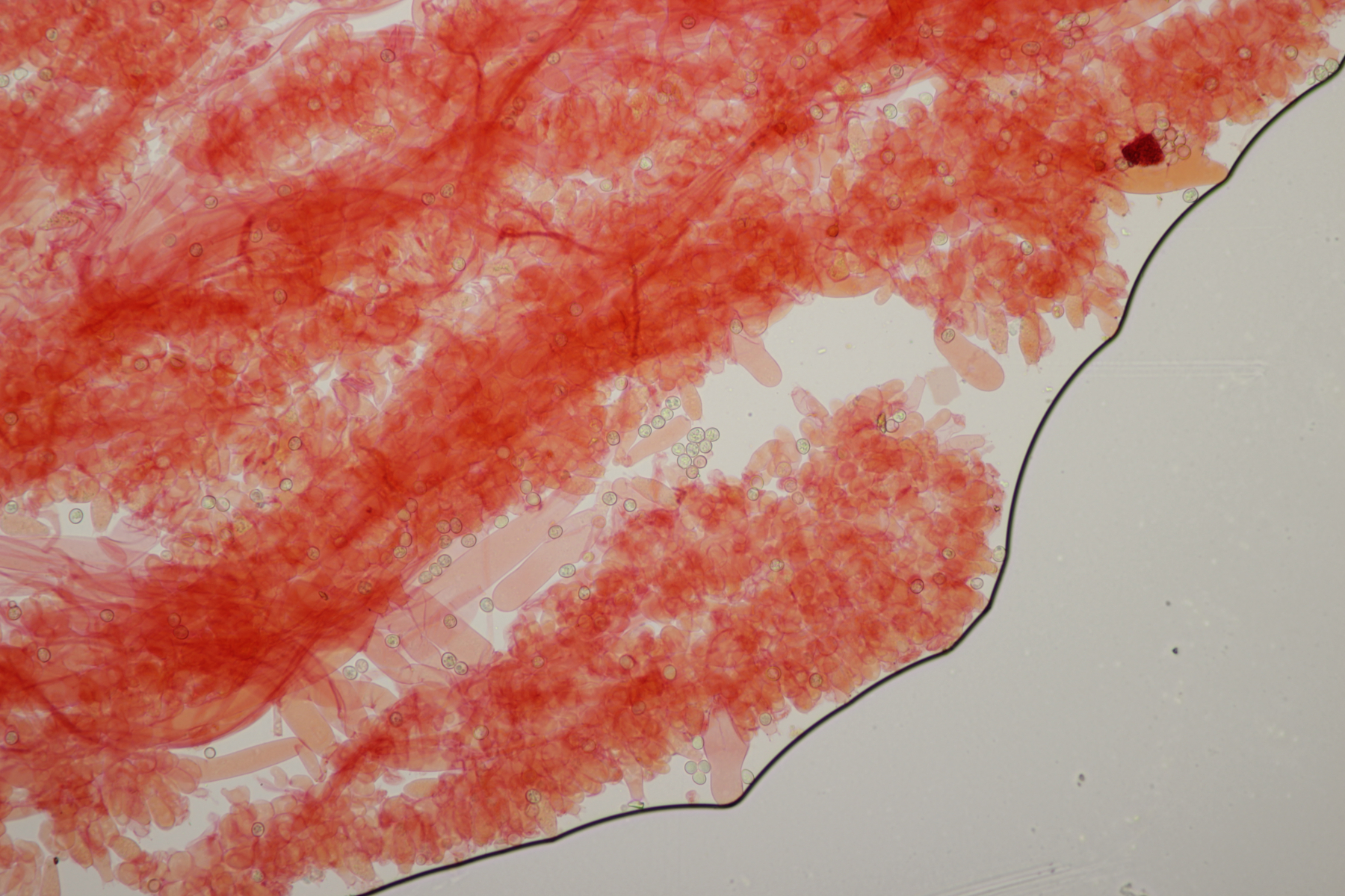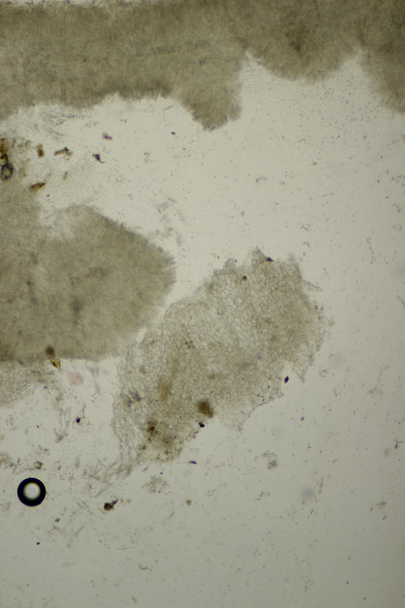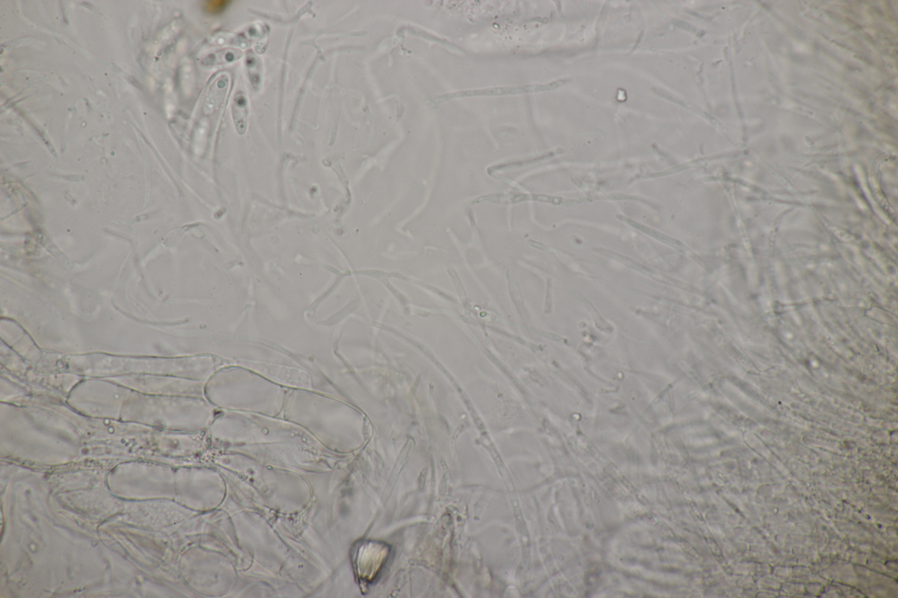 4. Ein Ascomycet an einem feucht liegenden Laubholzstöckchen. Wer hat Ideen? Vielleicht ein Hymenoscyphus? Asci reagieren mit Lugol blau und sind ohne Haken.
