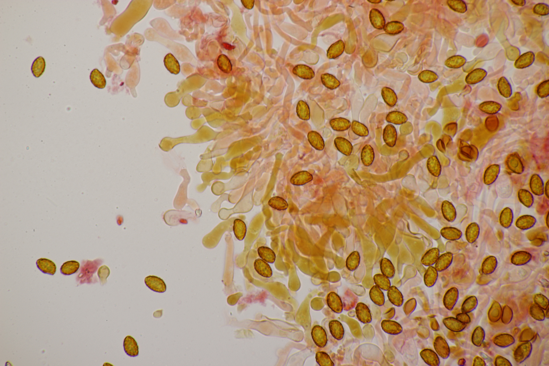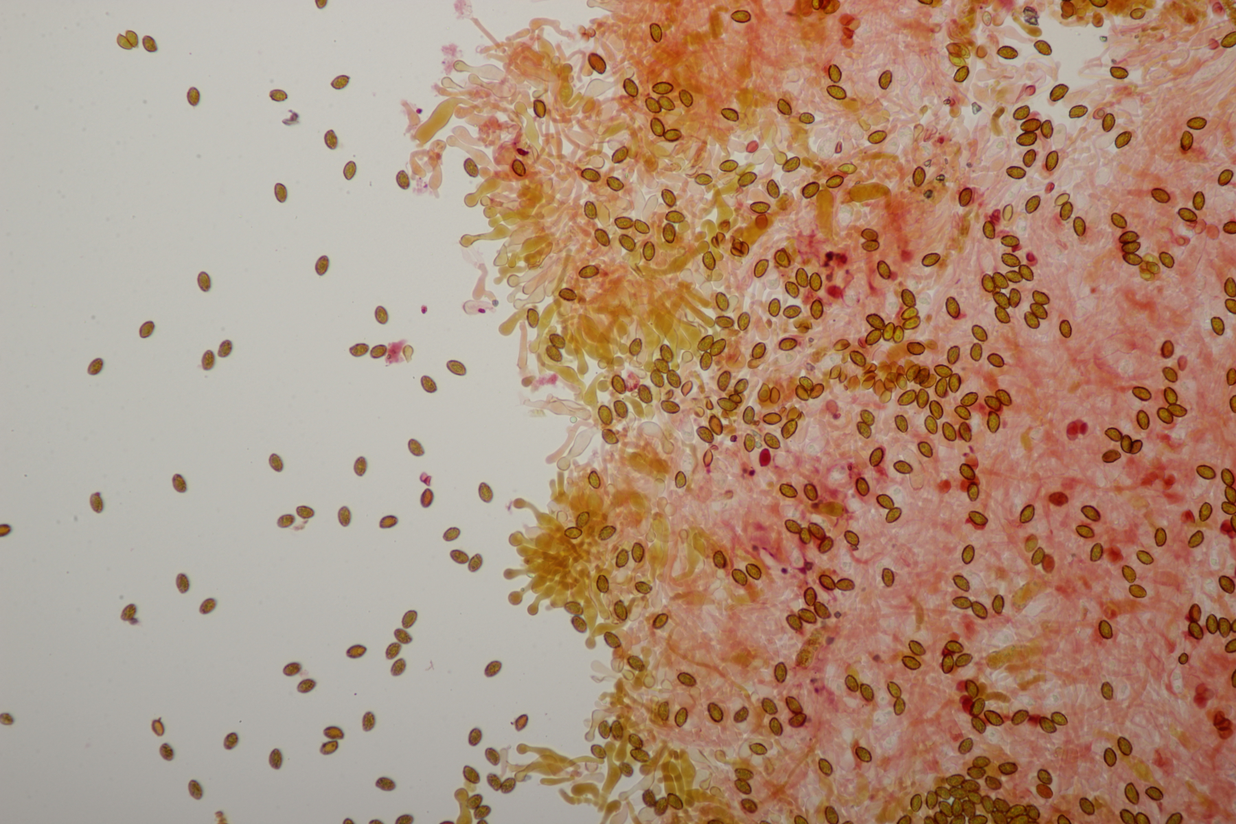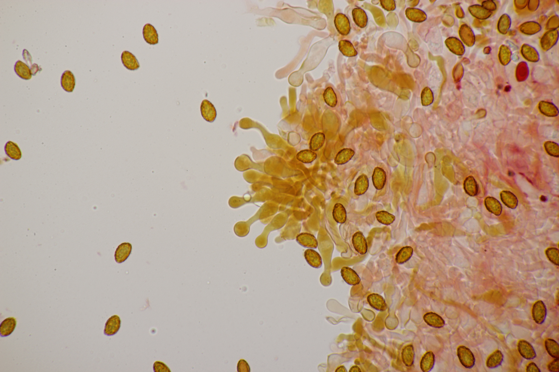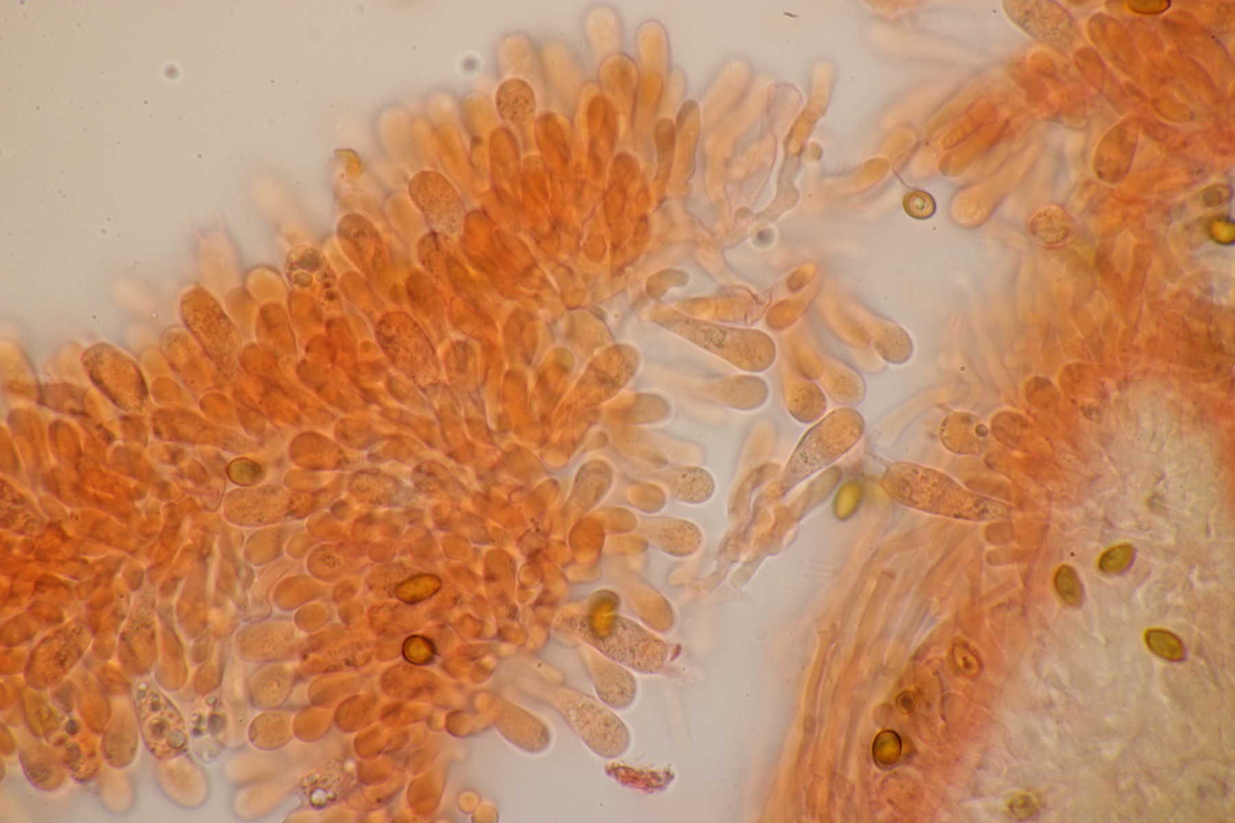 7. Bei den großen orangefarbenen Pilzen war ich zunächst ratlos, da ich makroskopisch auch an Pholiota gedacht habe. Aber das paßte mikroskopisch nicht. Zum Glück hat Stefan den Pilz blind bestimmen können: Gymnopilus junonius. Huthaut reagiert dunkelrot mit KOH