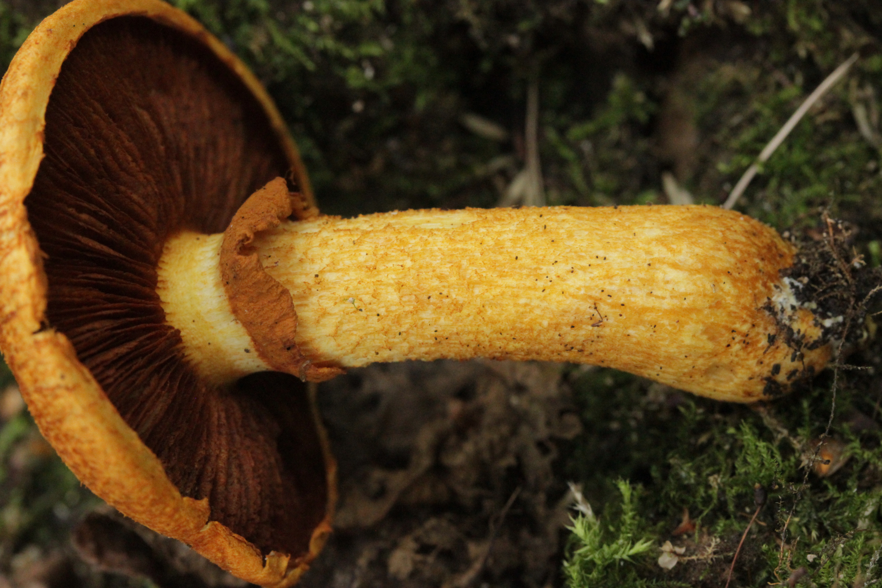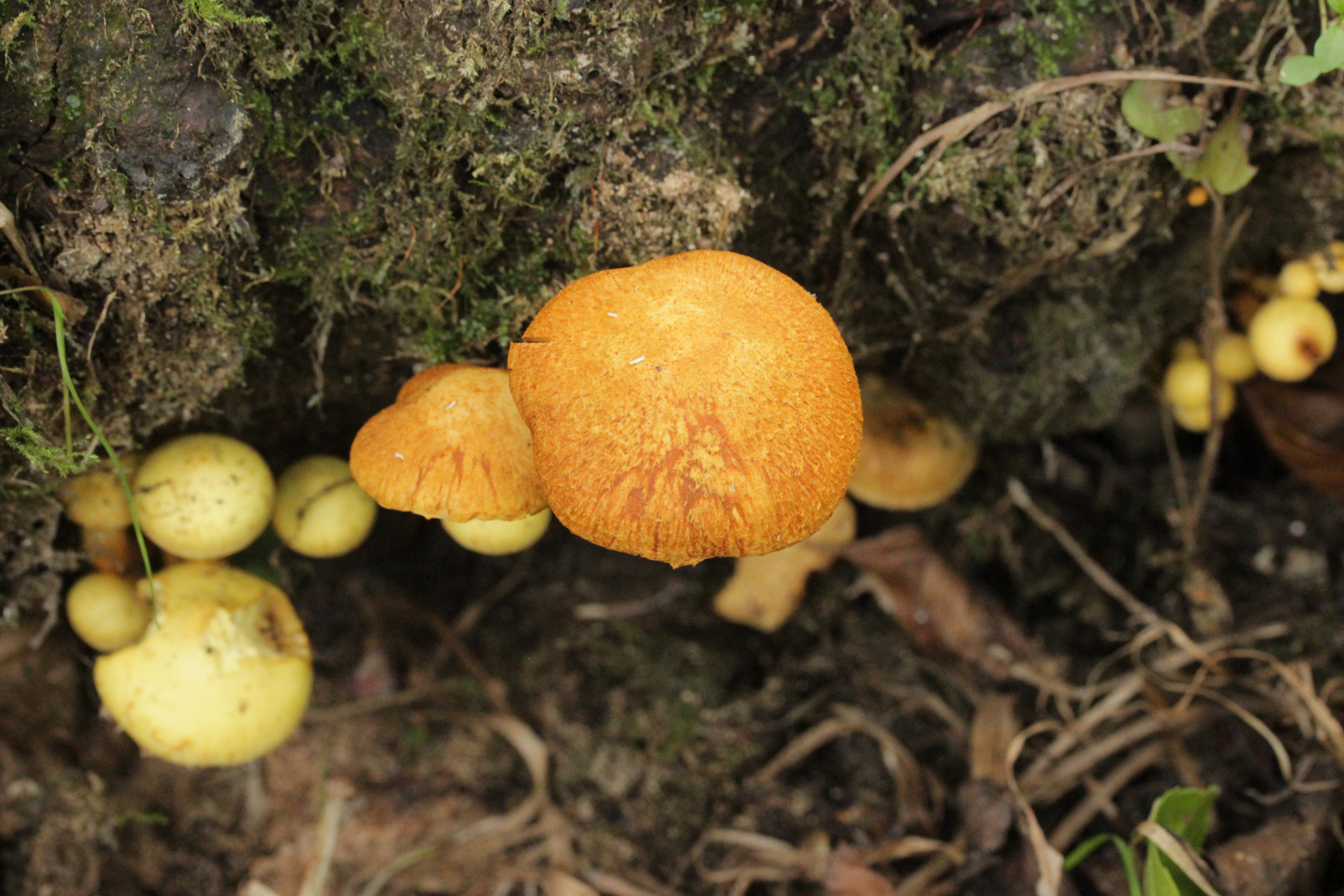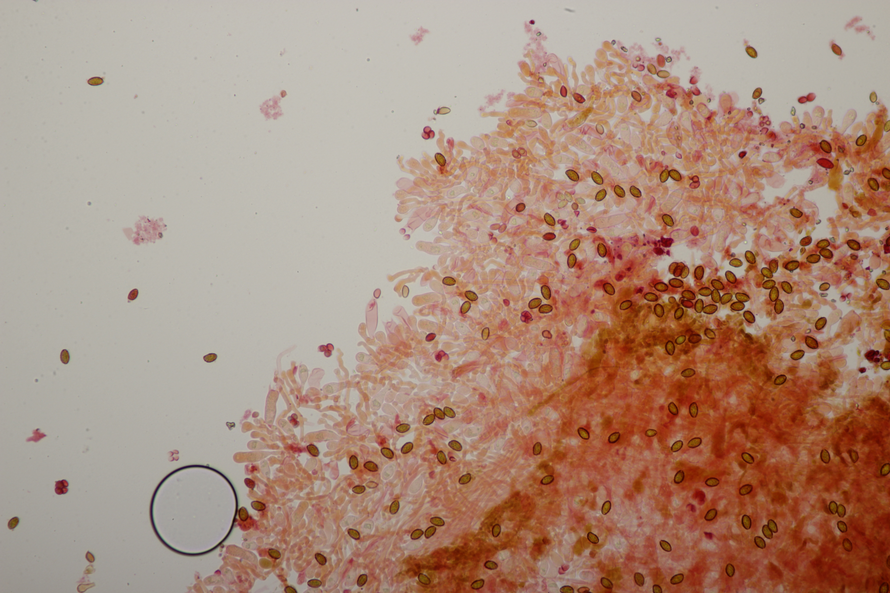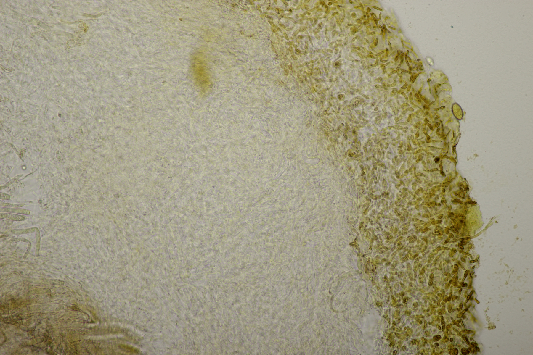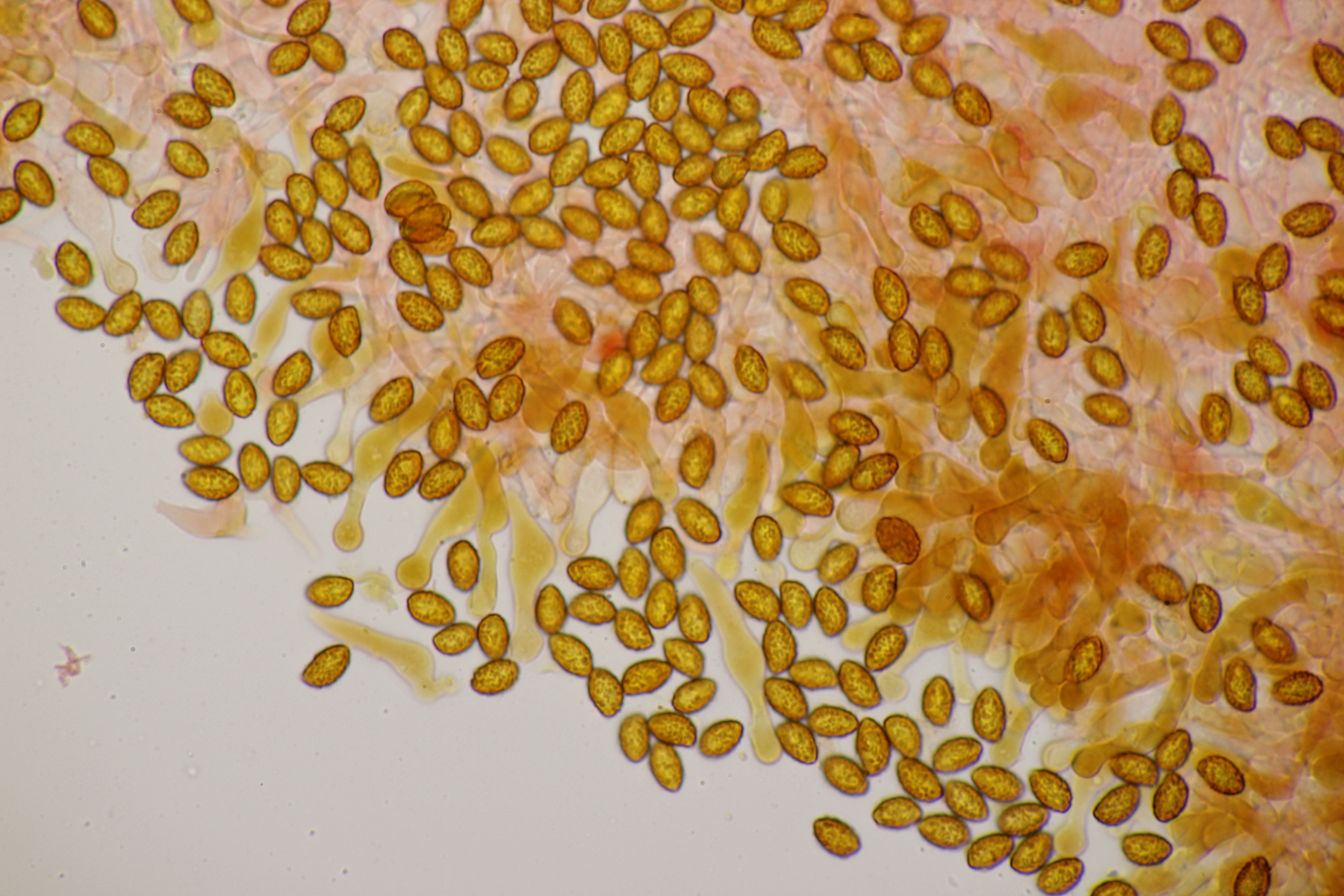 7. Bei den großen orangefarbenen Pilzen war ich zunächst ratlos, da ich makroskopisch auch an Pholiota gedacht habe. Aber das paßte mikroskopisch nicht. Zum Glück hat Stefan den Pilz blind bestimmen können: Gymnopilus junonius. Huthaut reagiert dunkelrot mit KOH