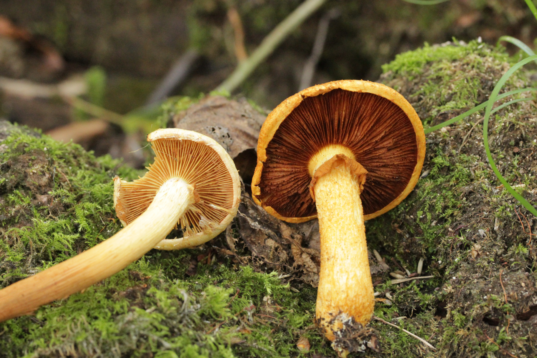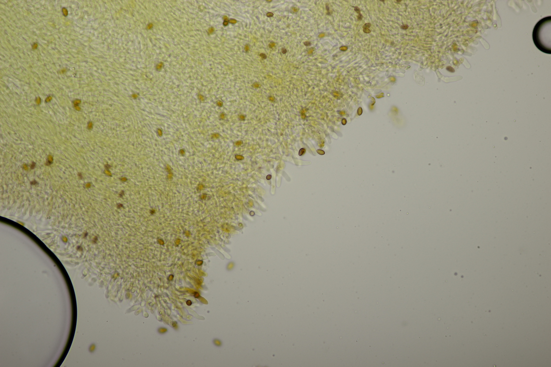 6. Dann an einem Laubholzast direkt 2 Pilzarten dicht an dicht beieinander. Fangen wir mal mit den kleinen gelben an. Pleurozystiden nicht vorhanden, Geschmack mild, Huthaut reagiert rötlich mit 3% KOH. Da lande ich bei Pholiota alnicola