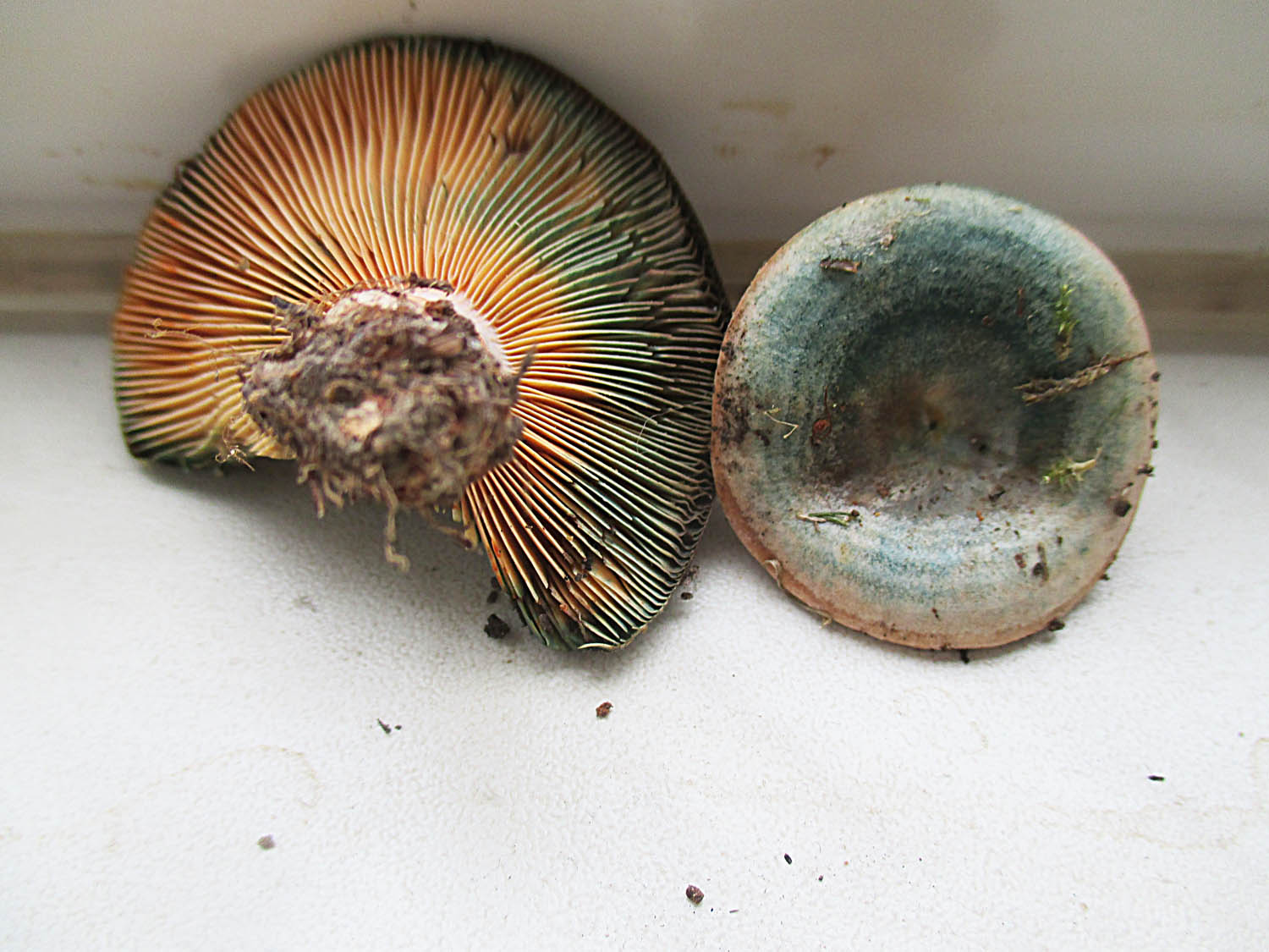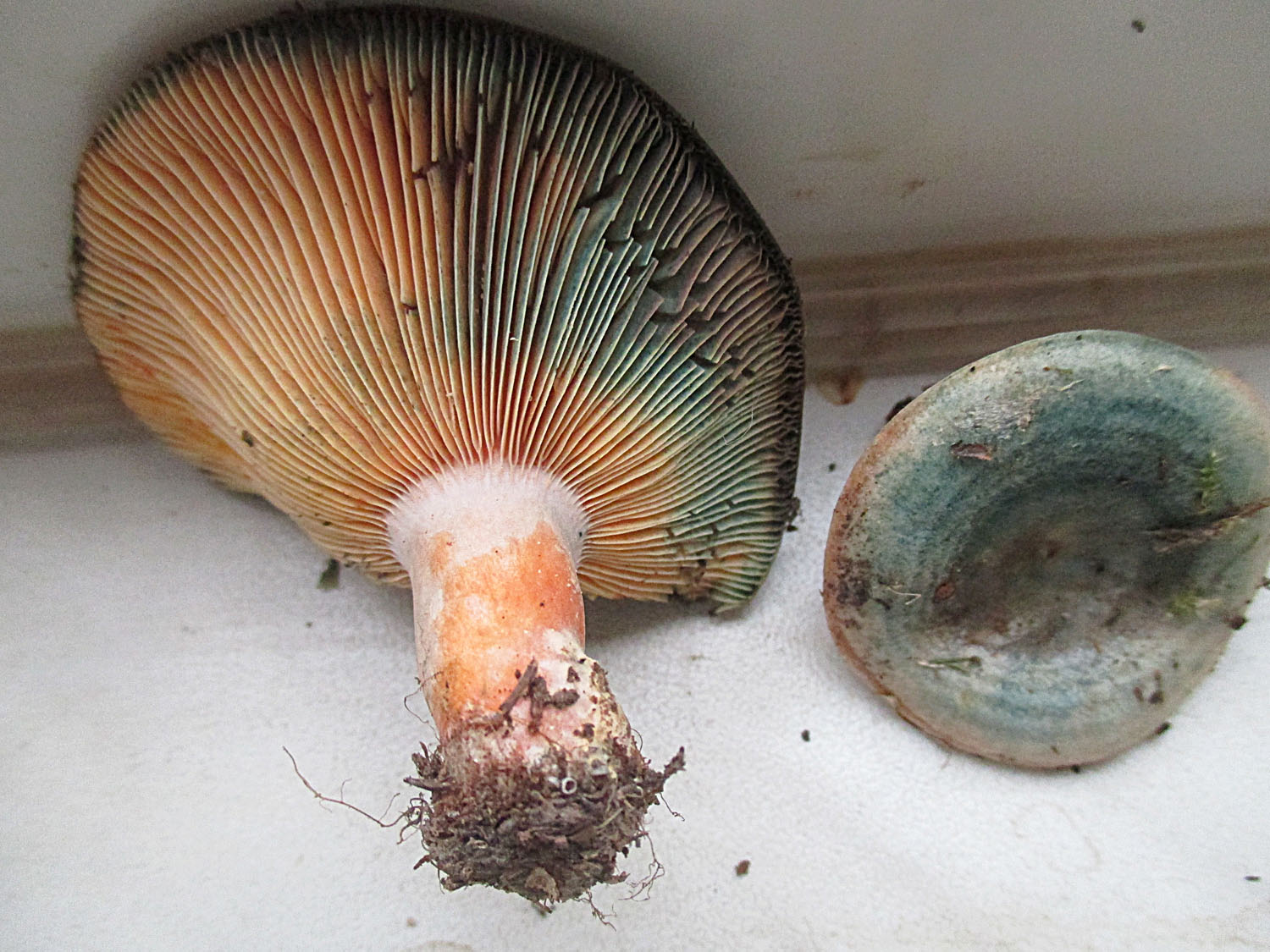Deren Färbung ist weder ein richtiges Grün noch ein richtiges Blau. Der Fundort ist eine Wiese mit Fichten, Lärchen und Kiefern. Der Fichtenreizker dürfte wegen der Zonierung auf dem Hut raus sein. Kann man L. semisanguifluus von L. quieticolor unterscheiden ohne sie zu zerschnippeln? Ich habe nur die beiden.