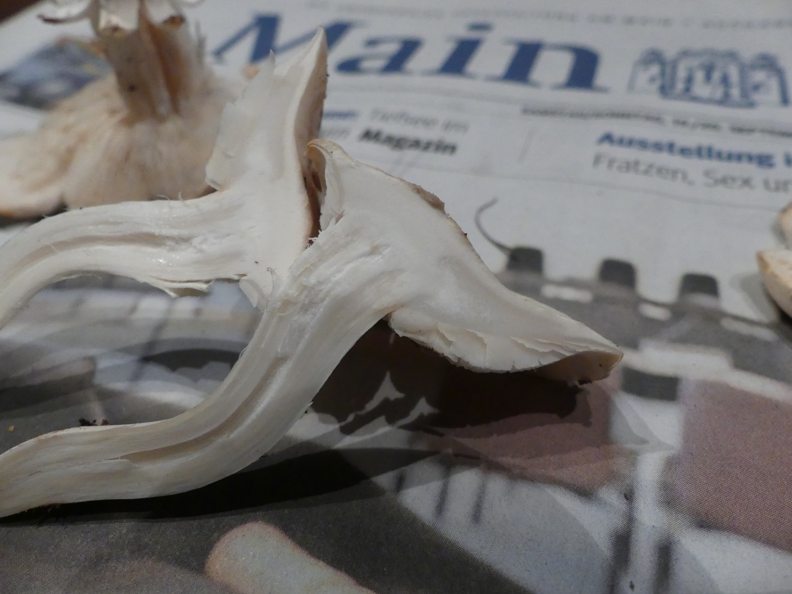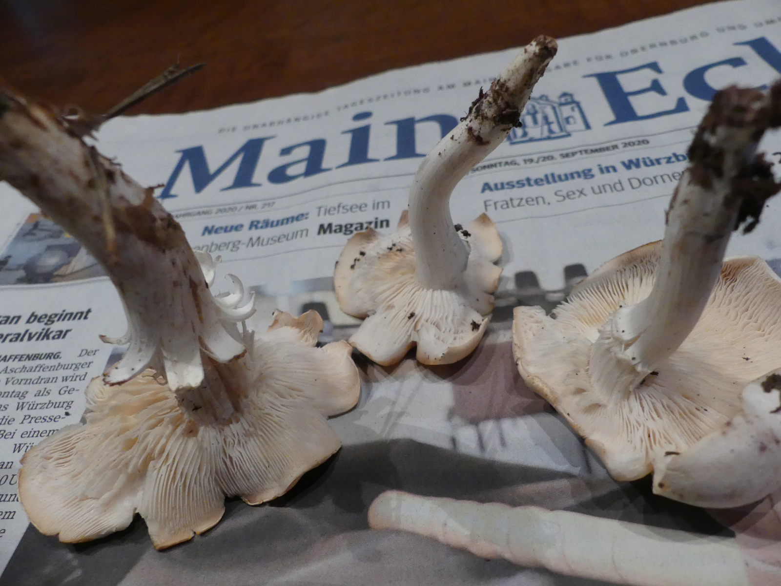 Diese drei "Exzentriker" habe ich heute in Mainfranken gefunden. Eiche-Buche-Kiefer-Mischwald, ca. 250 Meter über NN. Auffallend ist nicht nur die spindelige Stielform und der exzentrische Hut, sondern auch der markante Geruch. Es riecht beim Eintrocknen des kompletten Pilzes irgendwie nach einer Mischung von Sellerie, Lakritz und Maggi, entfernt an Krause Glucke erinnernd. Die frische Schnittfläche hat auch eine etwas unangenehm-chemische Komponente.
