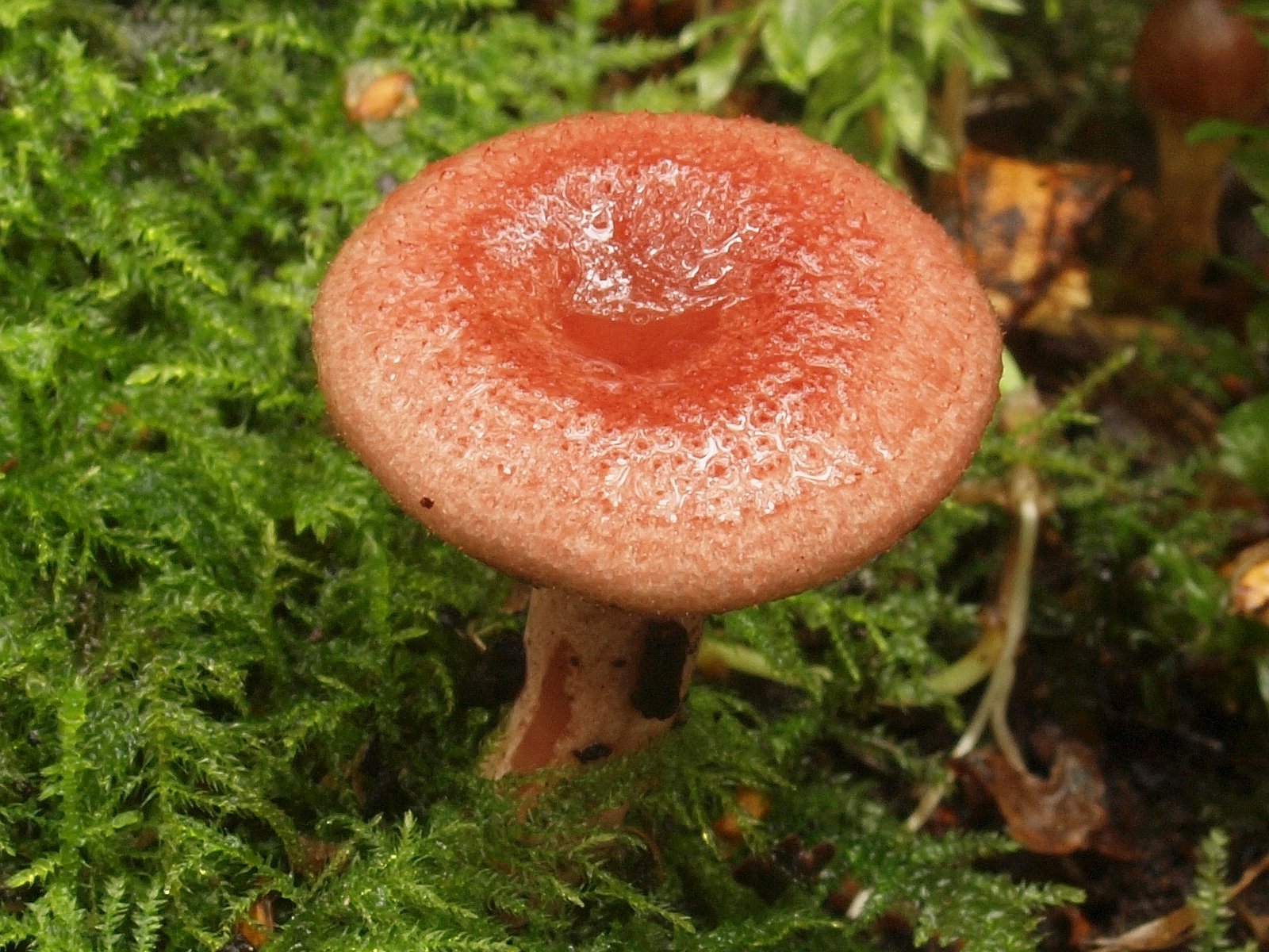 Ein nur etwa einen Zentimeter großes Exemplar des Rosa Schüppchen-Milchlings (Lactarius spinosulus)