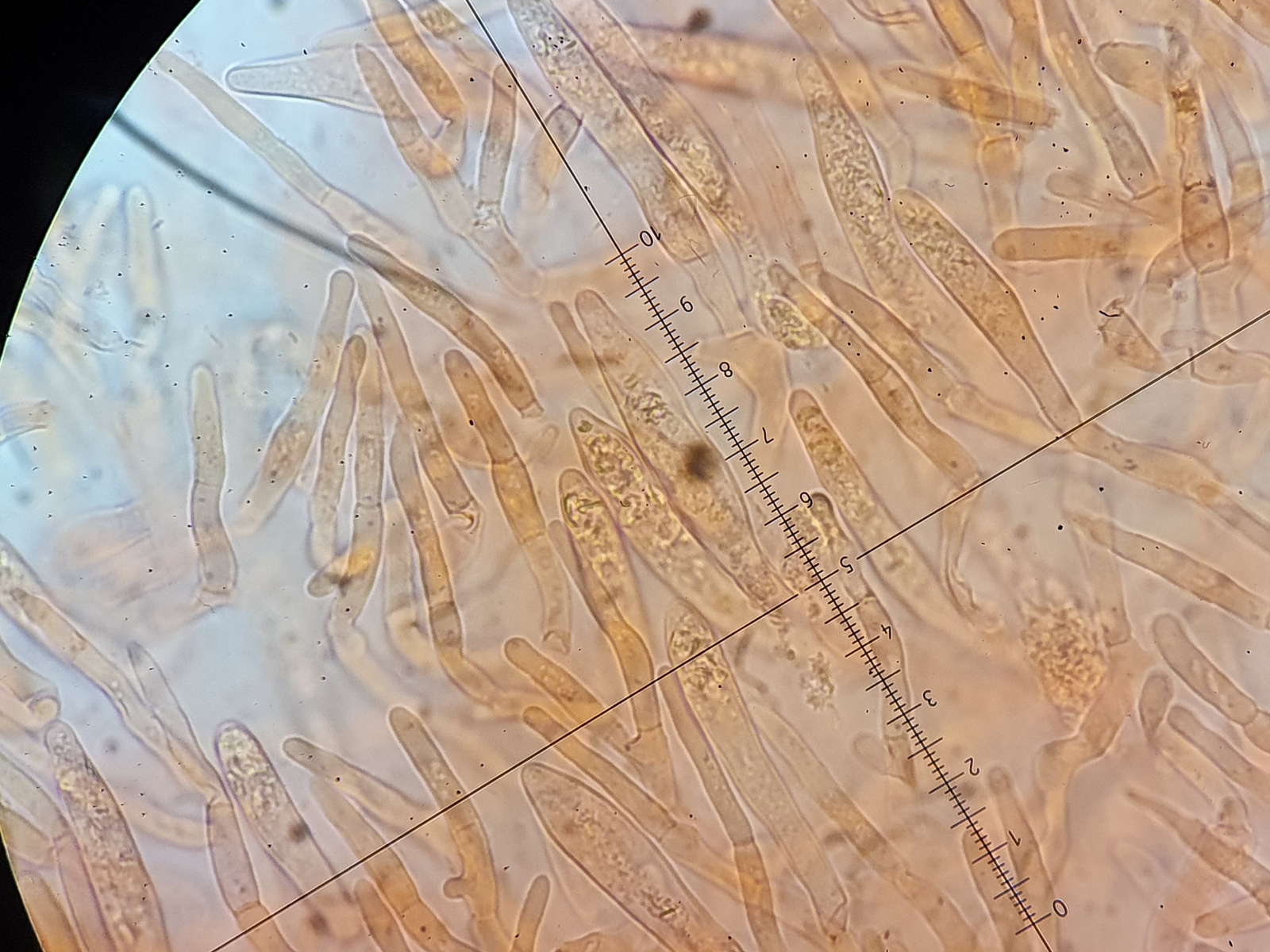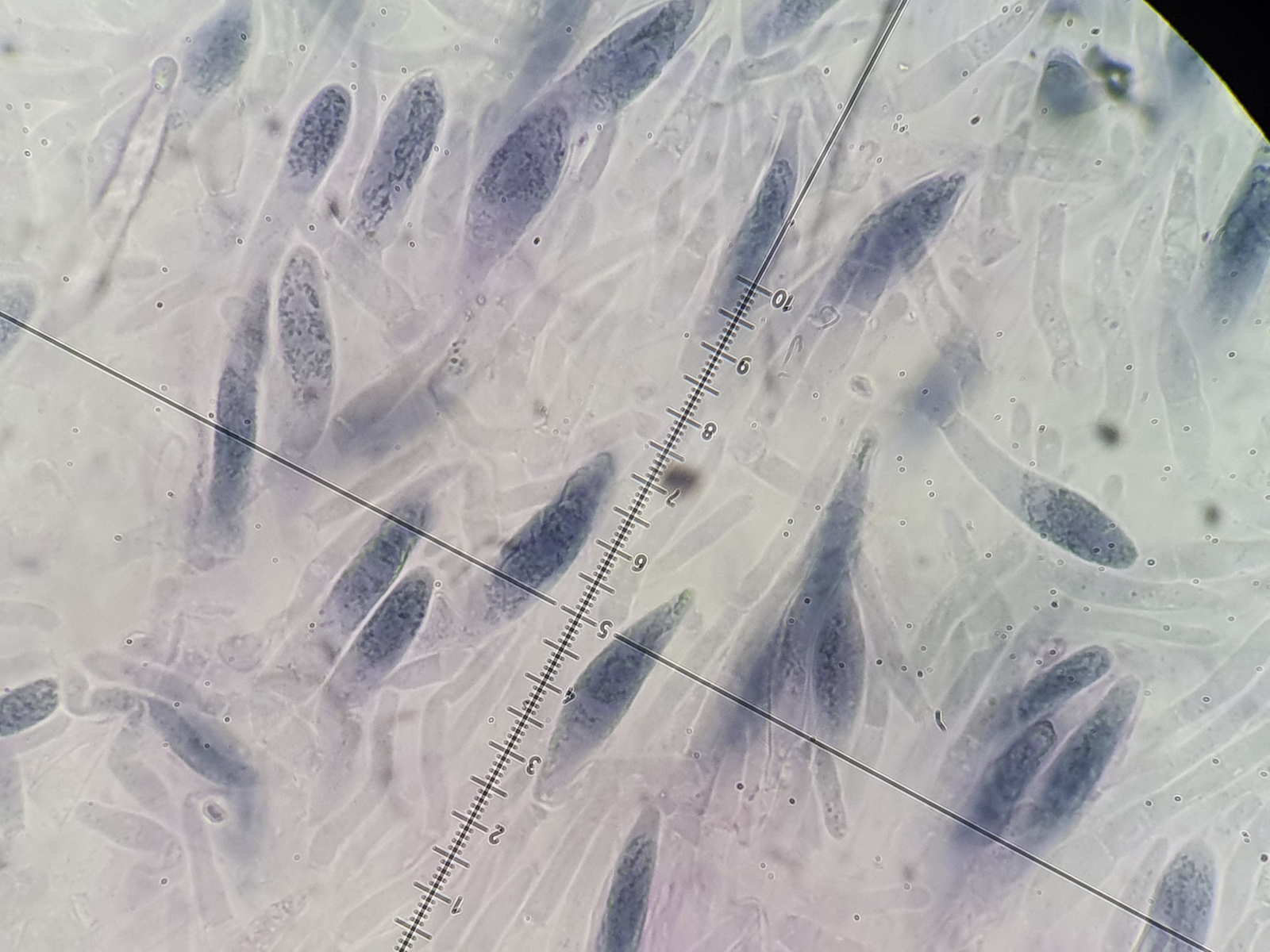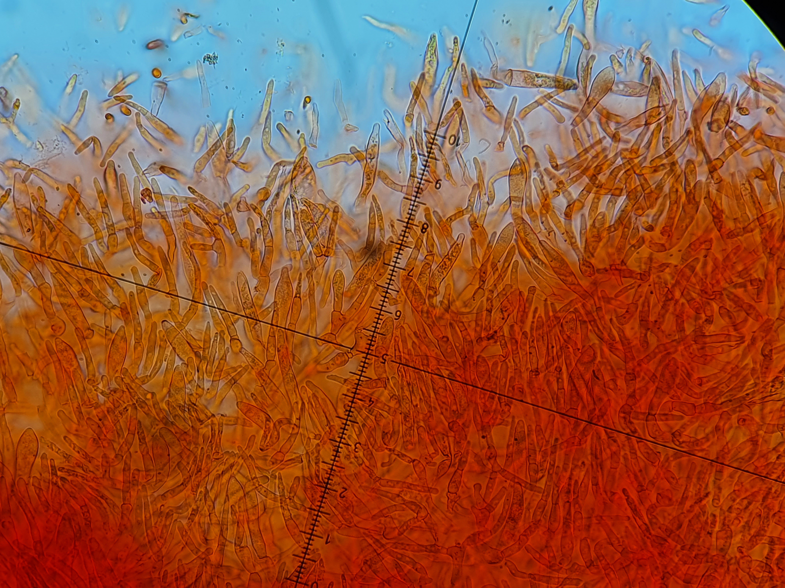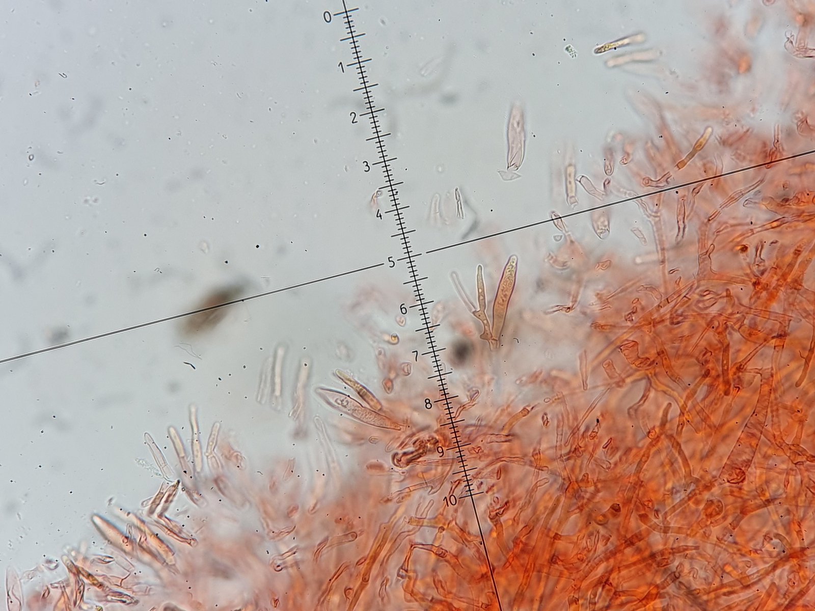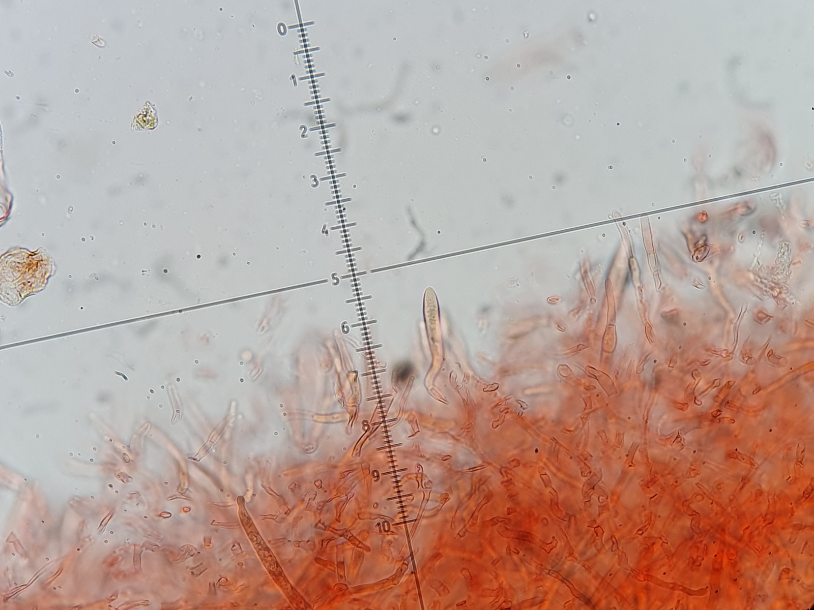 Pileozystiden vorhanden, bereits in Kongorot zu sehen, deutlich in SV zahlreiche Pileozystiden mit etwa 50x7µm