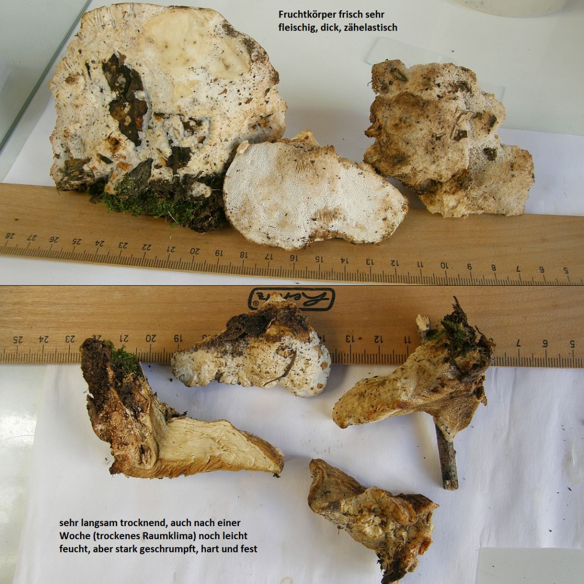 Da steht dass Fruchtkörper von Tyromyces fissilis charakteristische fettige Flecken auf Papier hinterlassen. Und das fleisch soll beim trocknen rosa verfärben. Oder mit Lauge sollte dass Fleisch sich violett färben. Kannst du bei Interesse ja testen.