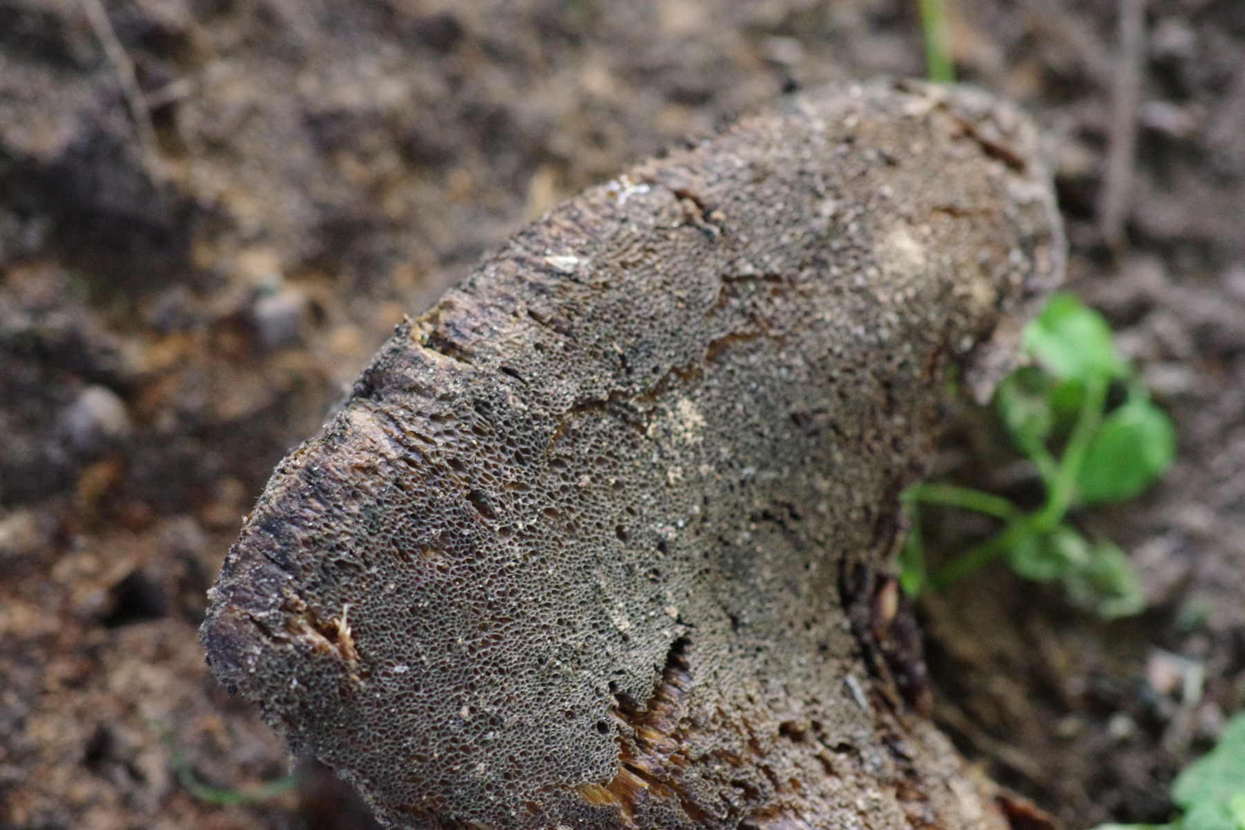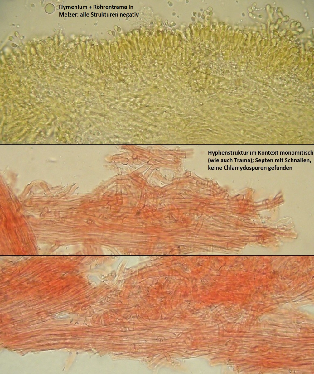 Ergänzend noch 2 Bilder mit den sehr unscheinbaren Resten des vorjährigen Pilzes, links unterhalb des diesjährigen Frk. Ausgehärtet, wie verholzt, oben und unten nahezu schwarz, die Röhren seitlich braun.