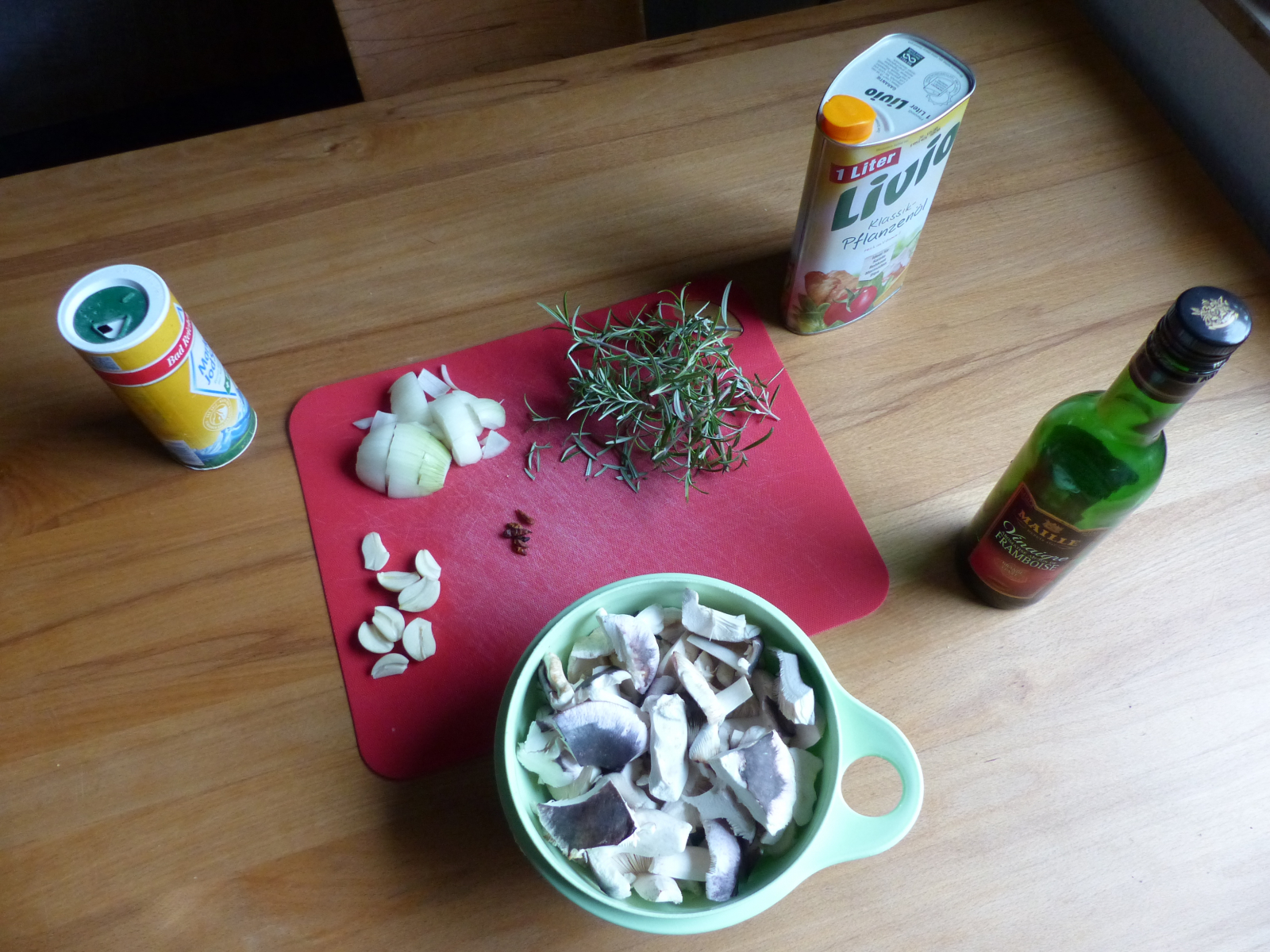 Zutaten: Pilze, Basilikum, Rosmarin, Knoblauch, Zwiebeln, Chili, Öl, Essig, Salz