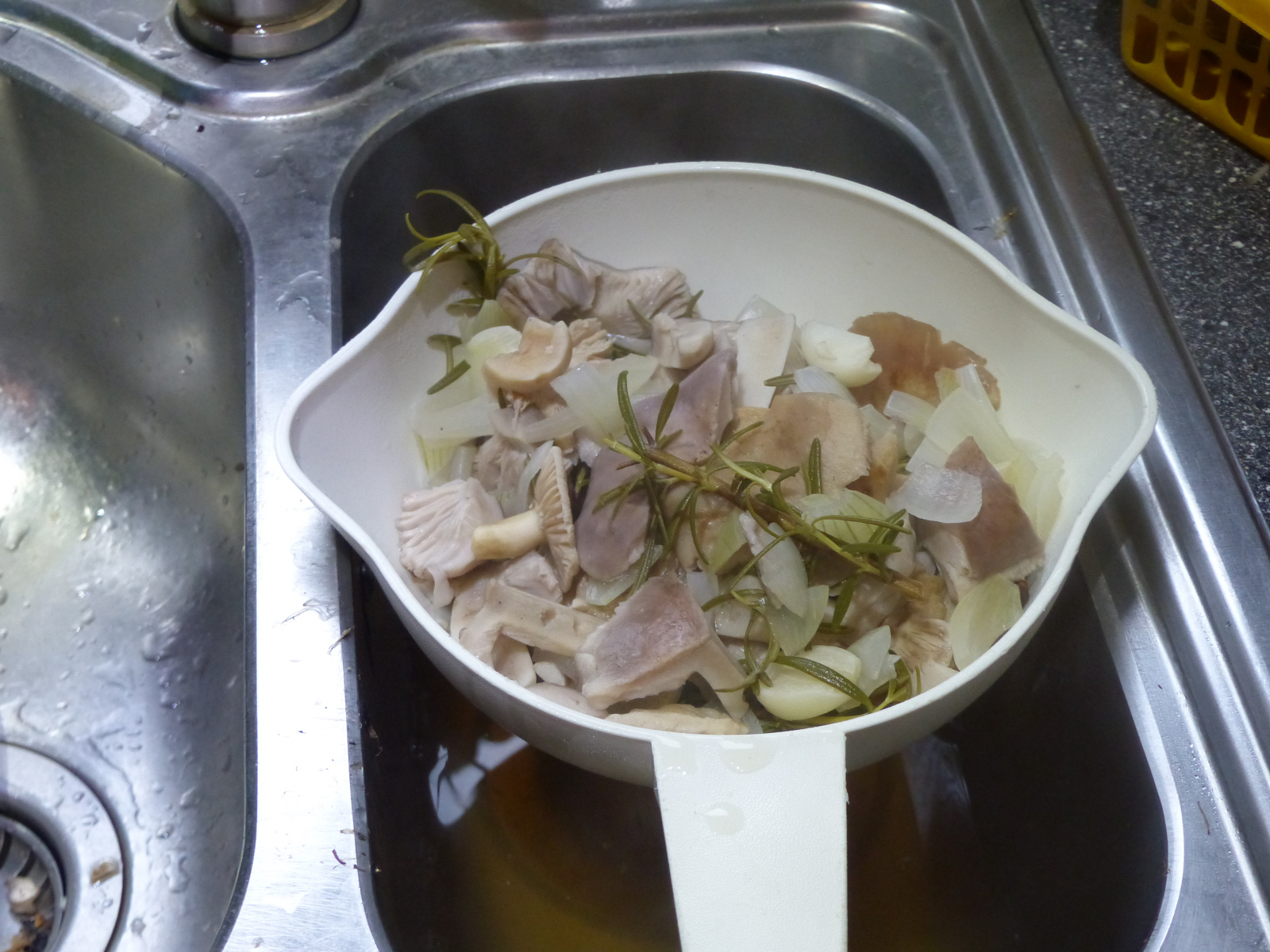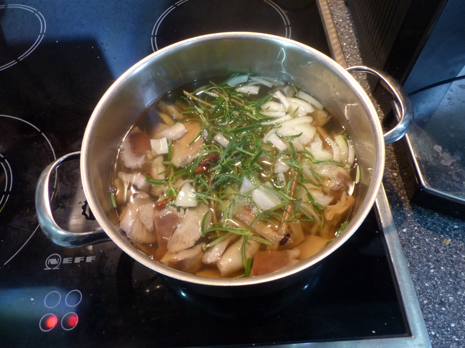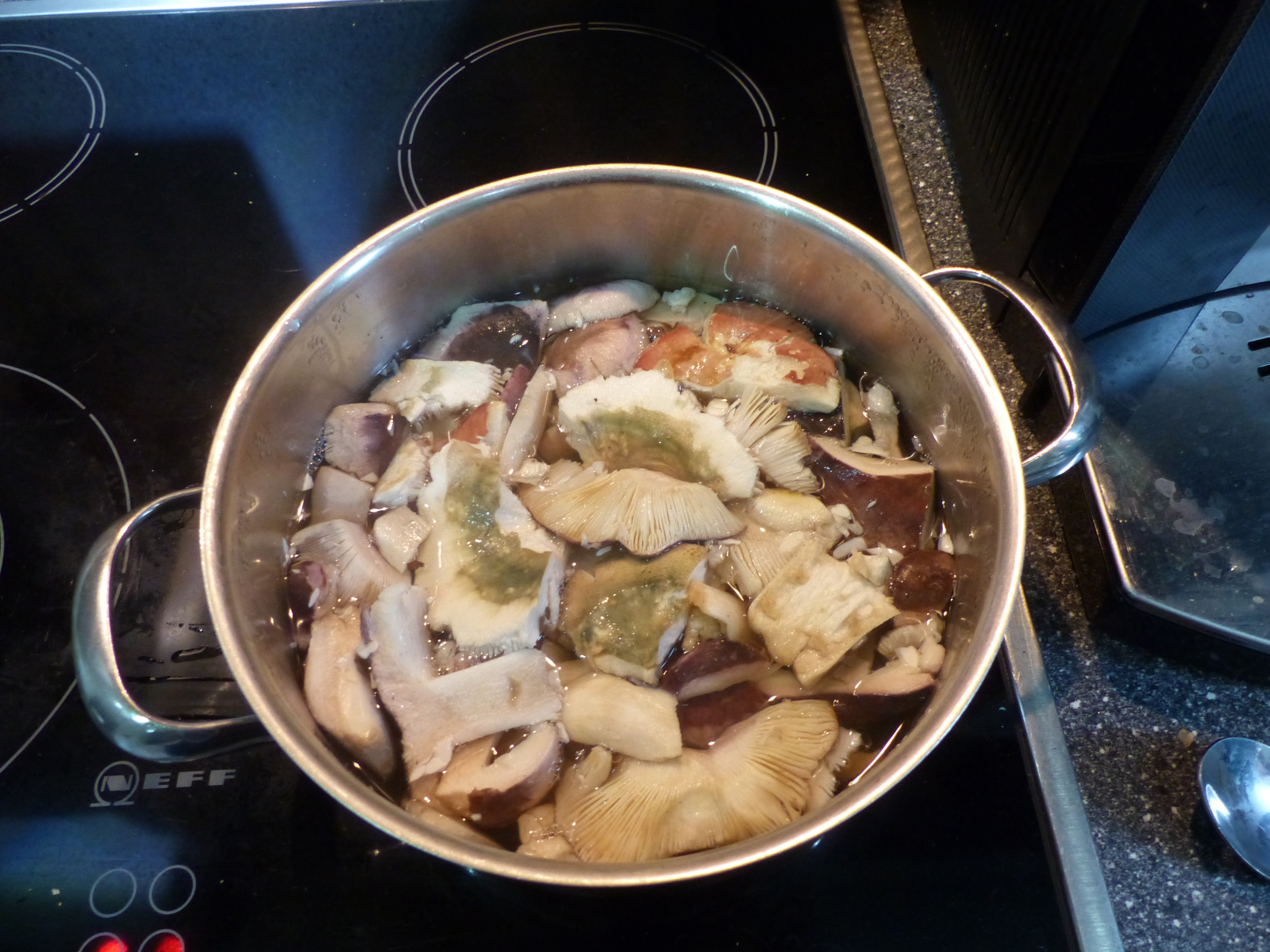 Pilze (hier Täublinge) in viel Salz kochen. Hier kann man auf die verschiedenen Pilze Rücksicht nehmen. Hallimasch oder Perlpilze würde ich 20 Minuten kochen, Steinpilze eher 5 Minuten und meine Täublinge 5 + 5 Minuten. Erfahrung mit den Champignons war, dass man mit Salz nicht sparen sollte. Im Internet kursieren Rezepte, dass man die Pilze in einem Gemisch von Essig und Wasser kochen sollte. Erster Versuch war 1:1. Viel zu viel Essig! Jetzt habe ich Wasser mit einem Schuss Essig genommen.