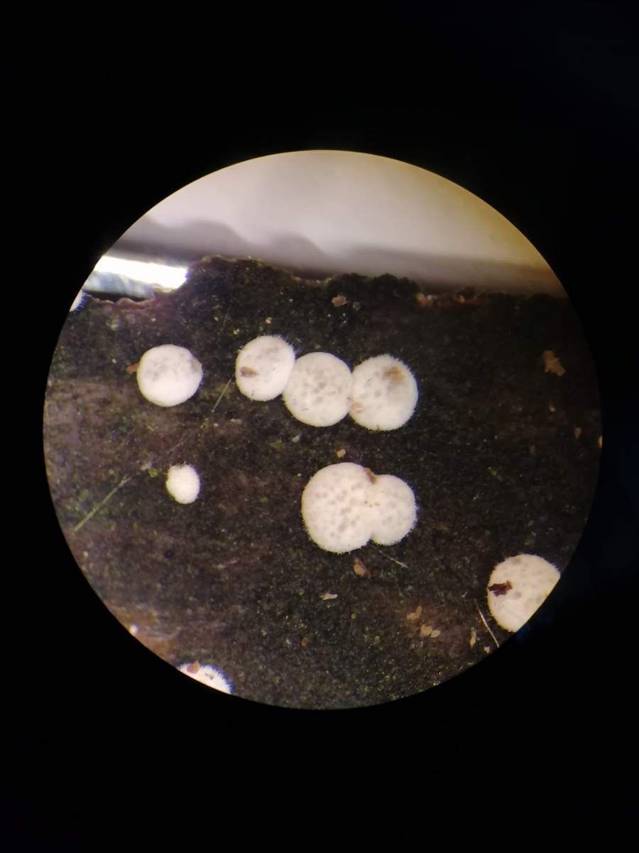 Ich habe heute diesen Pilz auf morschem Holz gefunden. Der orange Becherling ist Orbilia leucostigma mit C-förmigen Sporen. Was mich interessiert ist der gelbliche Pyrenomycet. Bessere Bilder krieg ich leider nicht hin.