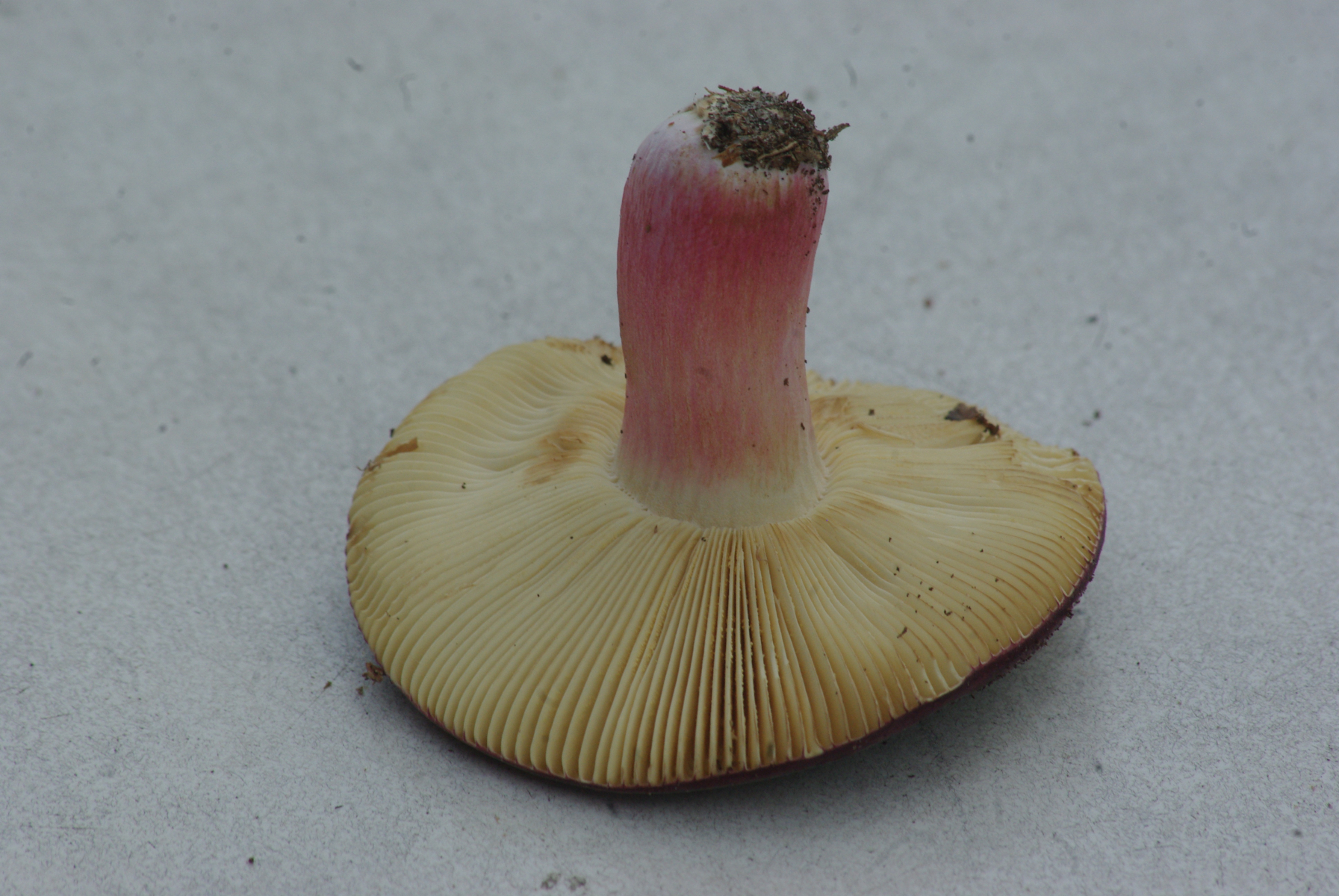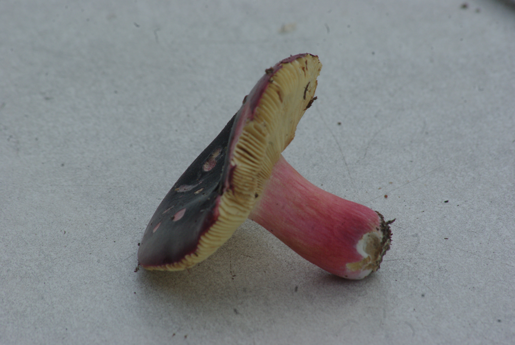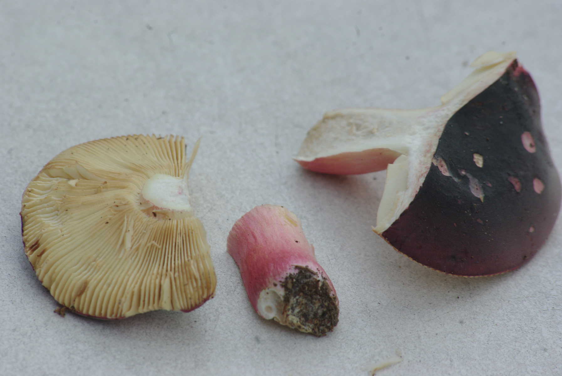 1) Russula cf. amoena, dunkler purpurroter Hut, Stiel ungleichmäßig rosa gefärbt, Standort an Fichte und Kiefer, Geruch leicht fischig, Geschmack mild, unauffällig, Sporenpulver hellgelb.