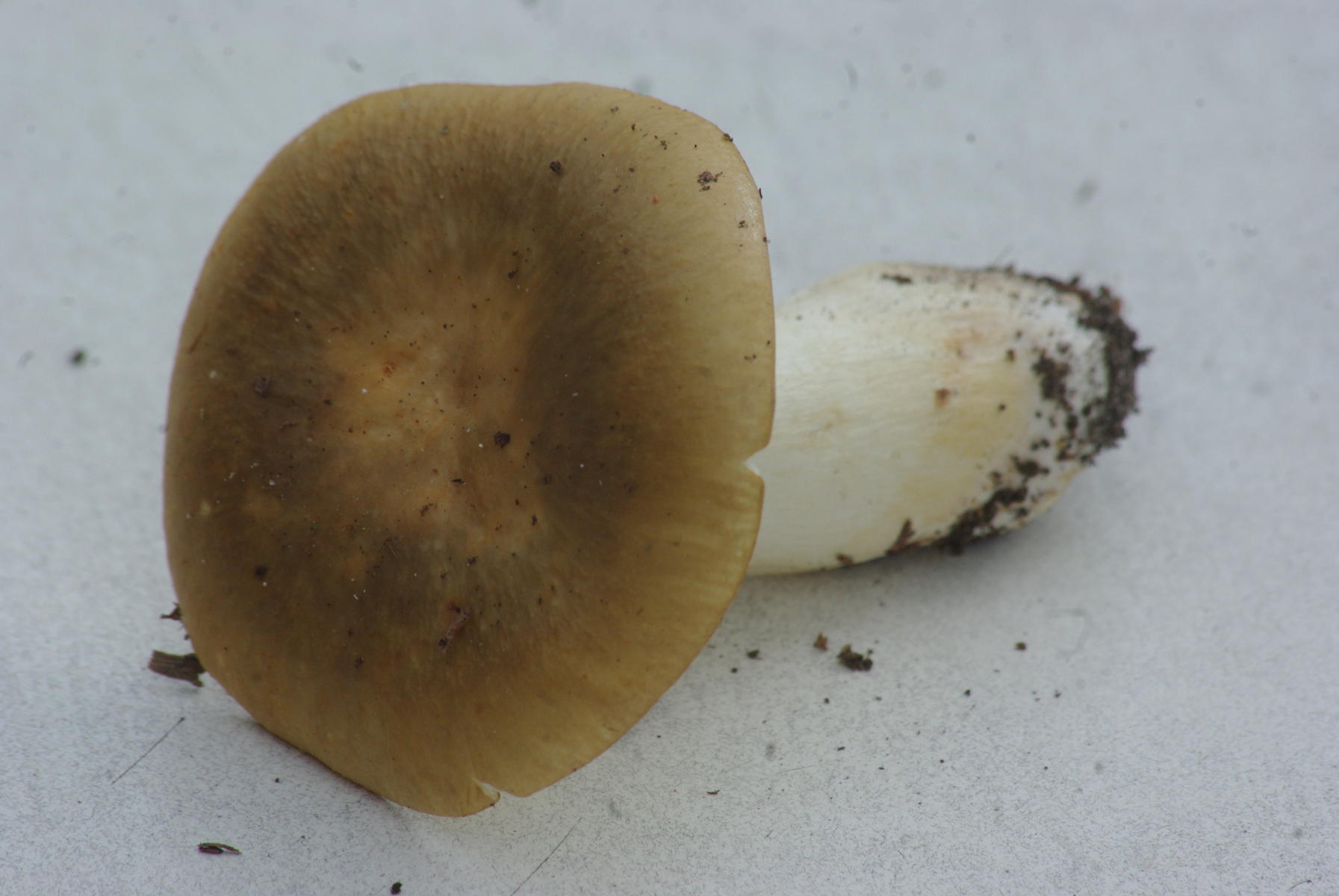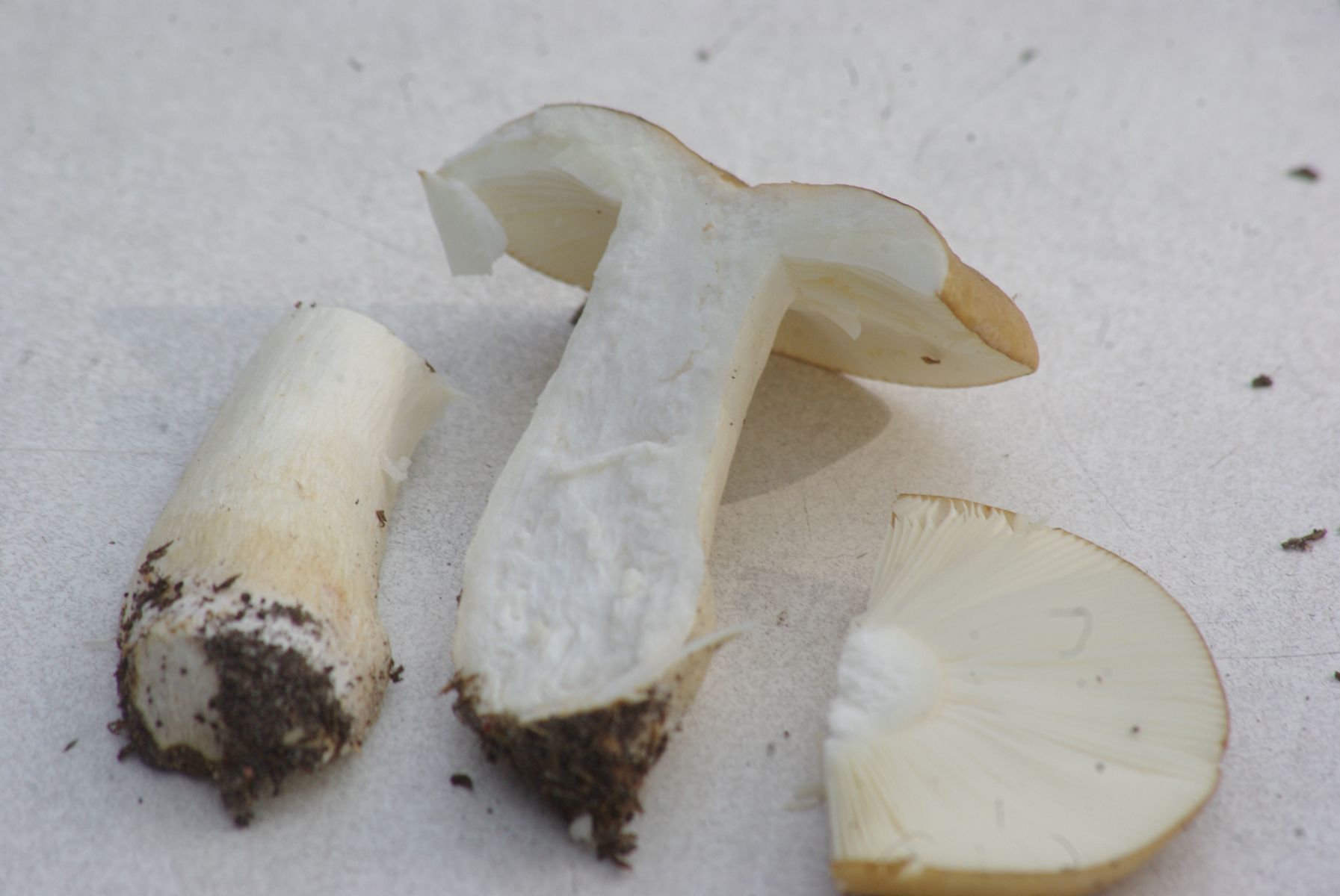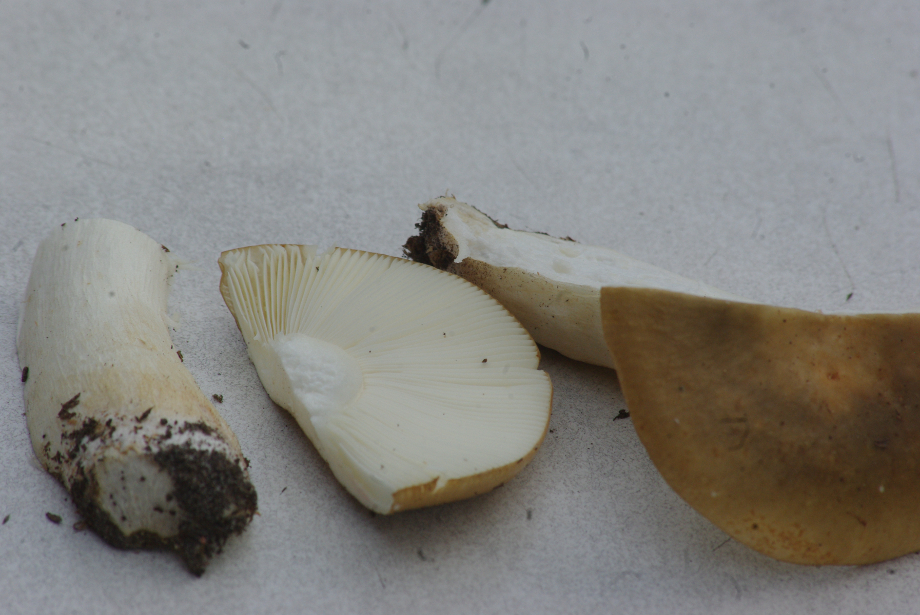 2) vielleicht Ockertäubling, Hut - dunkel ockerfarben, Stiel weiß, Geruch unauffällig, Geschmack leicht scharf mit bitterem Nachgeschmack, Sporenpulver weiß, Standort an Fichte und Kiefer.