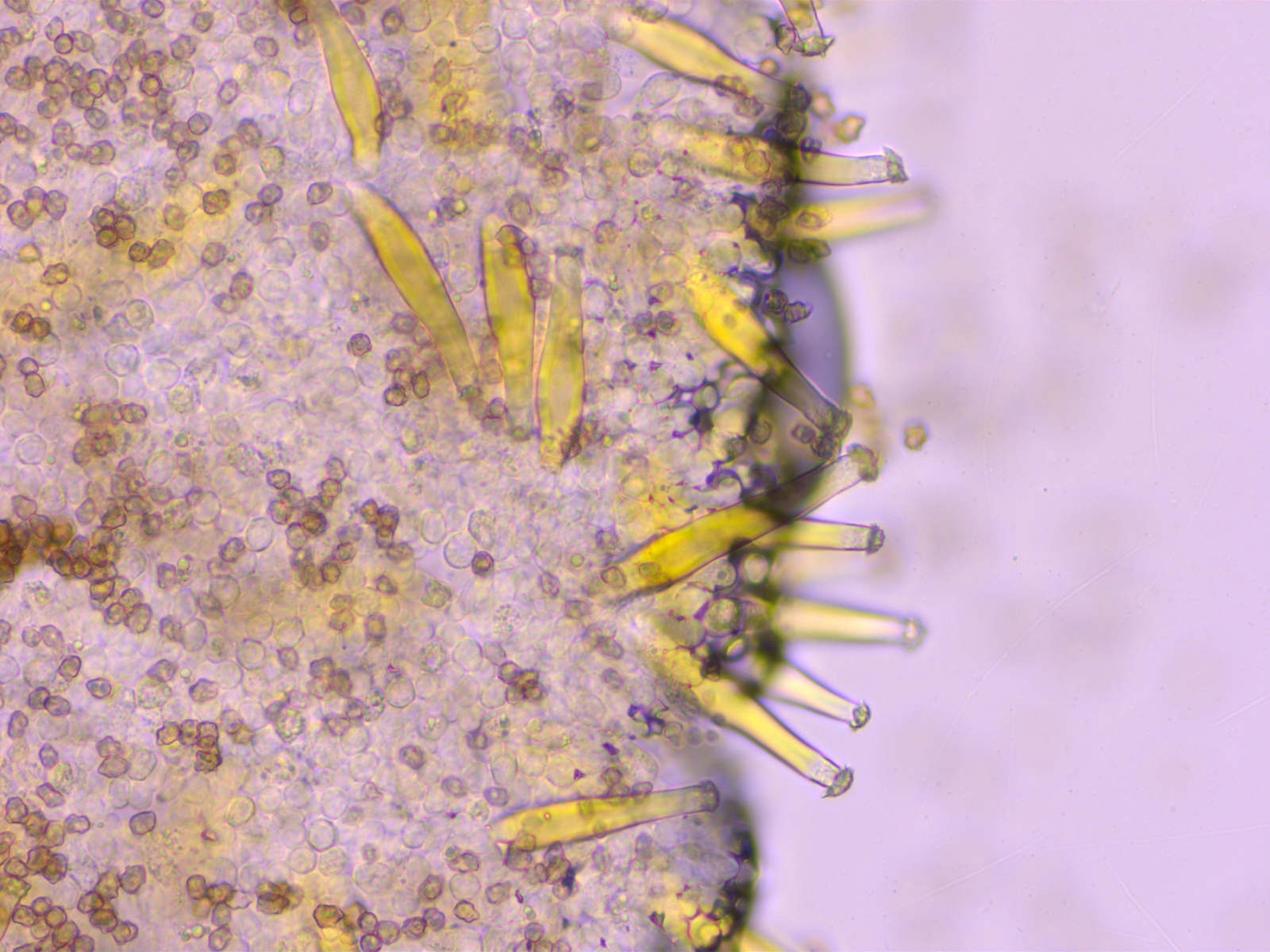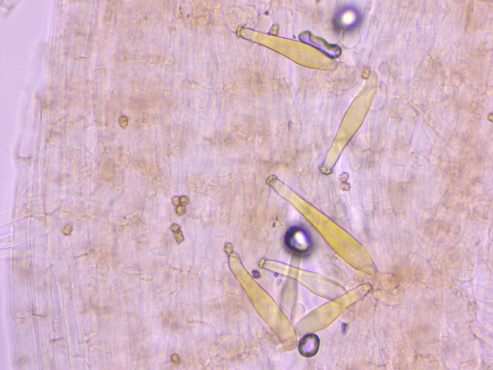 Zystiden: Leuchtend gelb in KOH, sehr schlank, etwa 40-50x8-10 µm