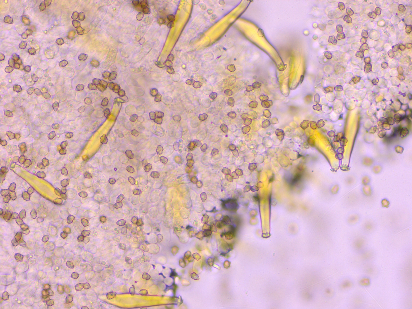 Zystiden: Leuchtend gelb in KOH, sehr schlank, etwa 40-50x8-10 µm