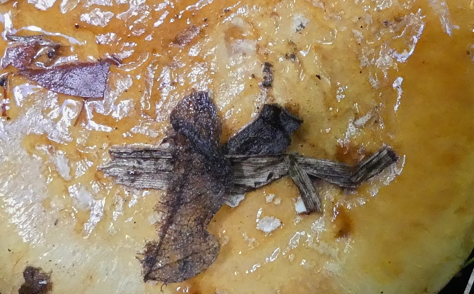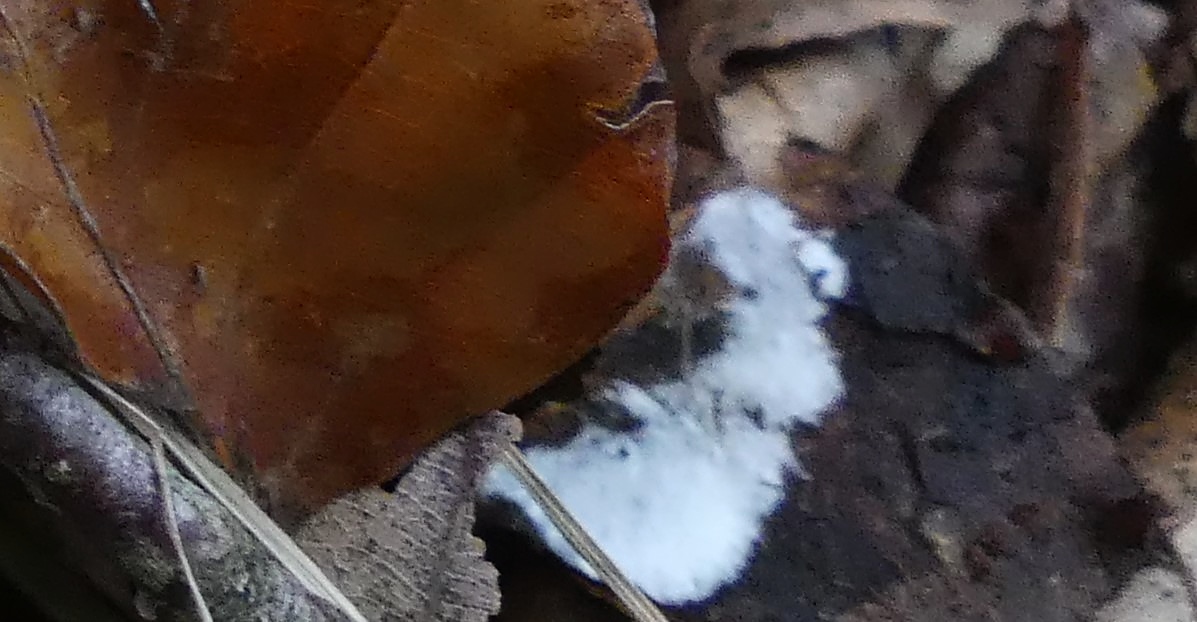 Aber jetzt zu den Velumflocken - Du könntest Recht haben! Nachfolgend eine Vergrößerung. Das Weiße unter dem Blatt scheint mir dagegen etwas anderes zu sein - auch hier eine Vergrößerung wobei man nicht wirklich erkennen kann was da auf der vermutlichen Rinde ist.