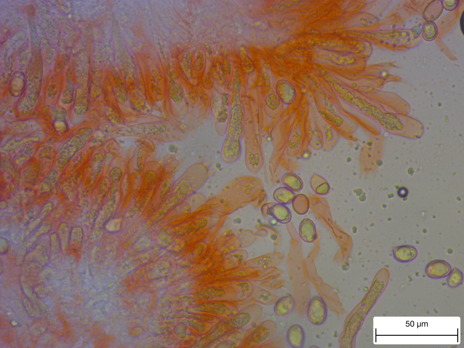 • Moin zurück, Schupfi, ein paar Merkmale passen, andere nicht. Zum Schleimigen Wurzelrübling würden zwar die Sporen passen, aber dafür fehlen die Schnallen, die der an den Basidien hat. Ansonsten sind die Mikromerkmale recht ähnlich. Die Huthaut war allerdings kein bisschen schleimig (obwohl die Wiese nass war), sondern ganz glatt und fühlte sich wachsartig an und es fehlt jeder Ansatz von den typischen Gruben. Das was du auf dem 3. Foto siehst sind durchscheinende Lamellen.