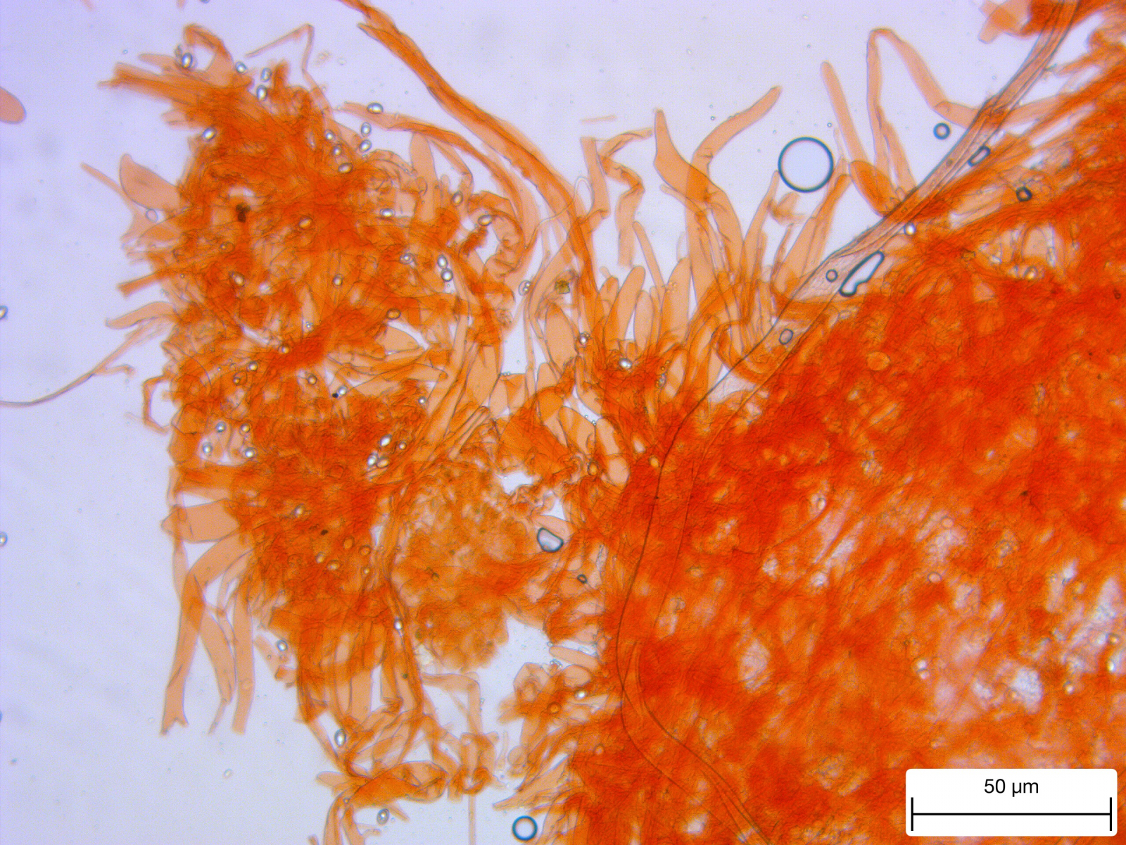 • Hmmm, das sieht mir irgendwie zu hyphig und nicht zellig genug aus. Ist natürlich die Frage, ob du da jetzt einfach nur Hutfleisch erwischt hast oder ob wir hier wirklich Huthaut sehen. Mit getrockneten Pilzen habe ich wenig Erfahrung, da ich meistens frisch mikroskopiere. Aber ich meine, daß sich die Xerula-Huthaut beim Frischpilz relativ gut abziehen ließ.