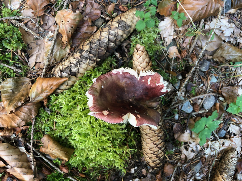 8b Dann fand ich zwei Täublingsarten im Wald, die es vorher nicht gab und die ich nicht kenne. Die erste - Nummer 8 - war sofort sehr scharf. Geruch ja, aber ich kann ihn nicht beschreiben. Auf alle Fälle recht angenehm. Ich habe ein Exemplar mitgenommen. Vielleicht bekomme ich noch etwas mehr heraus.