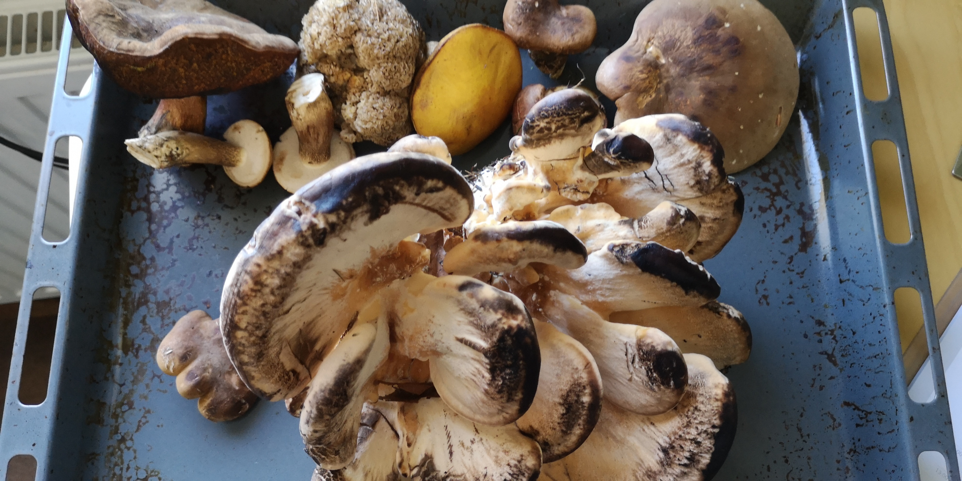 Hallo duri, die Büschel oben sind Hallimasch. Richtig zubereitet und wenn man sie verträgt, gute Speisepilze. Dann hast du unten den Riesenporling, das ist der, der so schwärzt. Aber du hast auf dem Blech auf alle Fälle Röhrlinge, die so alt sind, dass ich gar nicht genau erkennen kann, was das mal war - fällt wohl unter Gammelpilz und zwei gallenbittere Gallenröhrlinge. Was sich unter den braunen Hüten rechts verbirgt, kann man nicht sagen und der helle kann ein Goldröhrling sein, aber auch etwas ganz anderes. Zweites und drittes Foto? Hmm.