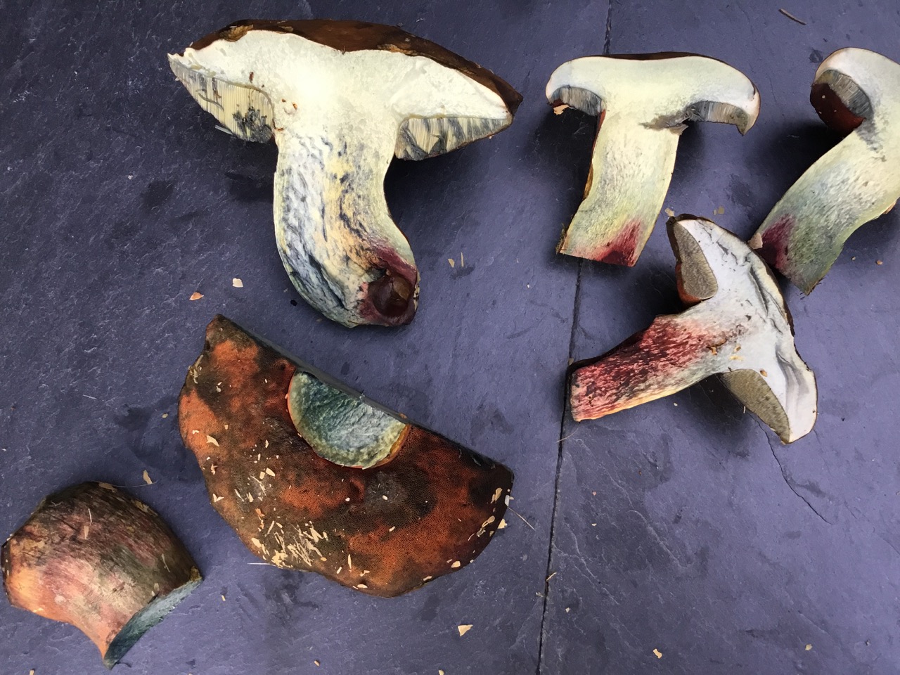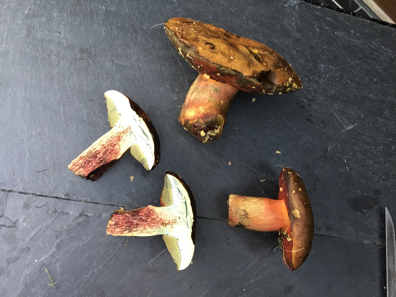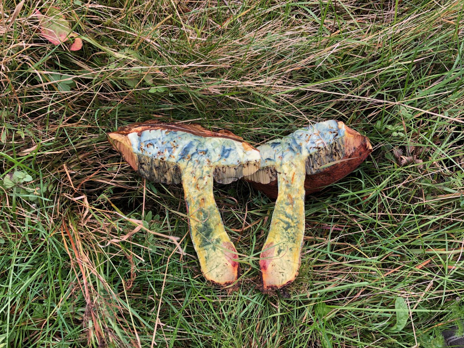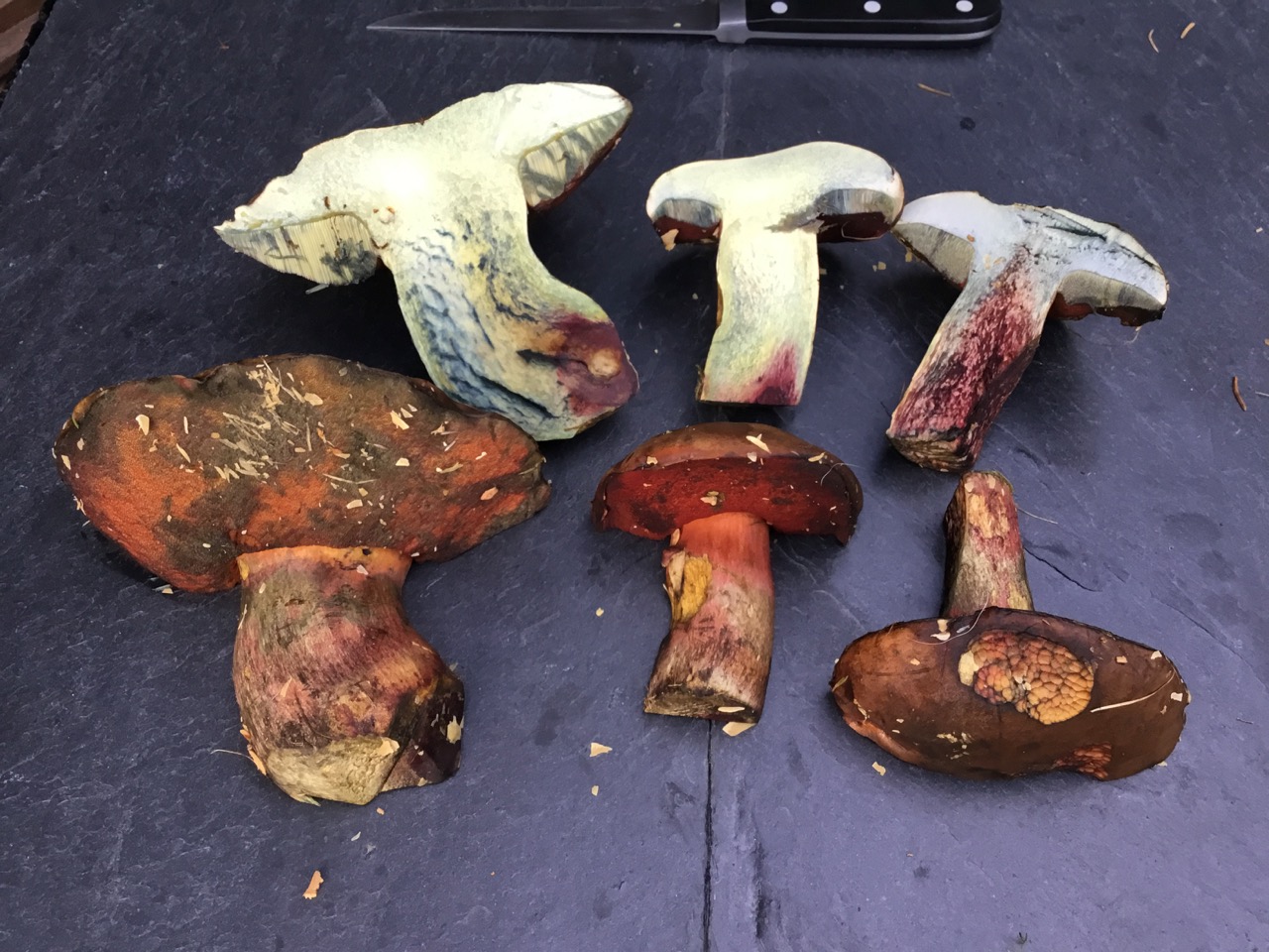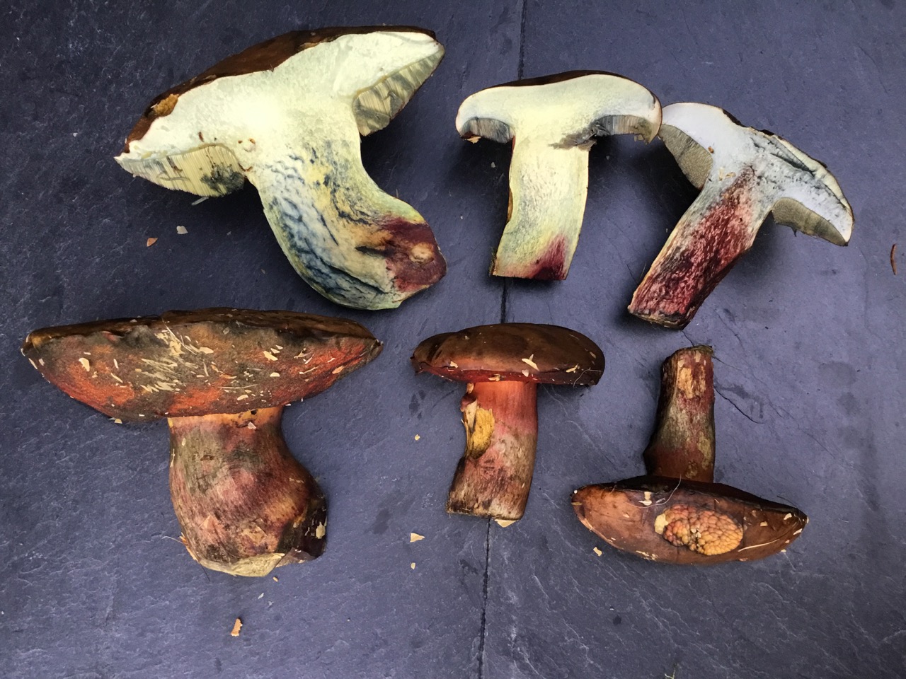 bis zum Durchschneiden glaubte ich an einen ganz normalen Flocki. Doch der blaute nicht übermäßig, wurde dafür rot im Stiel. Ich habe gelesen dass Suilletus queletii das tut. Aber ich finde meine Hexen sehen ansonsten aus wie ganz normale Flockis. Was ist das nun und dürfen die das?