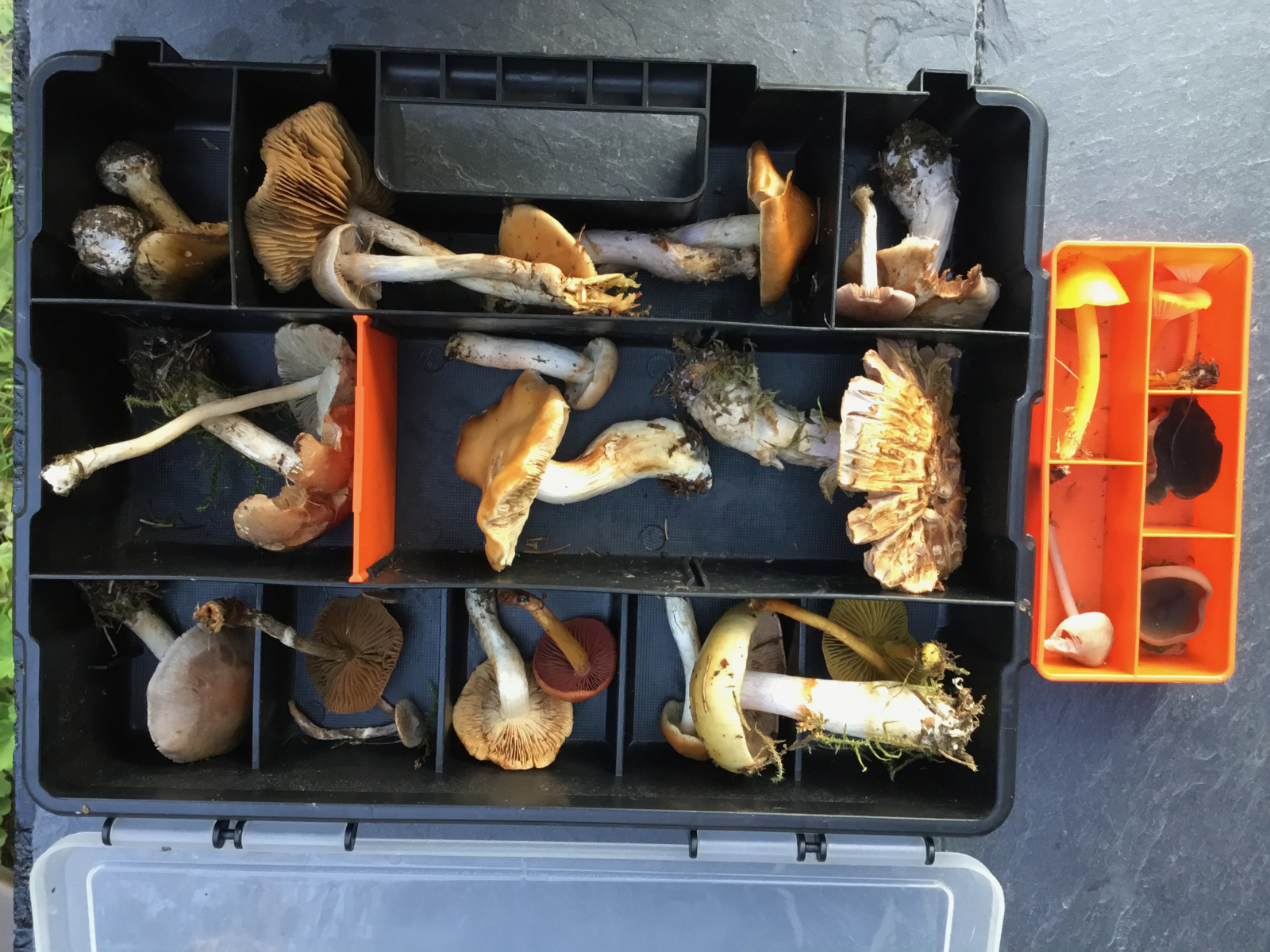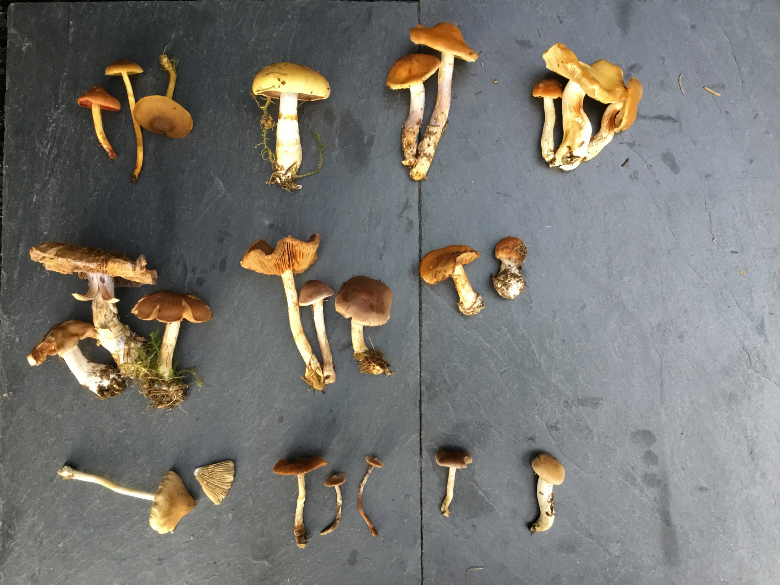 Dann war Ruhe im Karton Handy. Zu Hause hatte ich die Pilze auf den Tisch gelegt, um die Vielfalt zu zeigen, die innerhalb von 2 Stunden in mein Kästchen wanderte - neben einigen Speislingen und ein paar anderen Arten, die nicht in die Gattung Cortinarius gehören. Pilzstress!