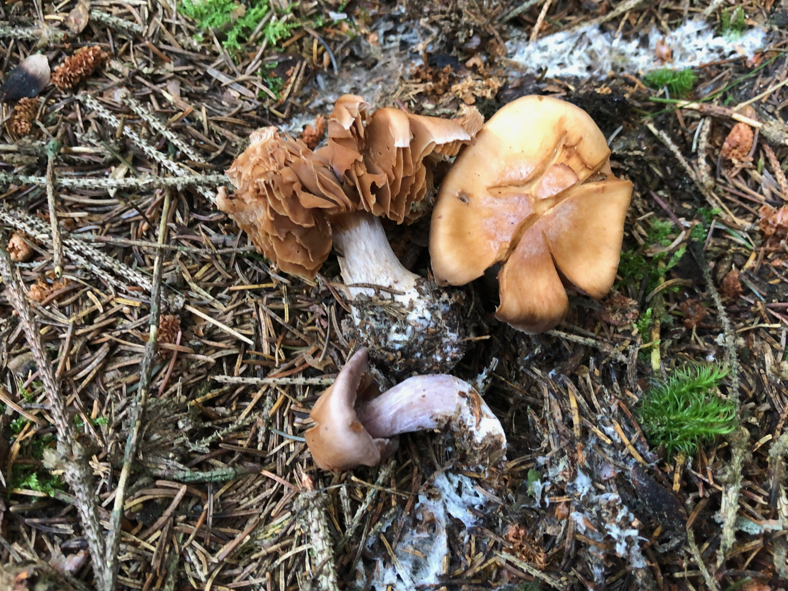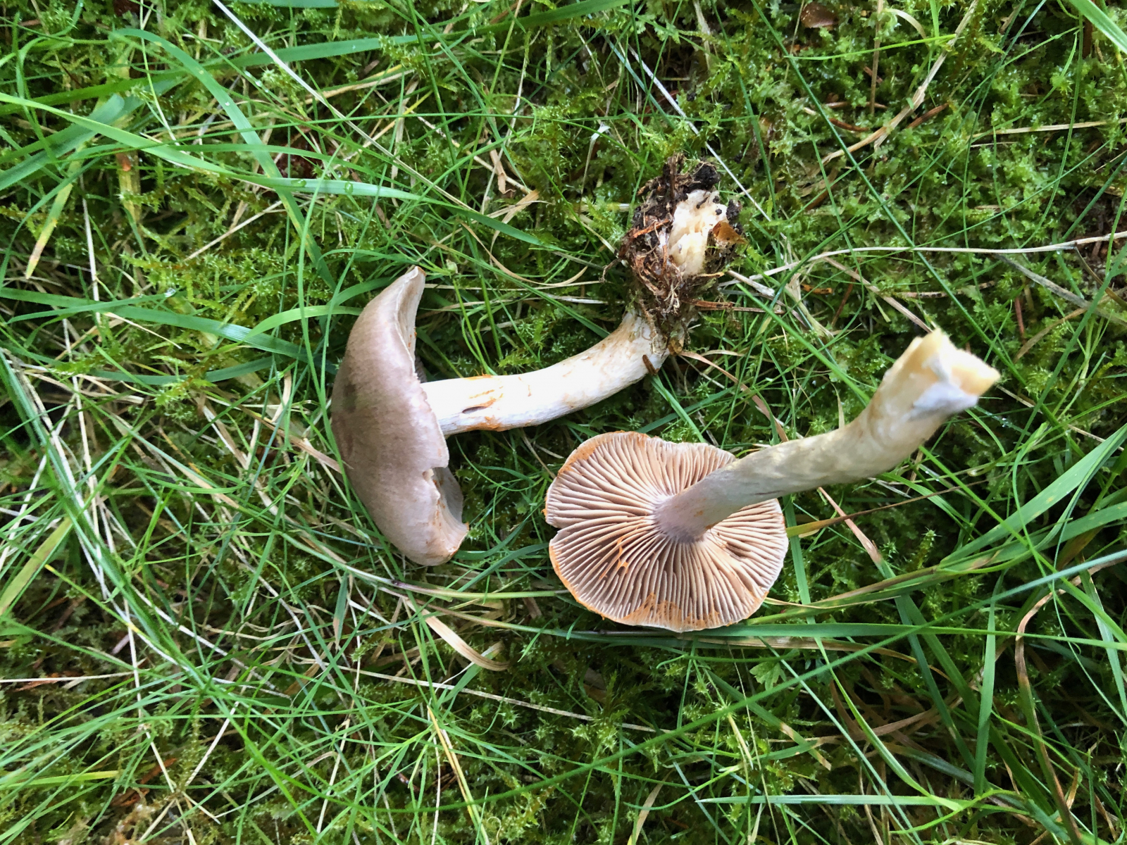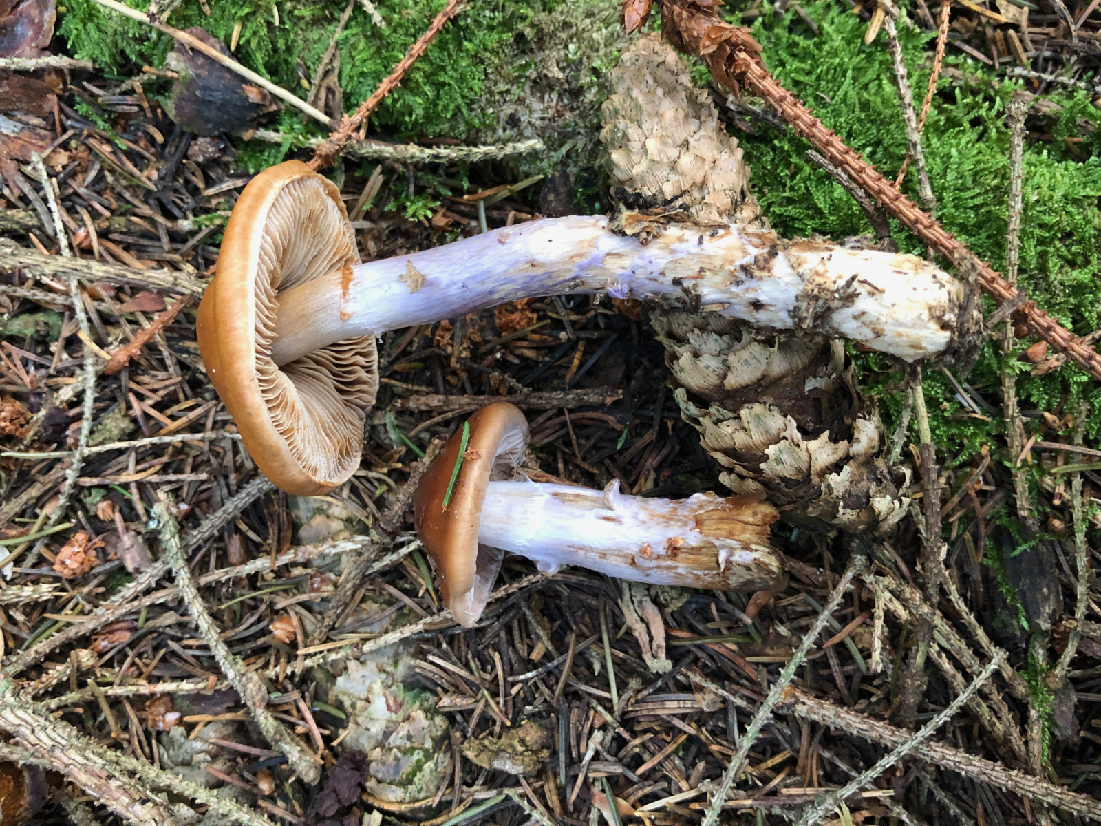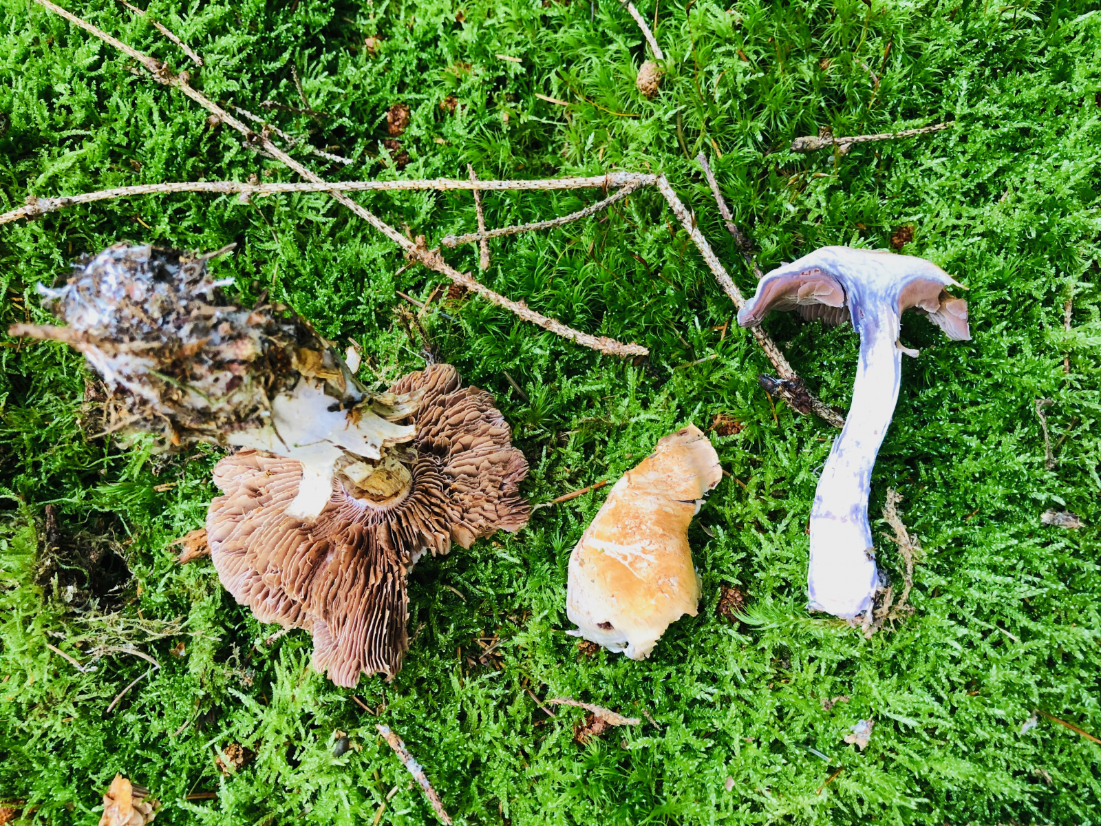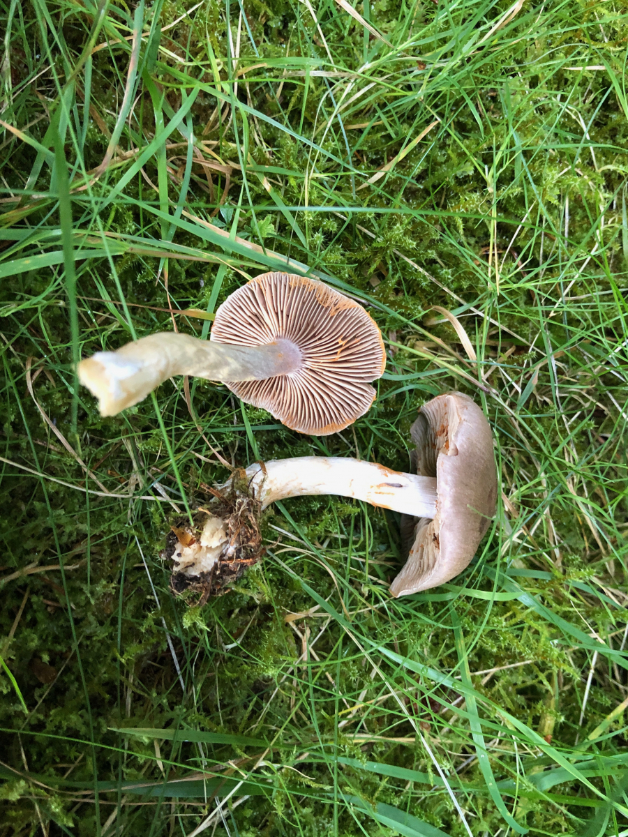 3 Vermutlich trockenheitsgeschädigte Dickfüße. Nur welche? Eigentlich bin ich an diese Stelle gegangen, weil ich dort schon einmal Cortinarius traganus gefunden hatte. Aber der färbt ja safrangelb im Schnitt und nicht blau. Die Farben waren nicht ganz so schrill, aber deutlich blauviolett.