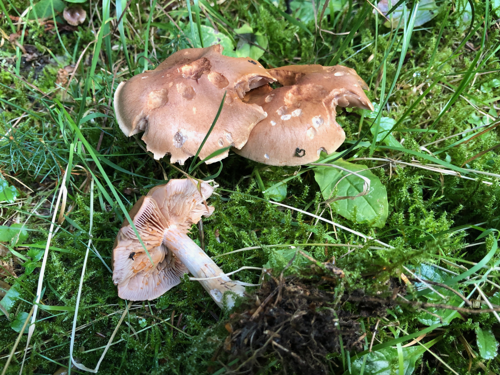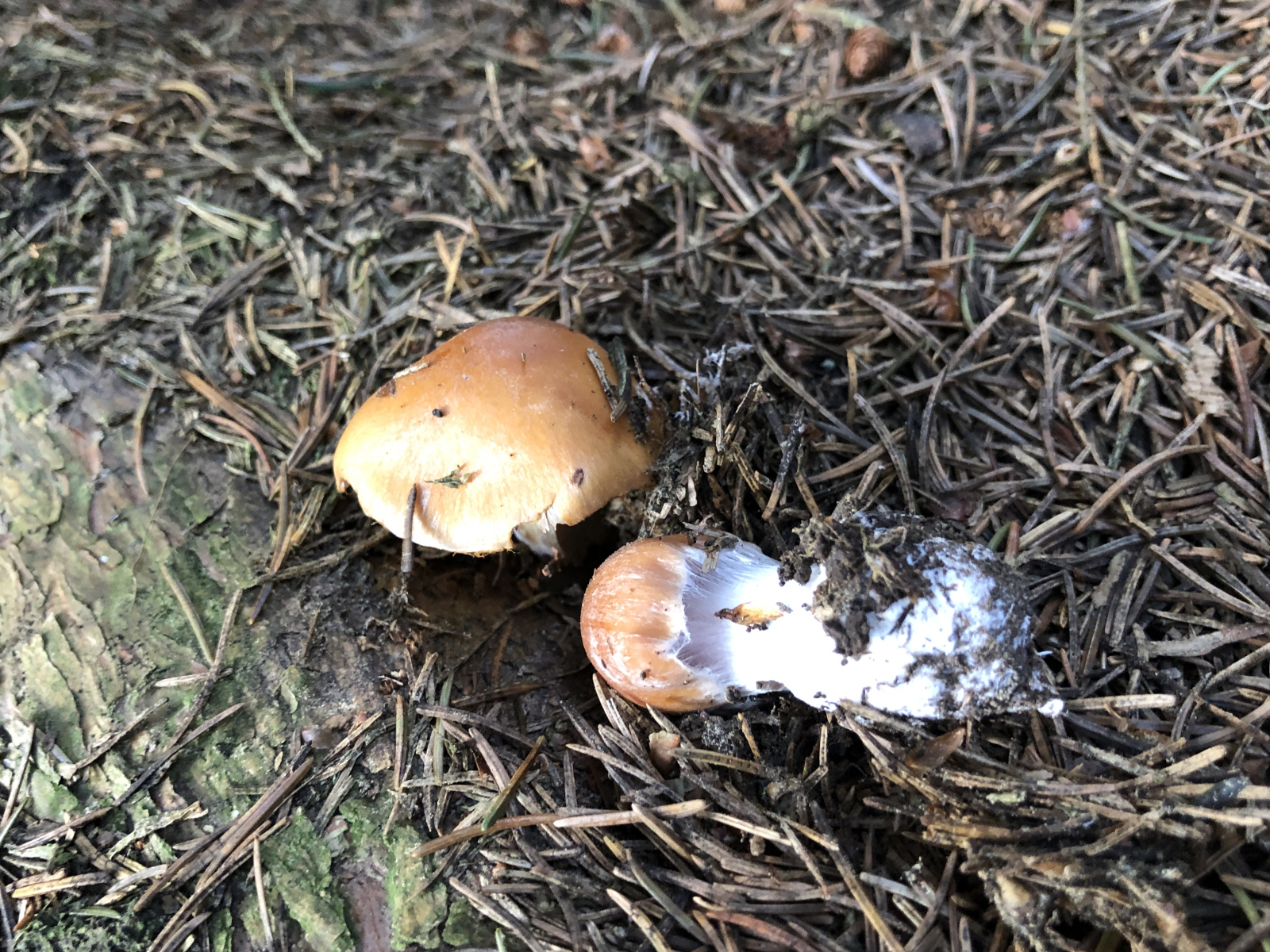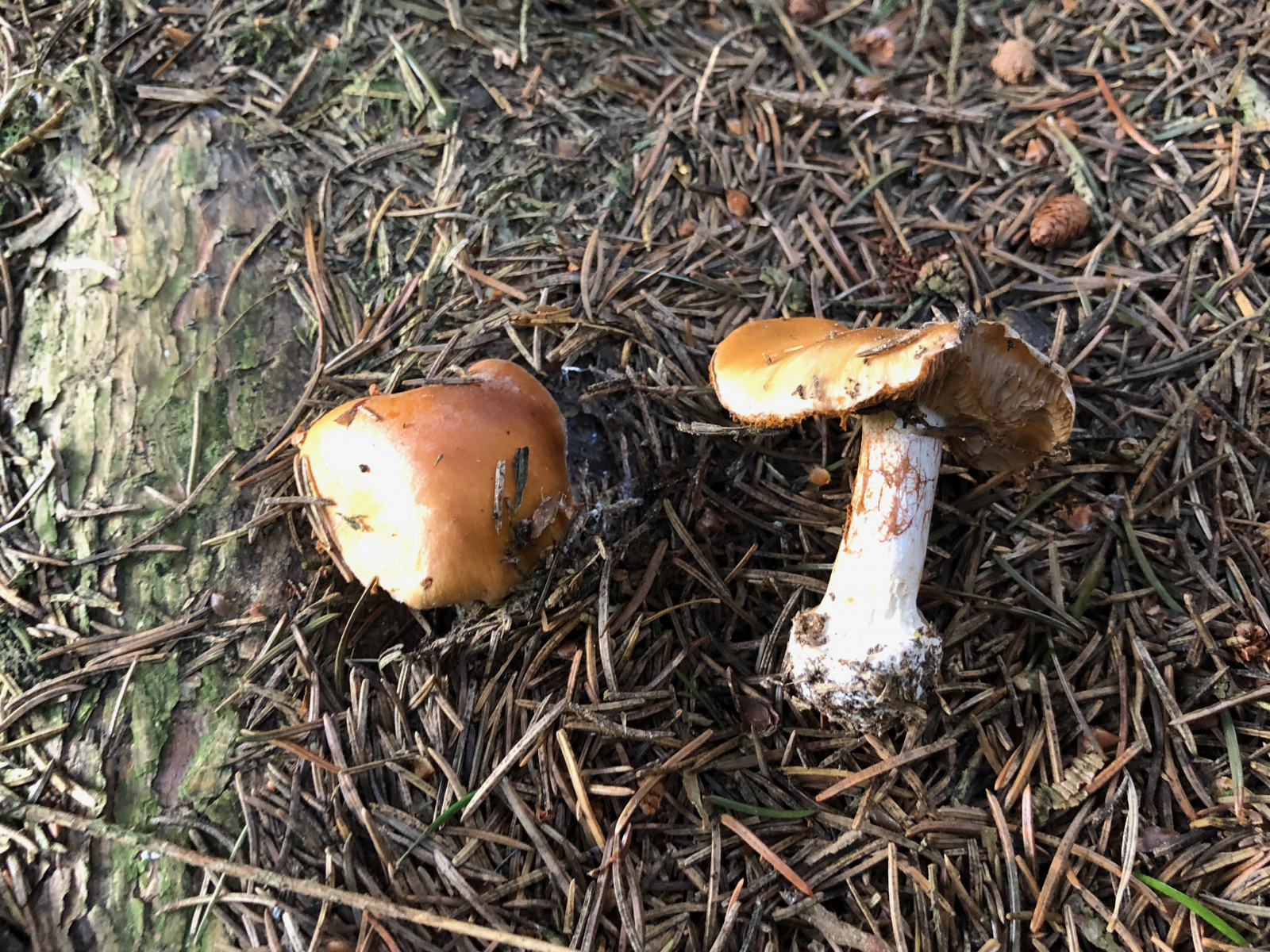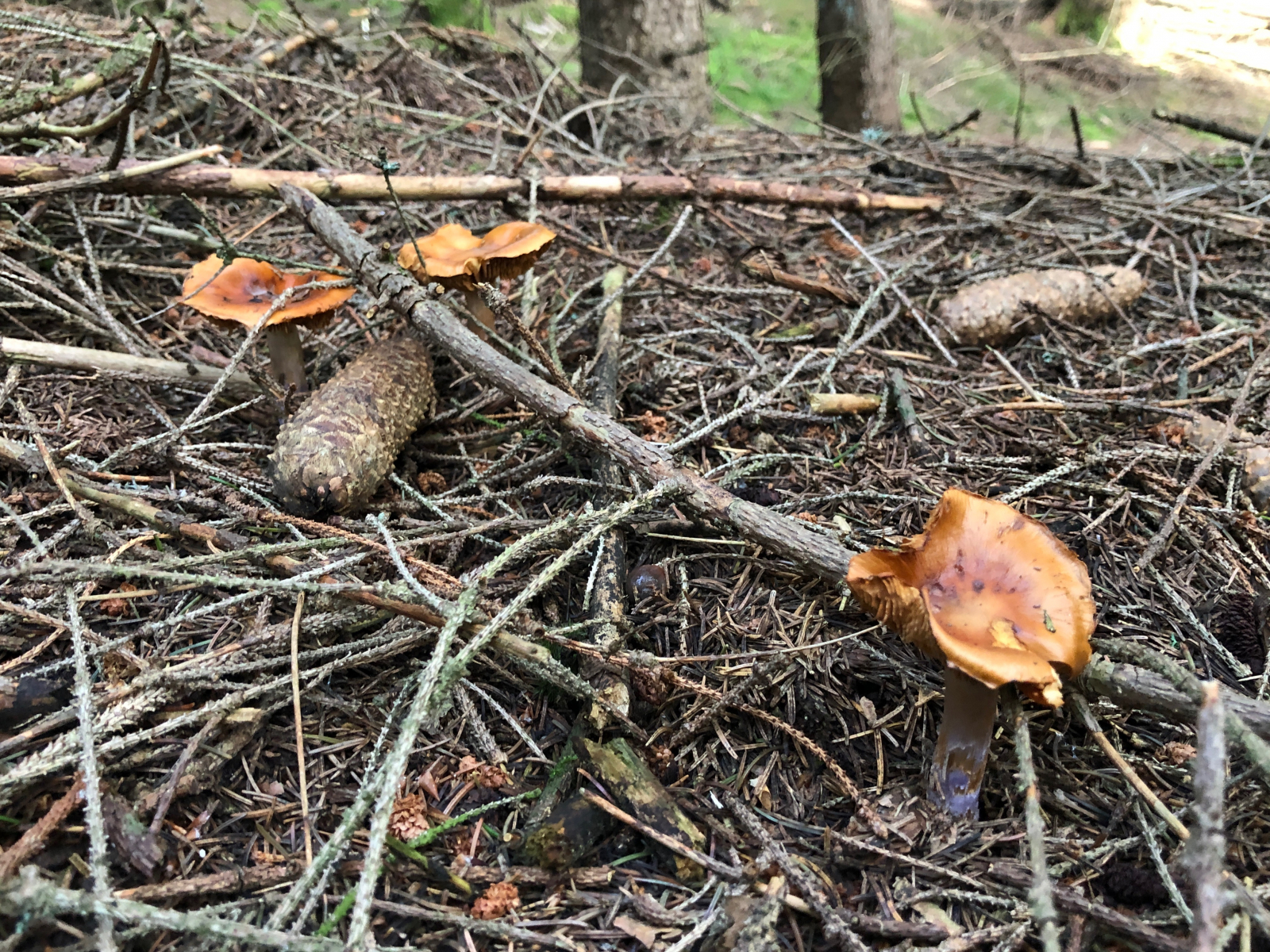 3 Vermutlich trockenheitsgeschädigte Dickfüße. Nur welche? Eigentlich bin ich an diese Stelle gegangen, weil ich dort schon einmal Cortinarius traganus gefunden hatte. Aber der färbt ja safrangelb im Schnitt und nicht blau. Die Farben waren nicht ganz so schrill, aber deutlich blauviolett.