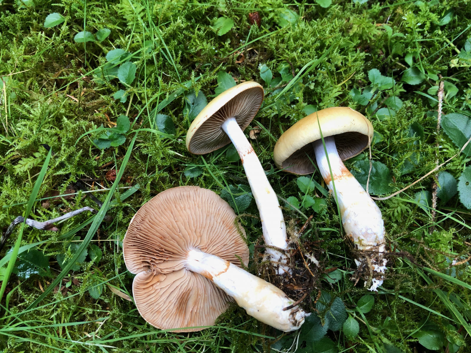 Oben links liegen zwei Hautkopfarten Cortinarius phoeniceus und Cortinarius cinnamomeus. Unten links dieser langstielige Risspilz, von dem ich aber noch nicht weiß, ob der auch so heißt. In der Mitte sind Cortinarius flexipes - Geraniengürtelfüße. Die beiden kleinen rechts unten lasse ich mal unbenamst.