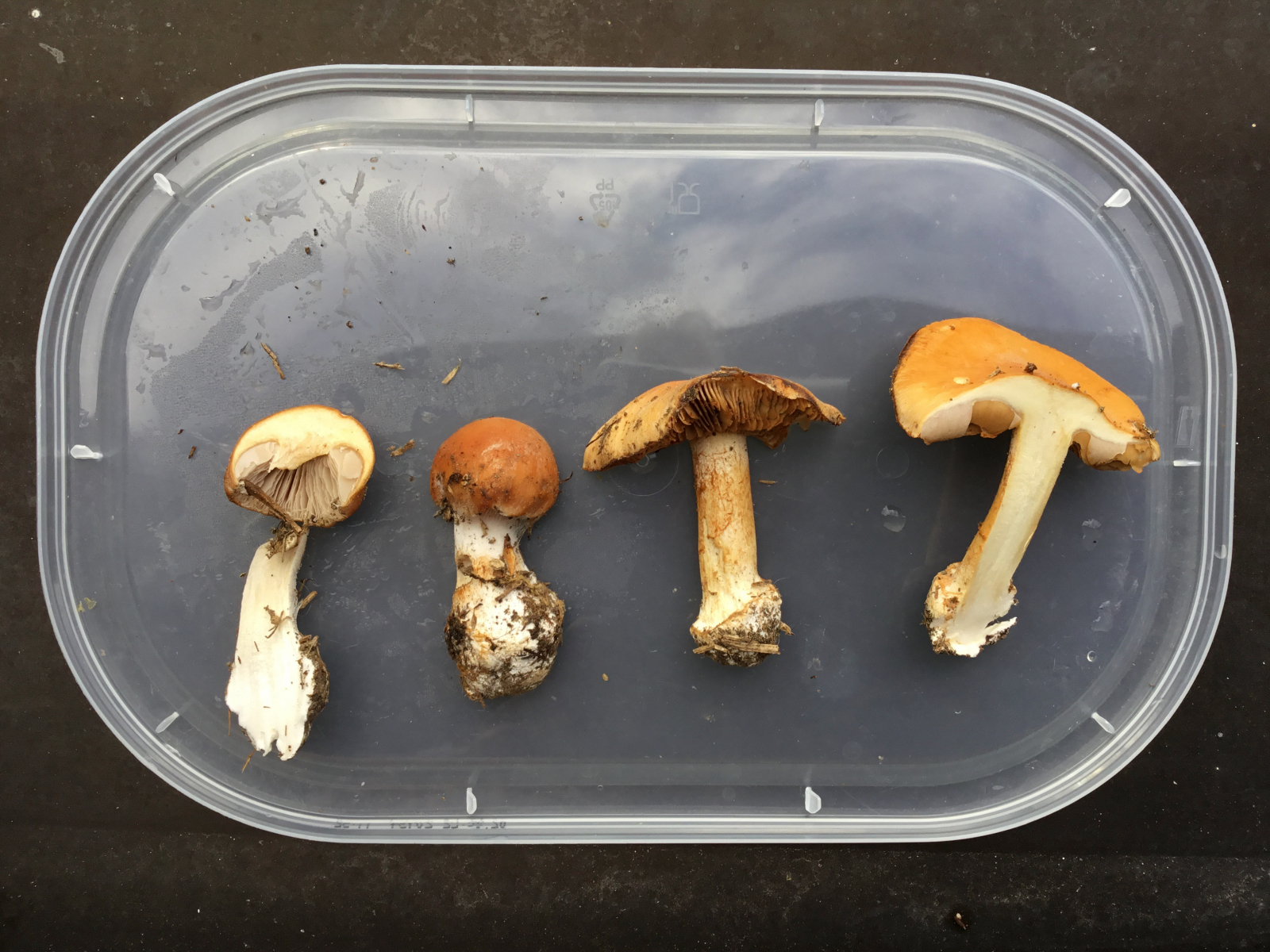 1. Im Köfferchen - ohne Einsatz- war die gesamte Schleierlings-Ausbeute. Ein langstieliger Risspilz ist auch dabei. Vielleicht lässt der sich relativ einfach bestimmen. Er ist ziemlich speziell.
