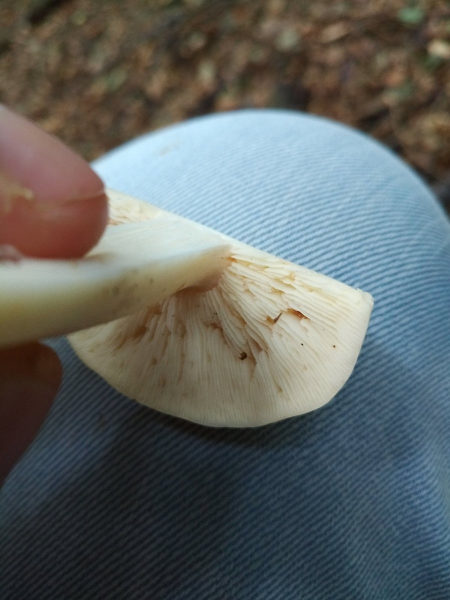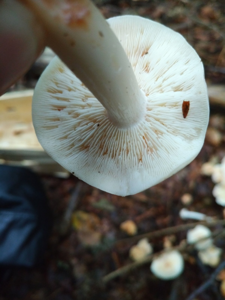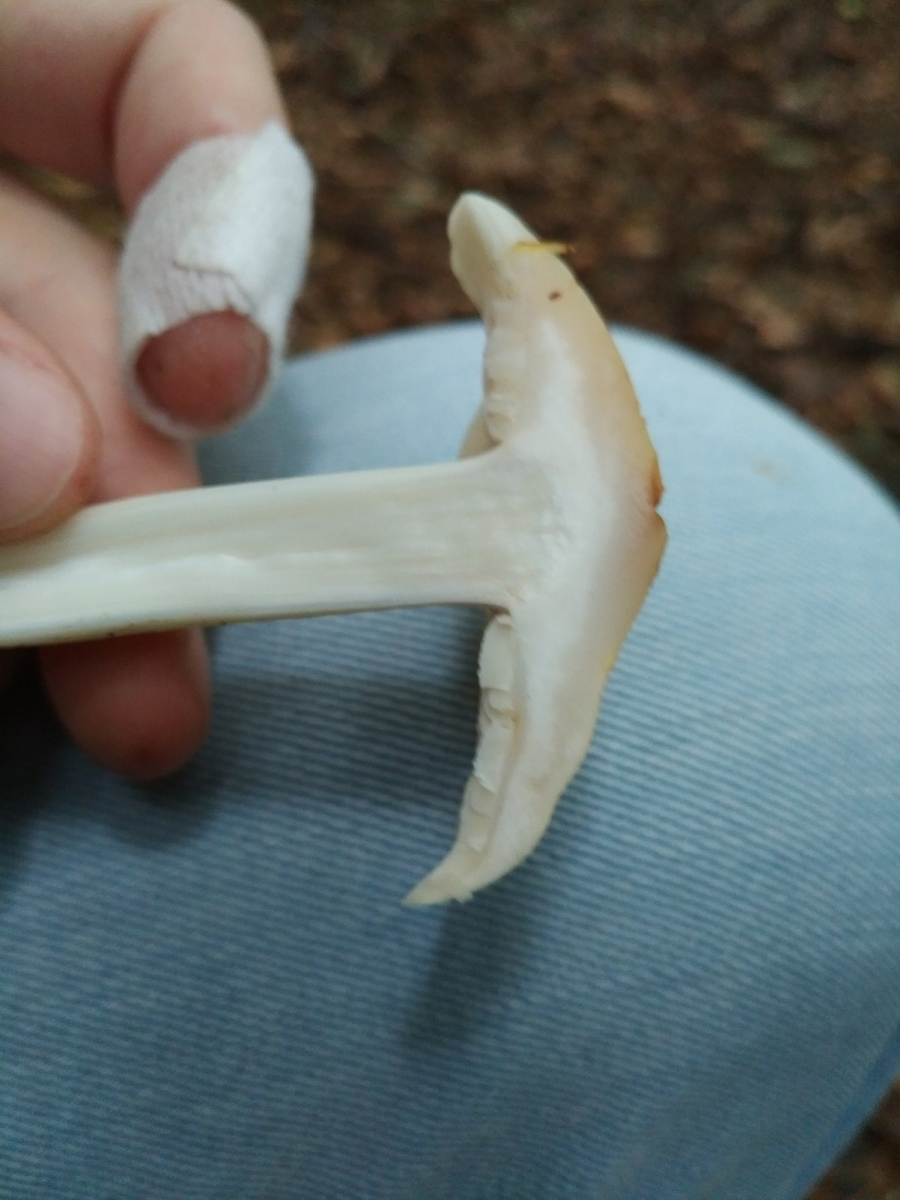 Lamellen mit leichtem Gelbstich und auf mich fast frei, wenn nicht ausgebuchtet angewachsen wirkend.