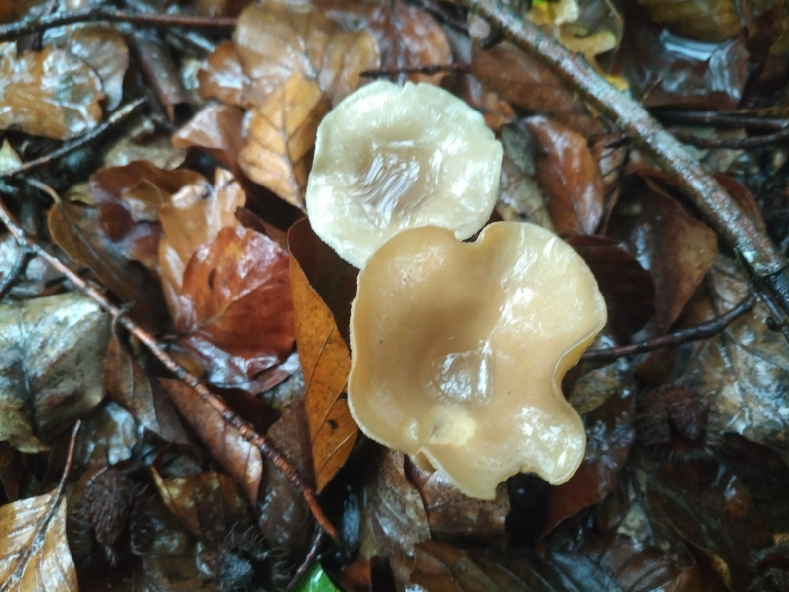 Die Hutoberflächenstruktur und das Farbspektrum sind ganz anders, der fehlende Hutbuckel ist ein weiteres Details und die Stieloberflächen nicht heller als die Hutoberfläche.Geruchlich scheint der ja zudem schwer einzuordnen zu sein ("Ammoniak" und "Bittermandel" liegen in meiner Nase doch schon sehr weit auseinander?), aber auch wenn der hier diesen aromatisch - süßlichen Geruch mit Bittermandelkomponente von Clitocybe gibba hätte, wäre es immer noch eine andere Art.