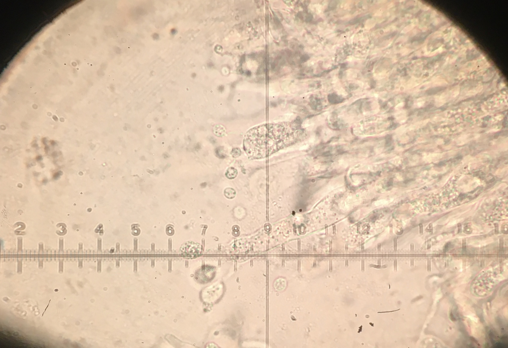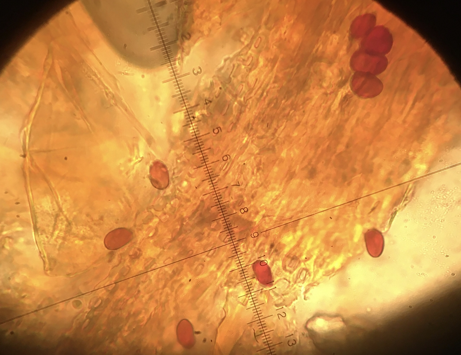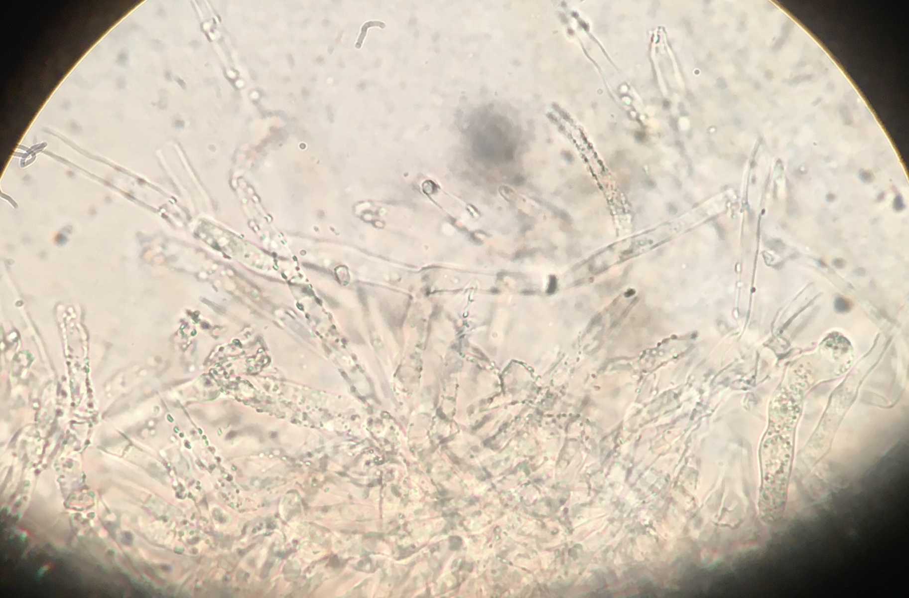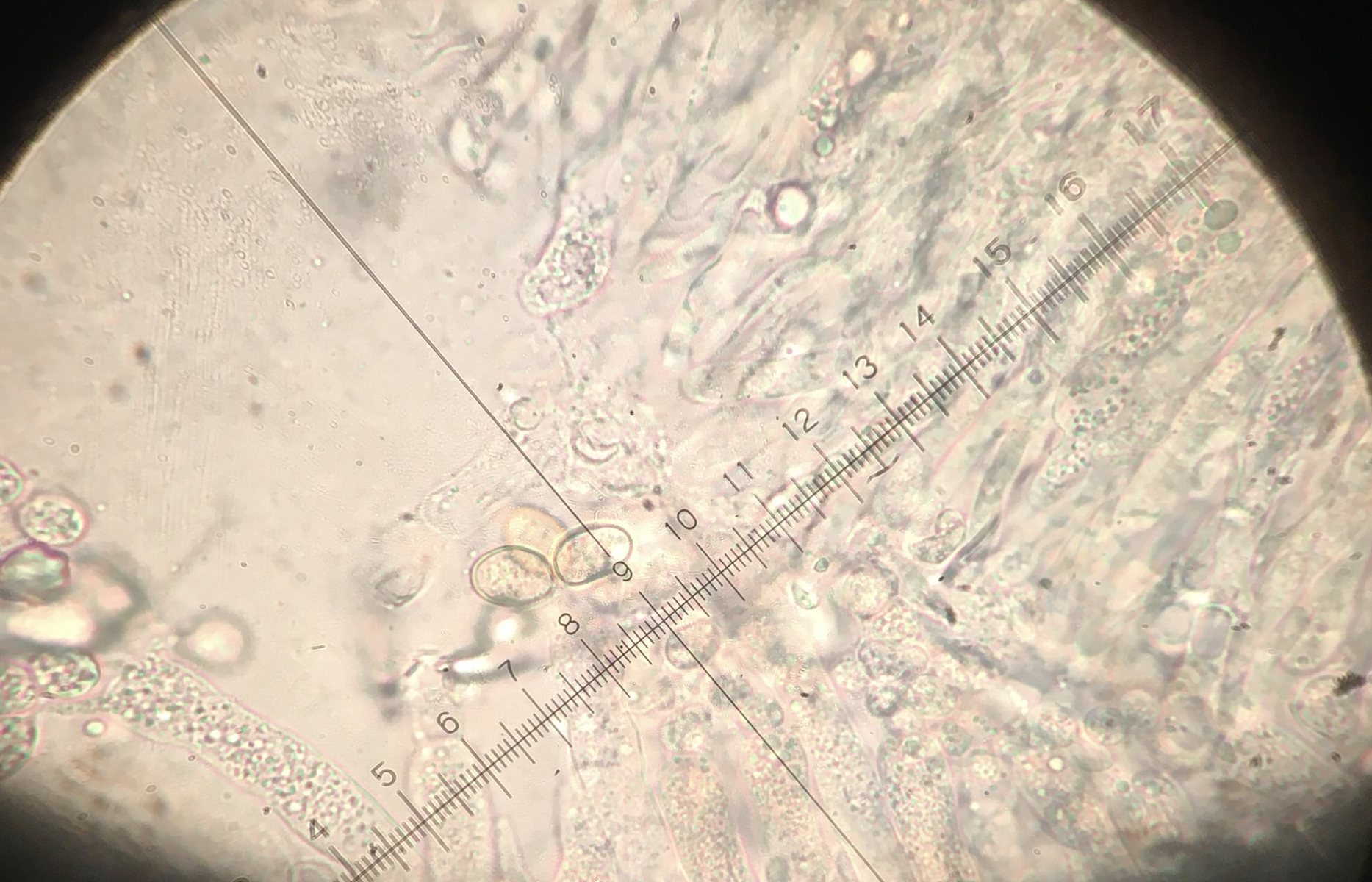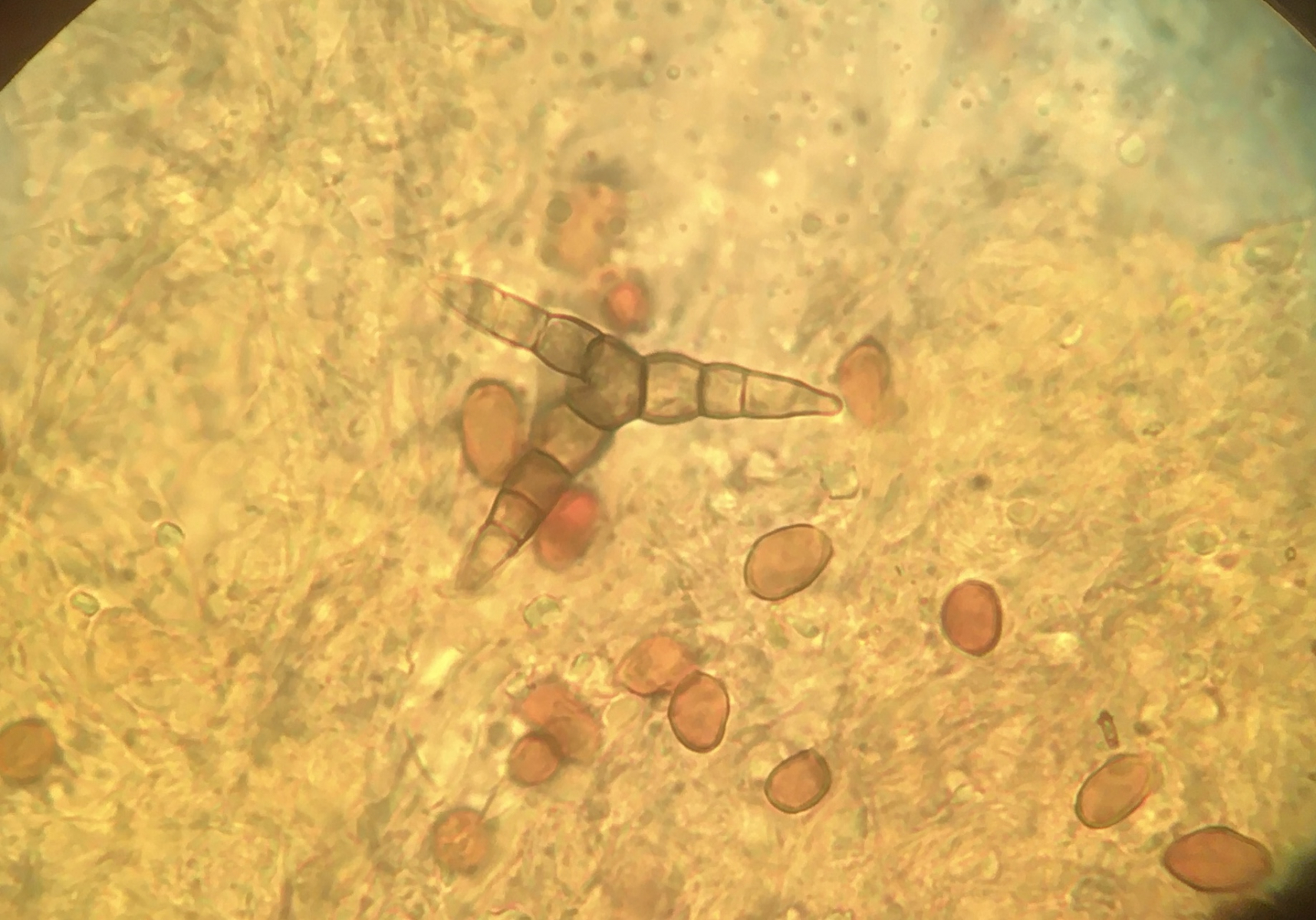 Ich würde jetzt vermuten daß das was Anamorphes ist, sieht jedenfalls nicht wie eine Asco- oder Basidiospore aus. Es gibt wohl Kernpilz - Anamorphen, die so oder so ähnlich aussehen können, aber davon habe ich leider keine Ahnung.
