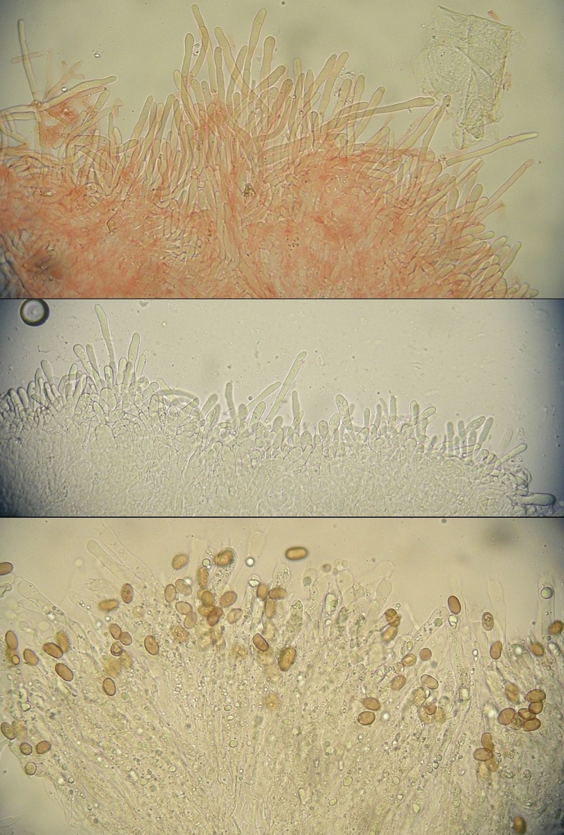 Am besten mal ein Präparat in melzer machen, dann könnte man erkennen ob's da schon einzelne destrinoide Sporen gibt.Zum vergleich mal junge Fruchtkörper von Coniophora puteana, die wäre schon etwas weiter entwickelt als dein Fund, aber die Ähnlichkeit ist schon irgendwie gegeben.