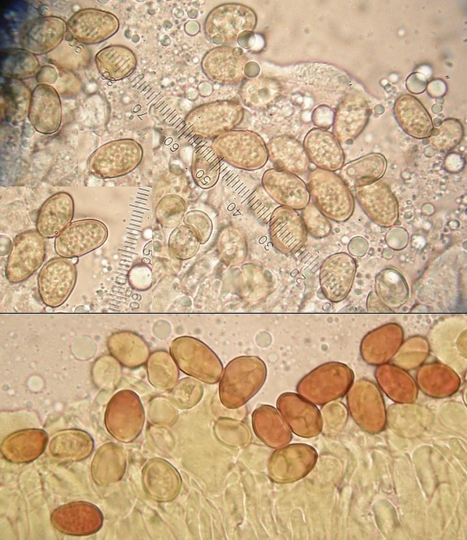 Die sind ja etwas pigmentiert, dazu auch leicht dickwandig. Allerdings: Wenn die dazu gehören, dann könnte das ein sehr junger Fruchtkörper einer Coniophora sein.