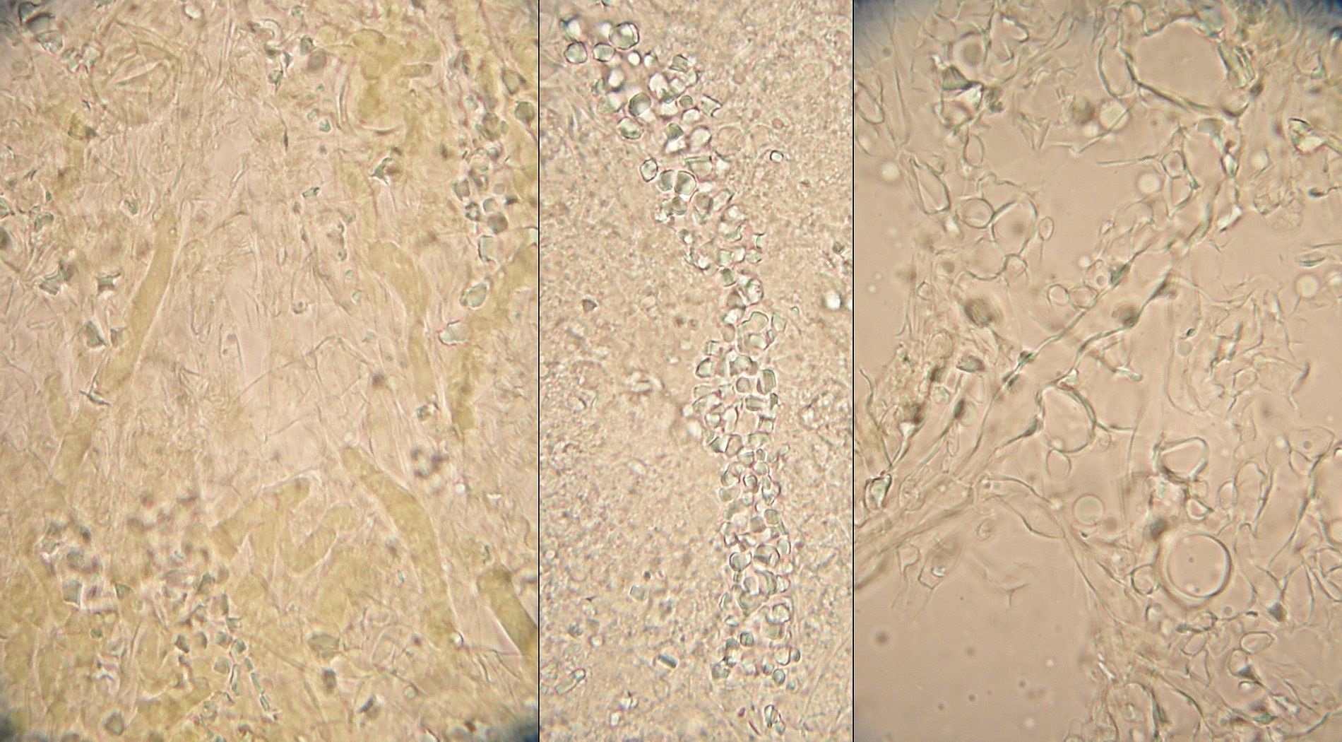 Ich hänge die Mikrofotos an, weißt du vielleicht, zu welcher pilzgattung diese dreizipfelige Spore gehört? Die ist sehr interessant.